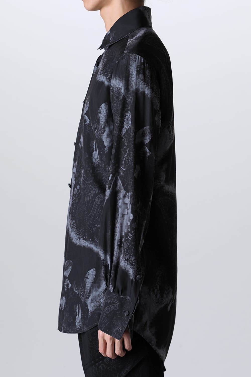 This regular shirt features a unique graphic print that blends paisley with kiryuyrik's iconic butterfly motif. The elegant design includes double cuffs on the sleeves, making it a piece that pairs well with tailored jackets.