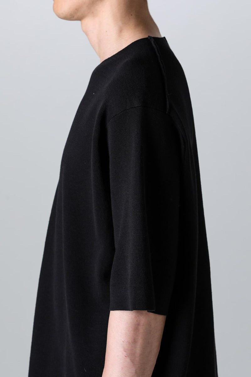 Short-sleeved knit in a loose fit. The sleeves are half-sleeved, the sleeves and hem are uncut, and the neck is treated to prevent stretching.