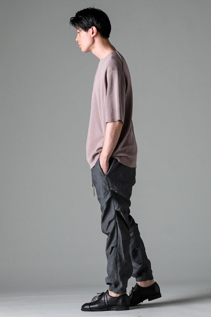 Short-sleeved knit in a loose fit. The sleeves are half-sleeved, the sleeves and hem are uncut, and the neck is treated to prevent stretching.