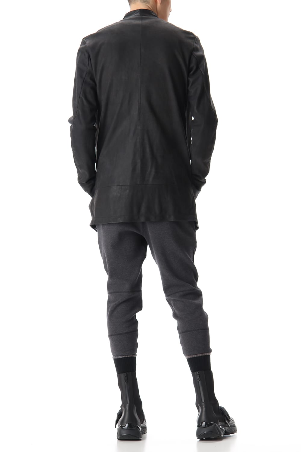 Zip leather cardigan made of sheepskin. The length of this jacket is slightly longer than that of the conventional leather cardigan. This item has been dyed with a light color and then scratched at random for a smoky finish.