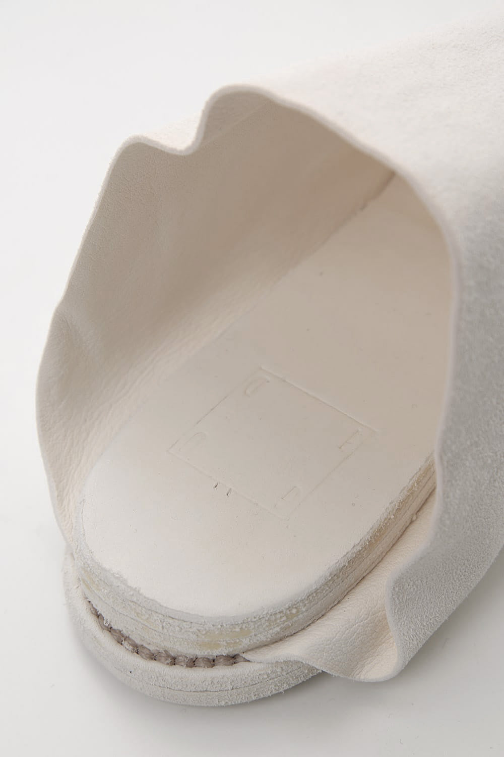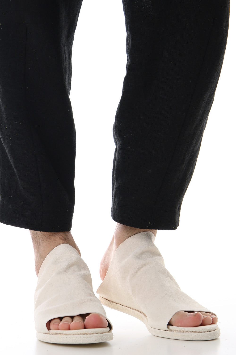 Leather open toe sandal with soft and lightweight kangaroo reverse leather. When worn, the upper part will be draped and the fit will improve each time you wear them. The refreshing white colour has a spring and summer atmosphere that gives it its charm.