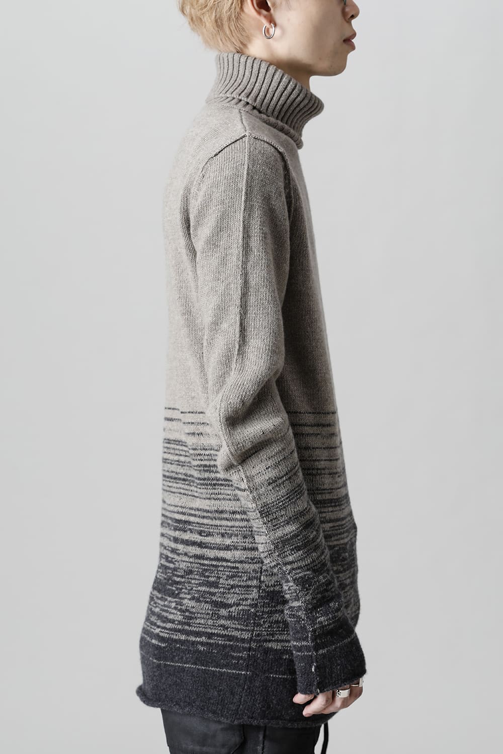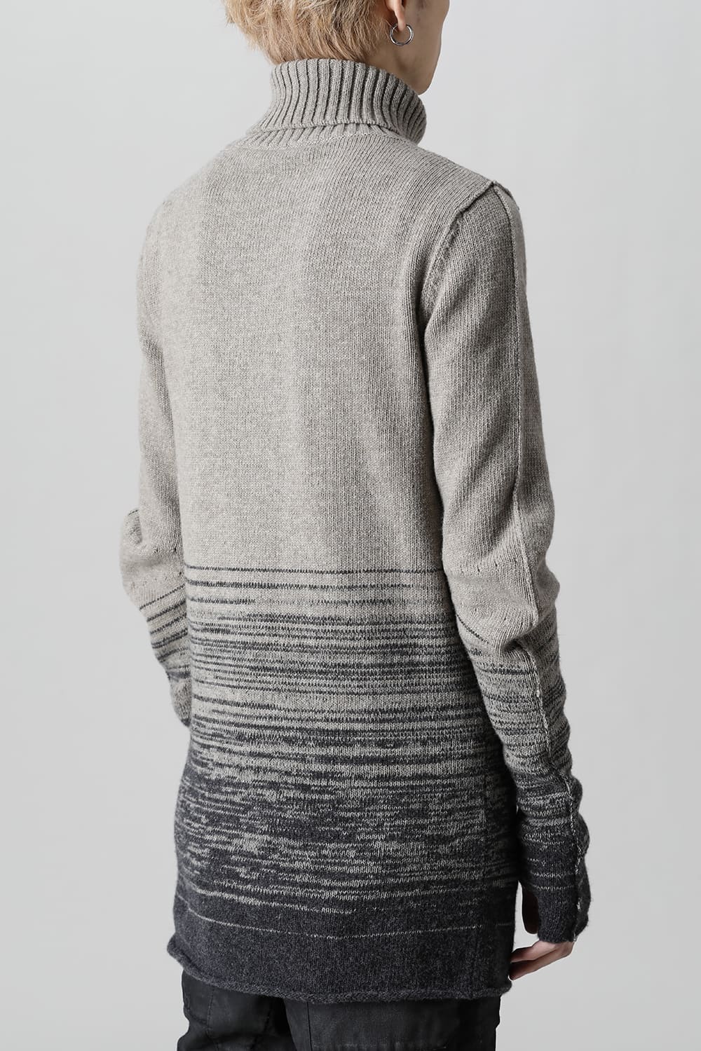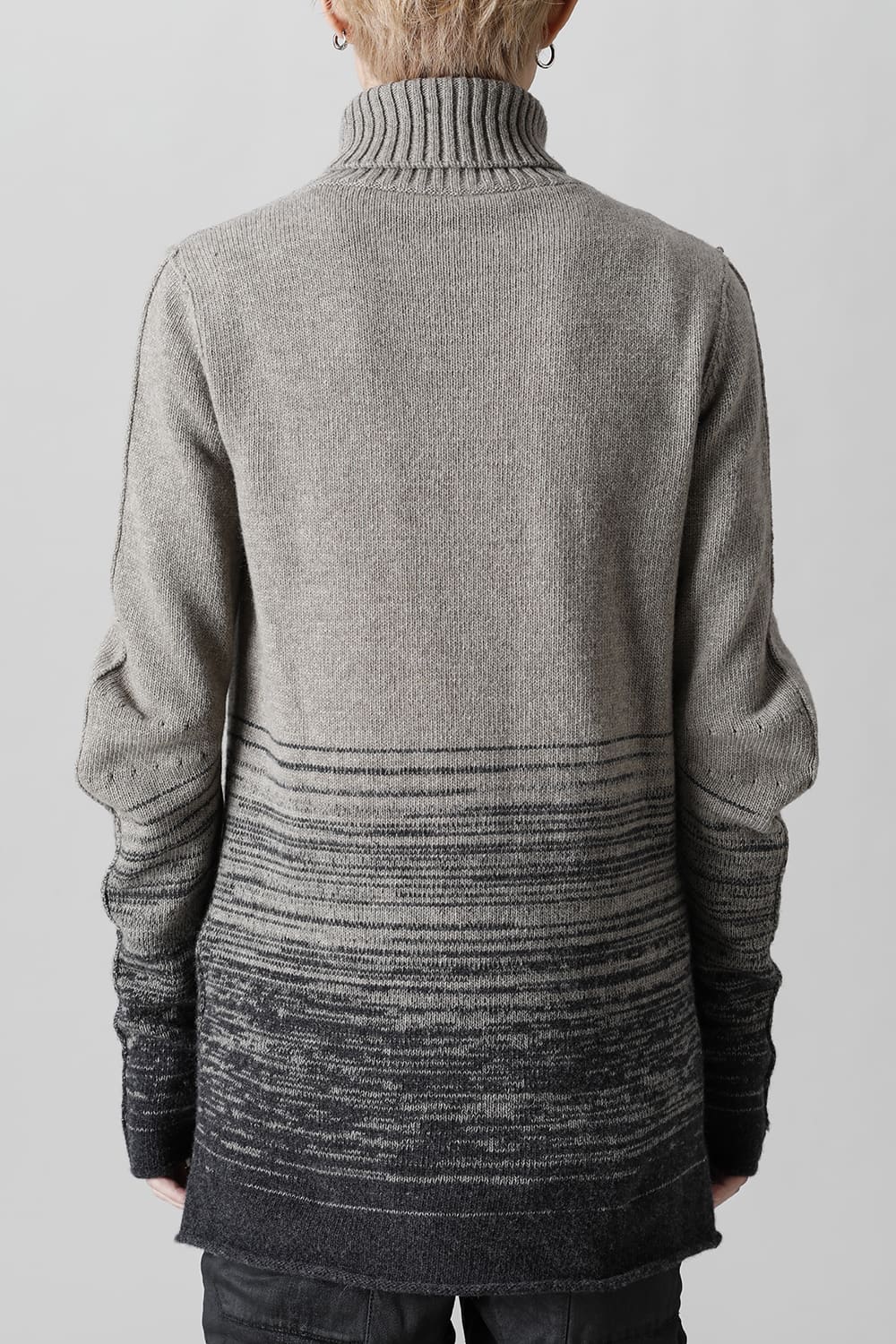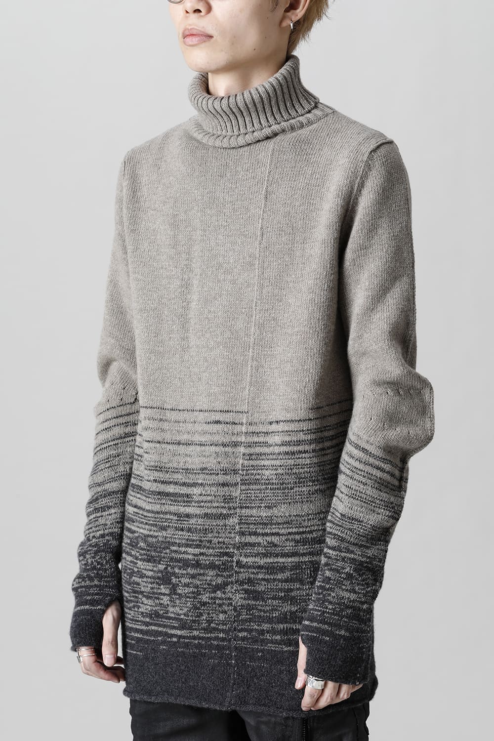 这款渐层高领针织衫使用了超细羊毛。 这款单品的衣身和袖子都较长,很有层次感。基于人体工程学设计的手臂曲线抑制了肘部弯曲和拉伸引起的脱落,卷起来的时候也可以很漂亮的收起来。 袖子的根部和去掉中间部分的正面缝合部的接缝线在表面上突起,为设计增添了亮点。罗纹设计为可反折的长版设计。 所使用的无绒超细羊毛全部采用手动编织机制作。 这款单品通过从中央开始的线状渐变,与黑色的下装搭配,显得十分柔和。