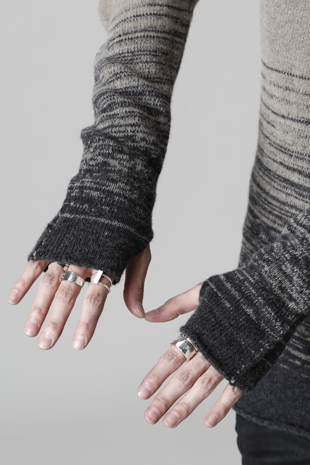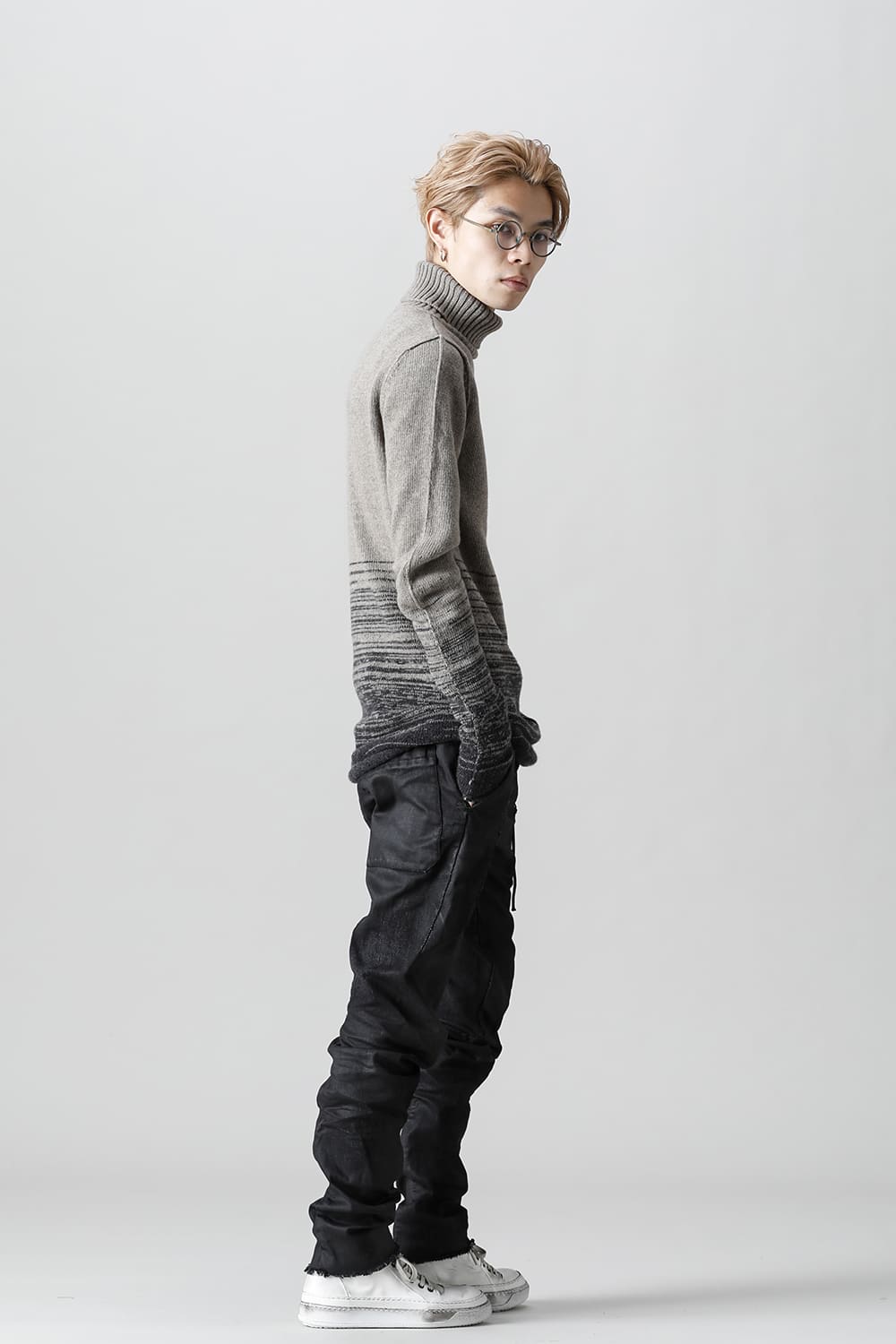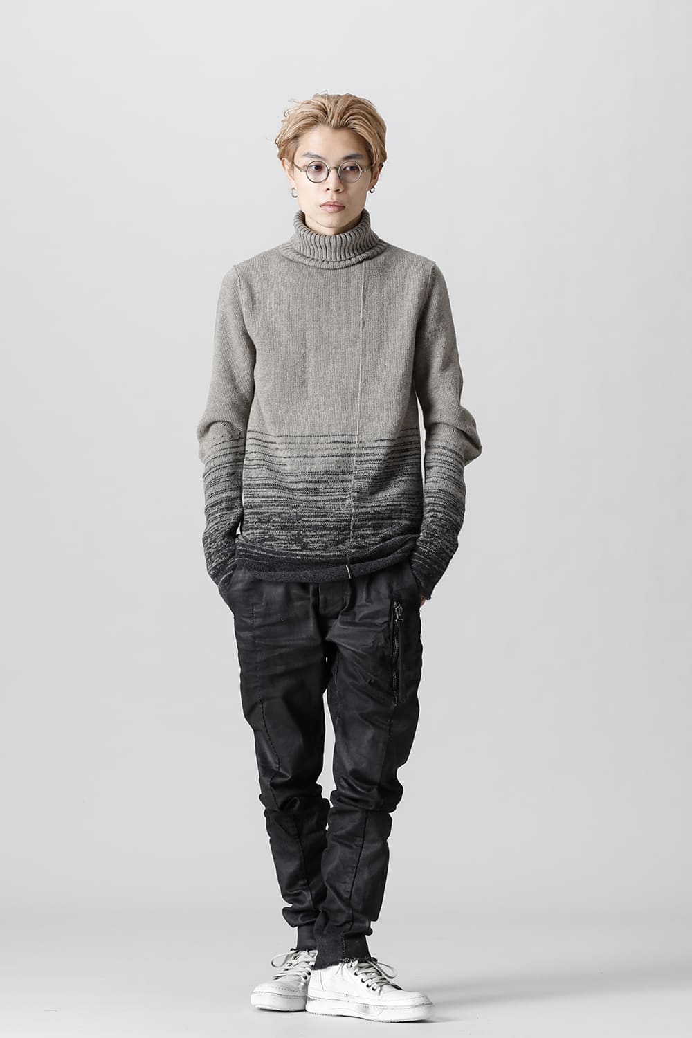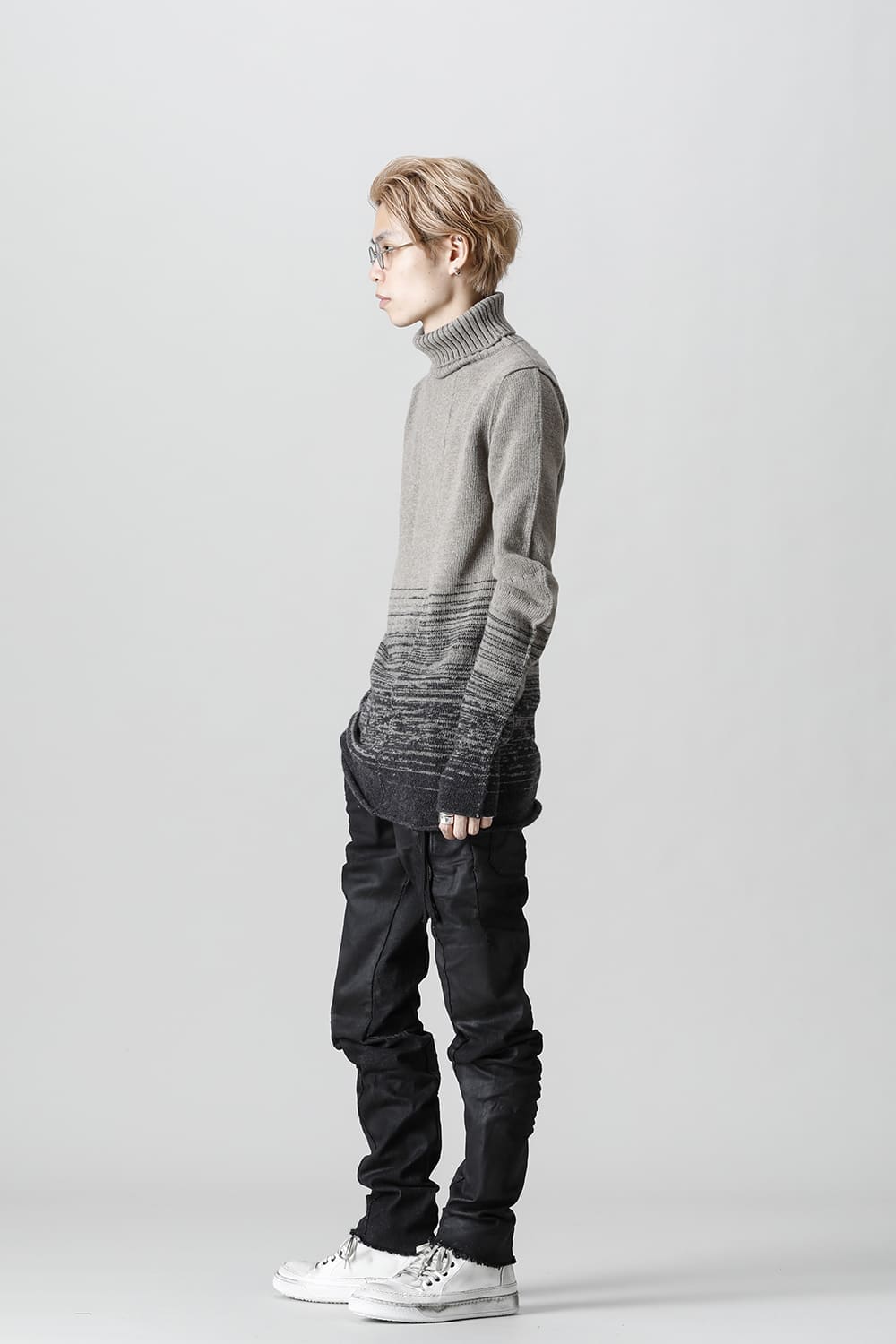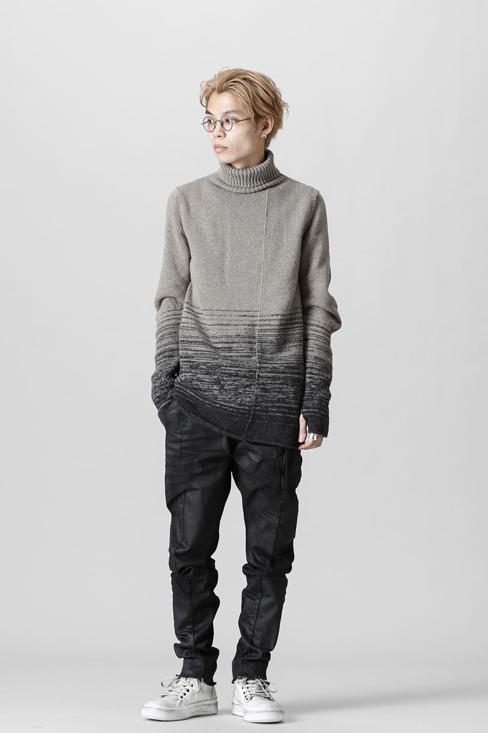 这款渐层高领针织衫使用了超细羊毛。 这款单品的衣身和袖子都较长,很有层次感。基于人体工程学设计的手臂曲线抑制了肘部弯曲和拉伸引起的脱落,卷起来的时候也可以很漂亮的收起来。 袖子的根部和去掉中间部分的正面缝合部的接缝线在表面上突起,为设计增添了亮点。罗纹设计为可反折的长版设计。 所使用的无绒超细羊毛全部采用手动编织机制作。 这款单品通过从中央开始的线状渐变,与黑色的下装搭配,显得十分柔和。