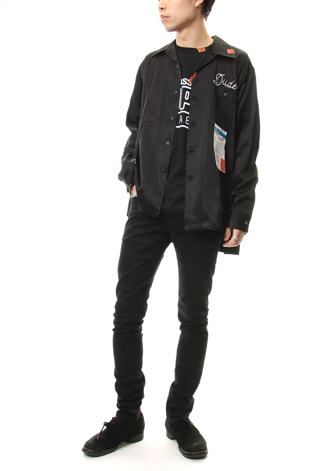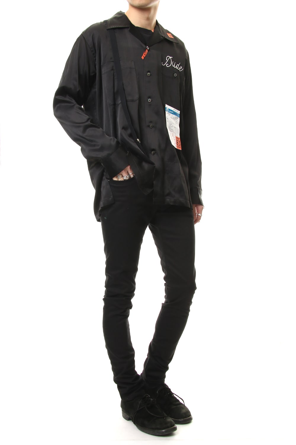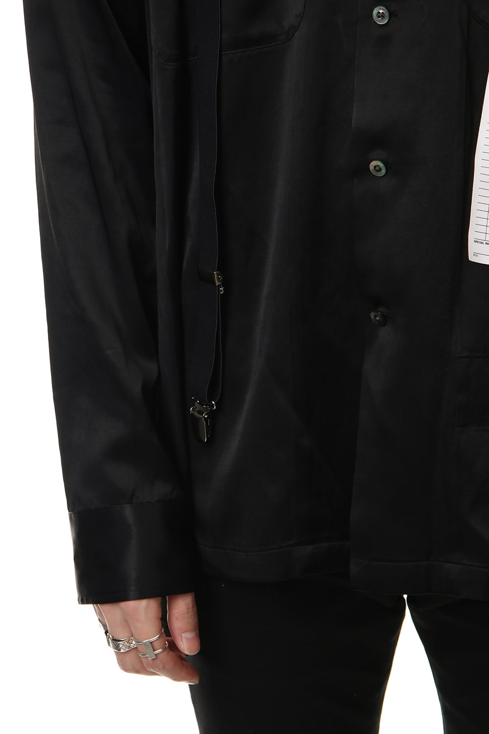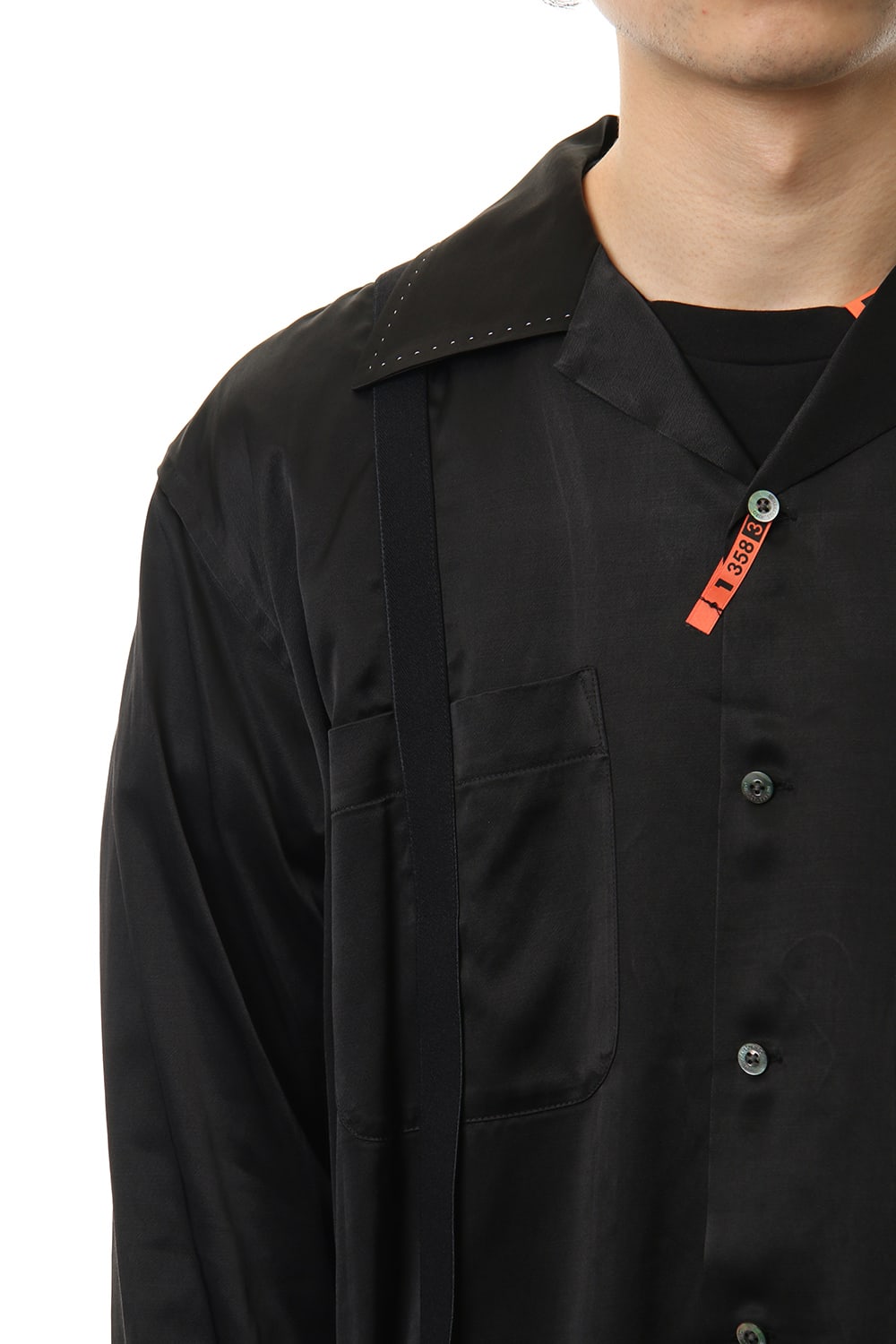 Shirt using soft rayon and cotton fabric Embroidery design on the back and left chest The design with suspenders are placed on the front and back of the right shoulder, it can be used as one point of styling Slightly relaxed oversized silhouette It has a playful design with the statement 358 wash tag attached to mimic the tags from the cleaners. ※ It is possible to wash with the tags attached, if you dislike it, it is also possible to remove.