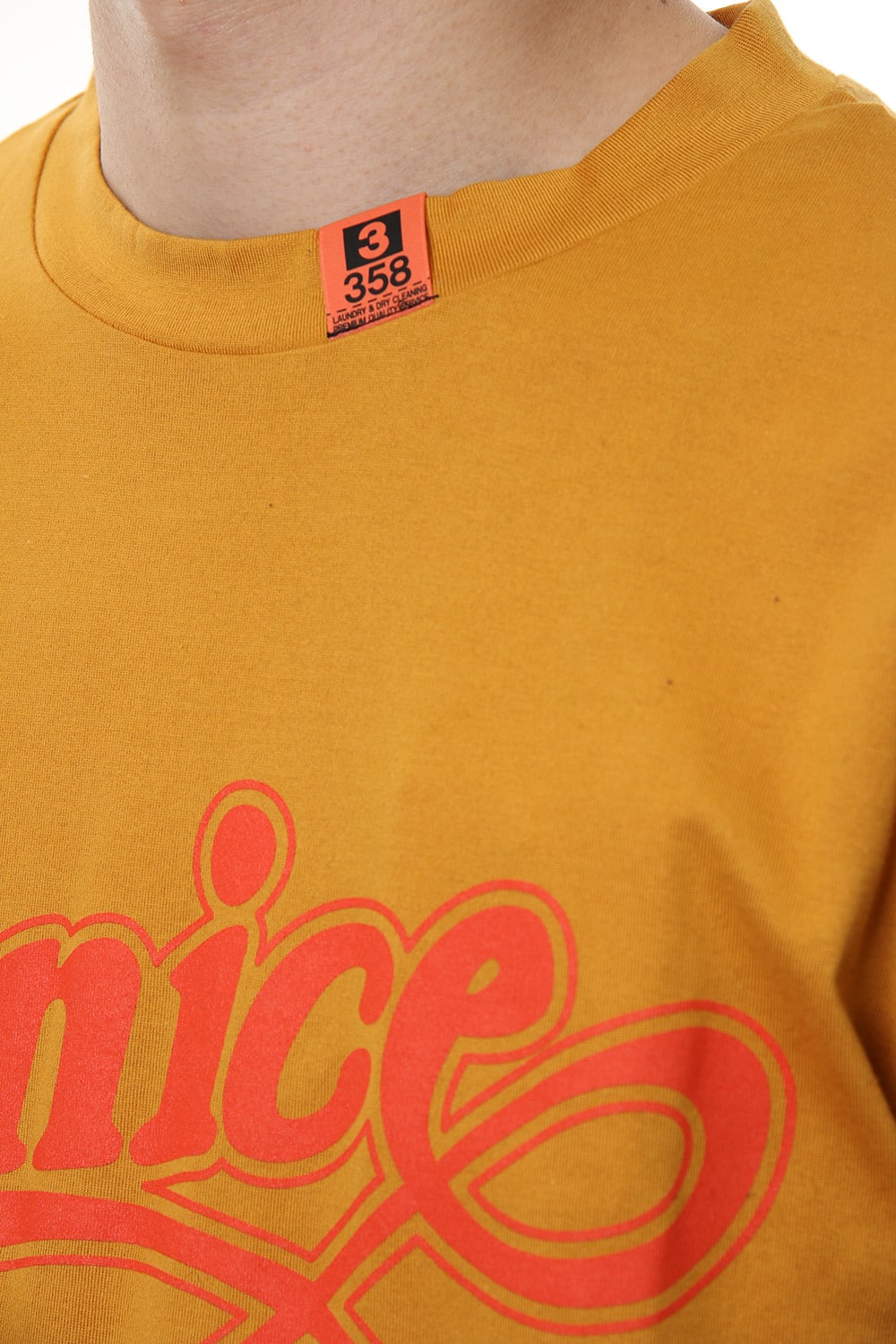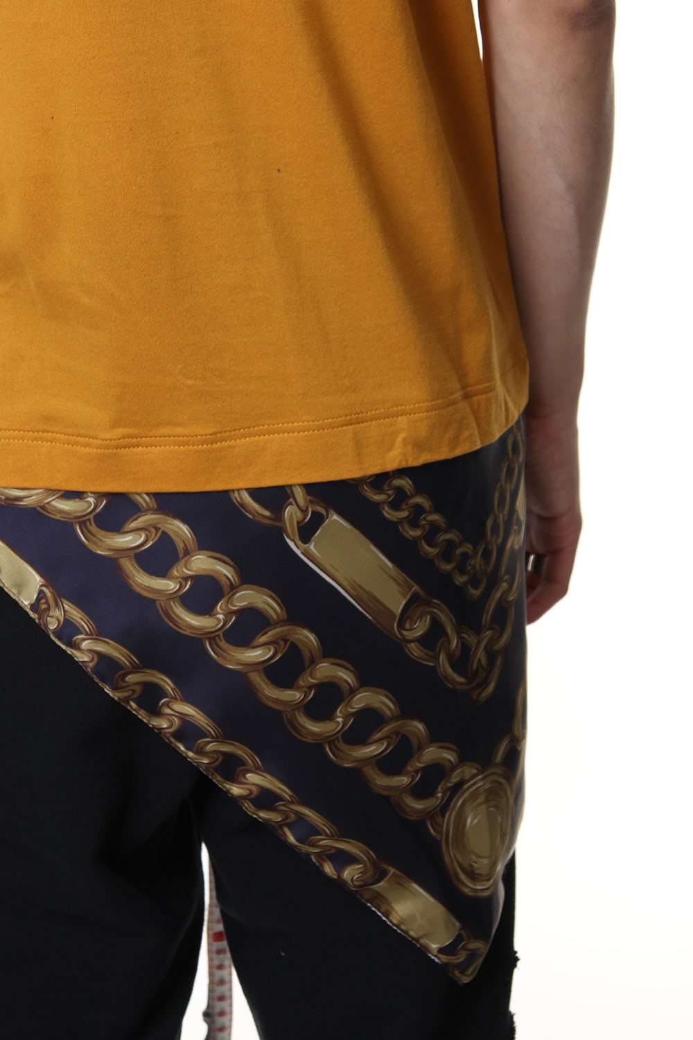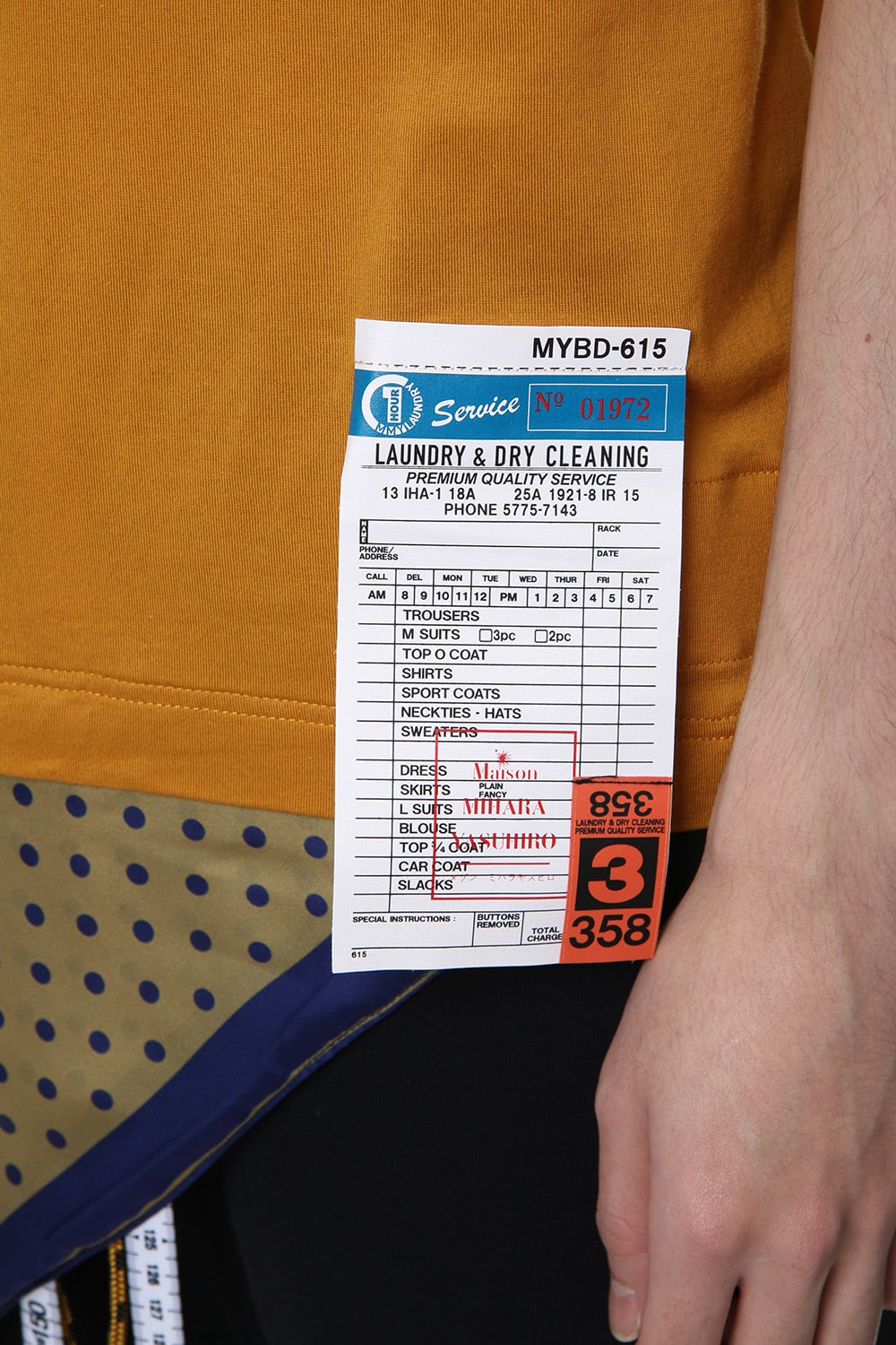 Design T-shirt with layered scarf of two different designs on the hem. (※ not removable) Regular silhouette. It has a playful design with the statement 358 wash tag attached to mimic the tags from the cleaners. ※ It is possible to wash with the tags attached, if you dislike it, it is also possible to remove.