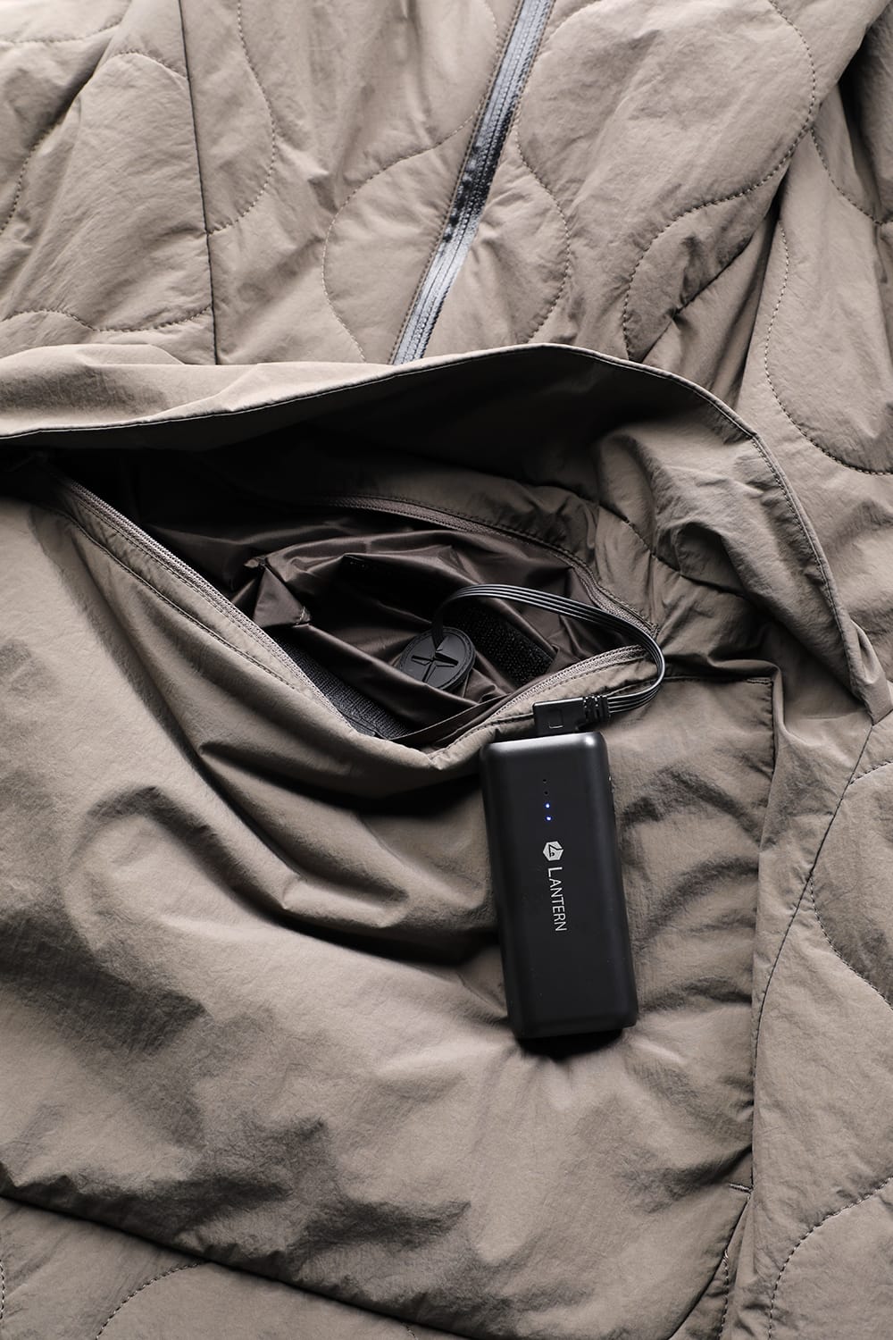 胸部的电源温度调节开关可以调节温度的一款棉服。加热设备是通过将充电电池连接到USB插头来运行的系统,并且开关的颜色根据设定温度而变化。作为热源的加热盘是由碳纤维制成的,通过远红外线效果从身体内部加热。加热设备的工作时间会根据充电电池容量和设定温度而变化。◆什么是加热设备?