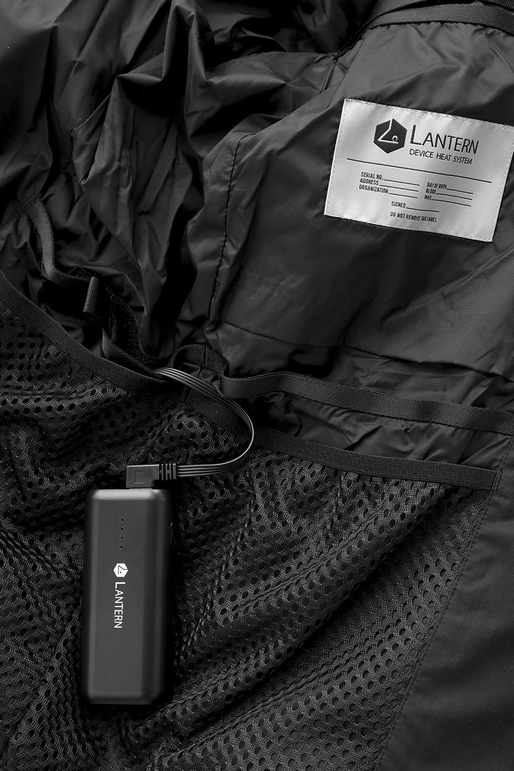 It is cotton padding wear that can adjust the temperature with the power supply temperature adjustment switch on the left sleeve. The heating device is a system that works by connecting the charging battery to the USB plug of the machine, and the switch changes color depending on the set temperature. The heat source is made from carbon fiber, and it warms from the core of the body by far-infrared ray effect. The operating time of the heating device varies depending on the battery capacity and temperature setting.
