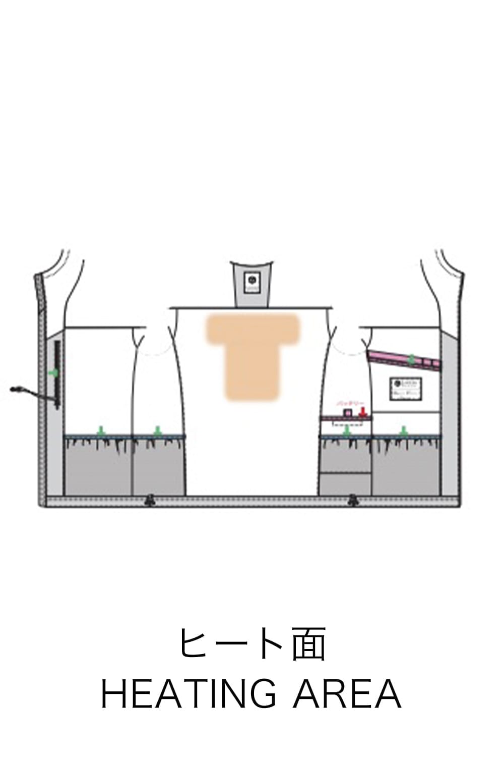 It is cotton padding wear that can adjust the temperature with the power supply temperature adjustment switch on the left sleeve. The heating device is a system that works by connecting the charging battery to the USB plug of the machine, and the switch changes color depending on the set temperature. The heat source is made from carbon fiber, and it warms from the core of the body by far-infrared ray effect. The operating time of the heating device varies depending on the battery capacity and temperature setting.