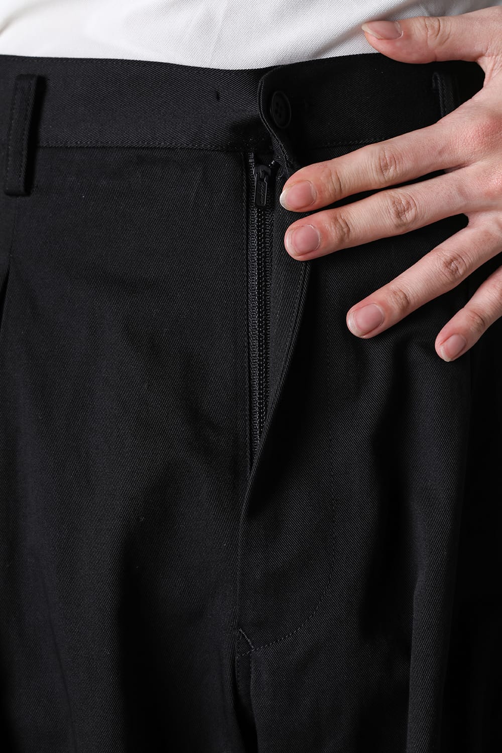 这款工装裤的特色在于前后各采用了6条褶皱设计的12条褶皱的大胆样式。