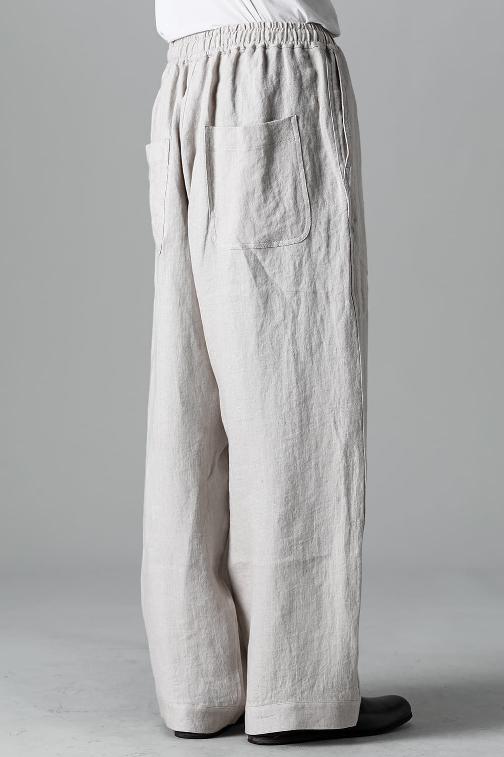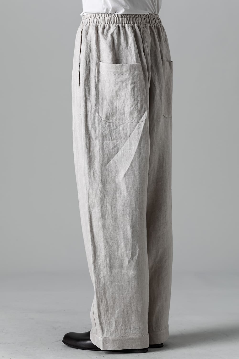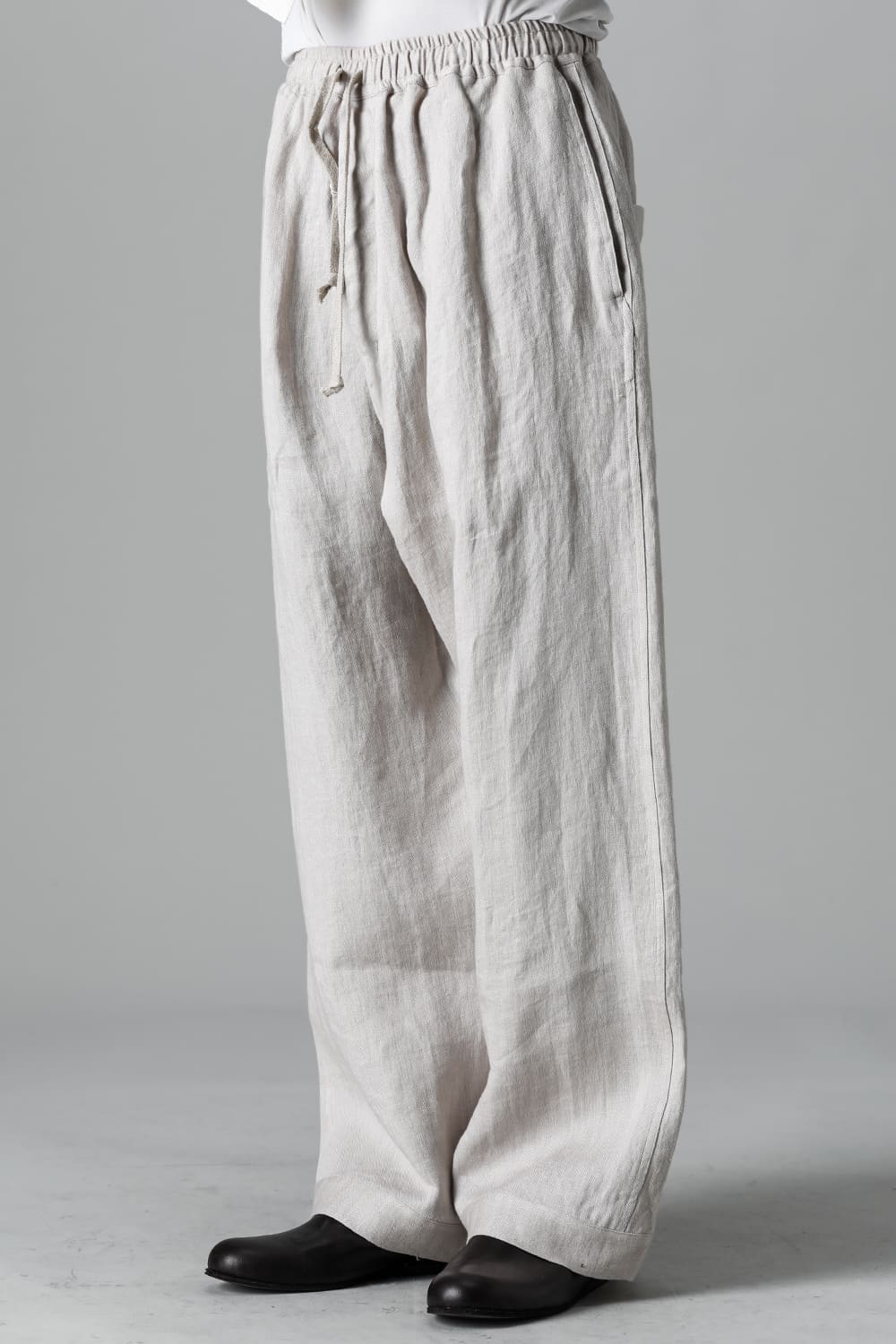 Full-length wide pants with drawstring waist elastic, which is rare in O project. This item is made of a linen herringbone fabric. The elastic fabric that bounces while the core remains as you wear it. By combining with rough and compact shoes such as sandals or slip-on shoes, you can create a light spring-summer-like footwear with full length.