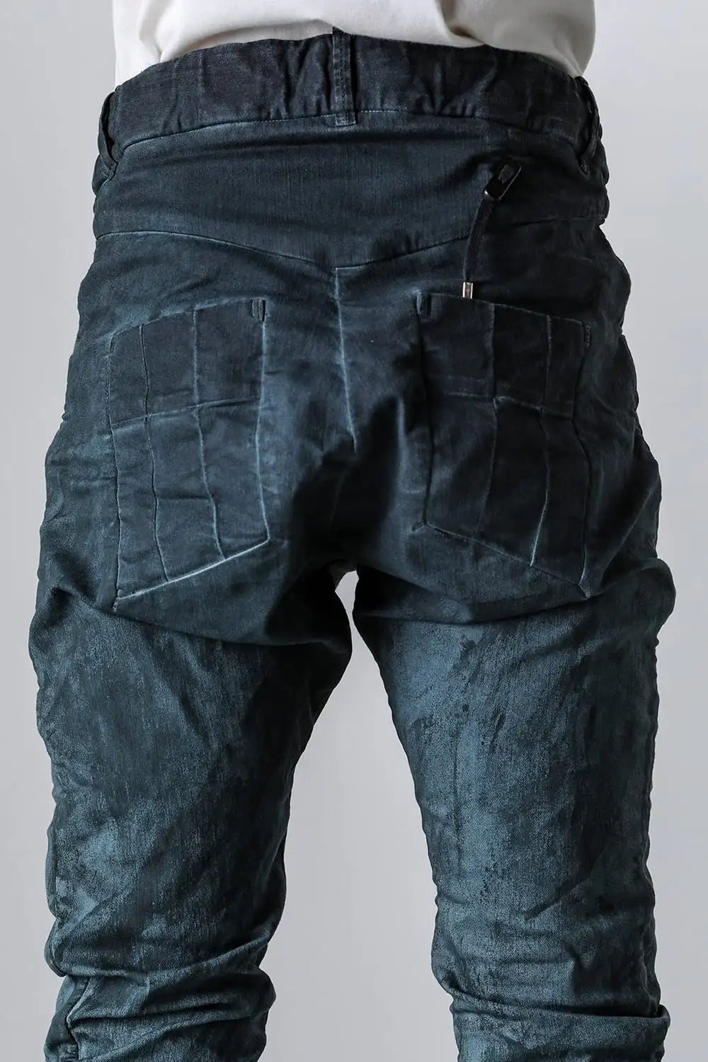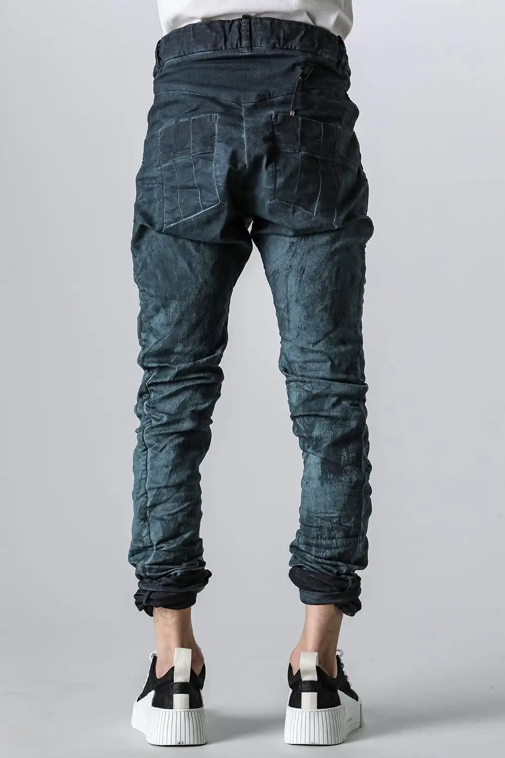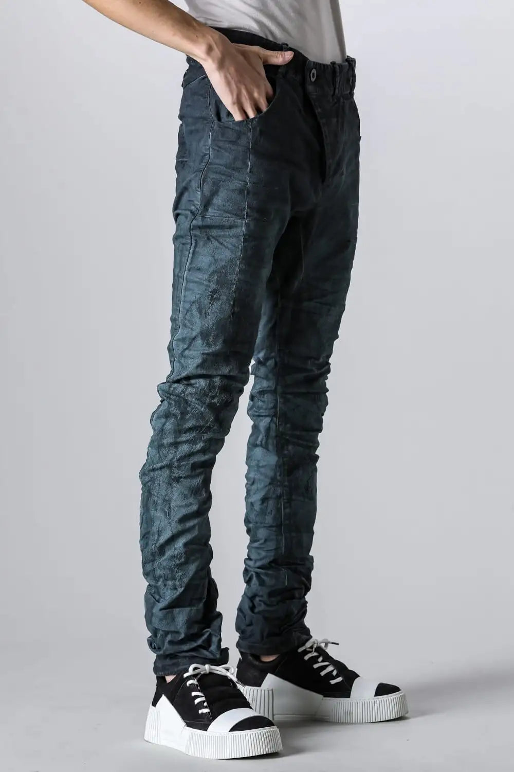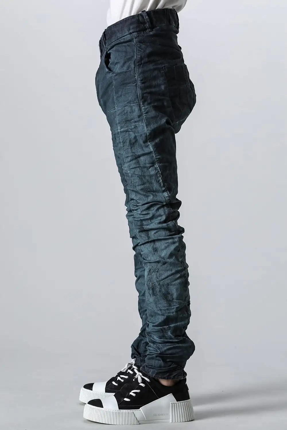 Featuring an unconventional drop-crotch silhouette with a slightly longer rise on the hip side and deliberately extended length, the pants create a flattering effect with wrinkling at the knees through three-dimensional shaping.