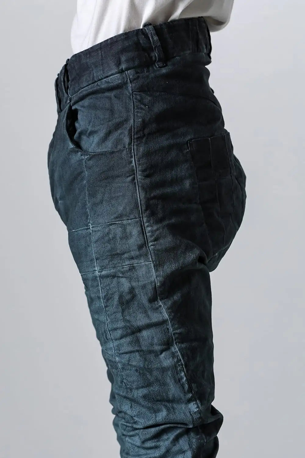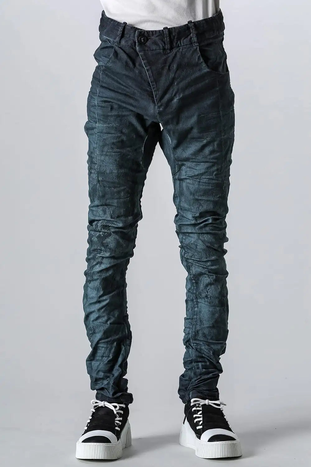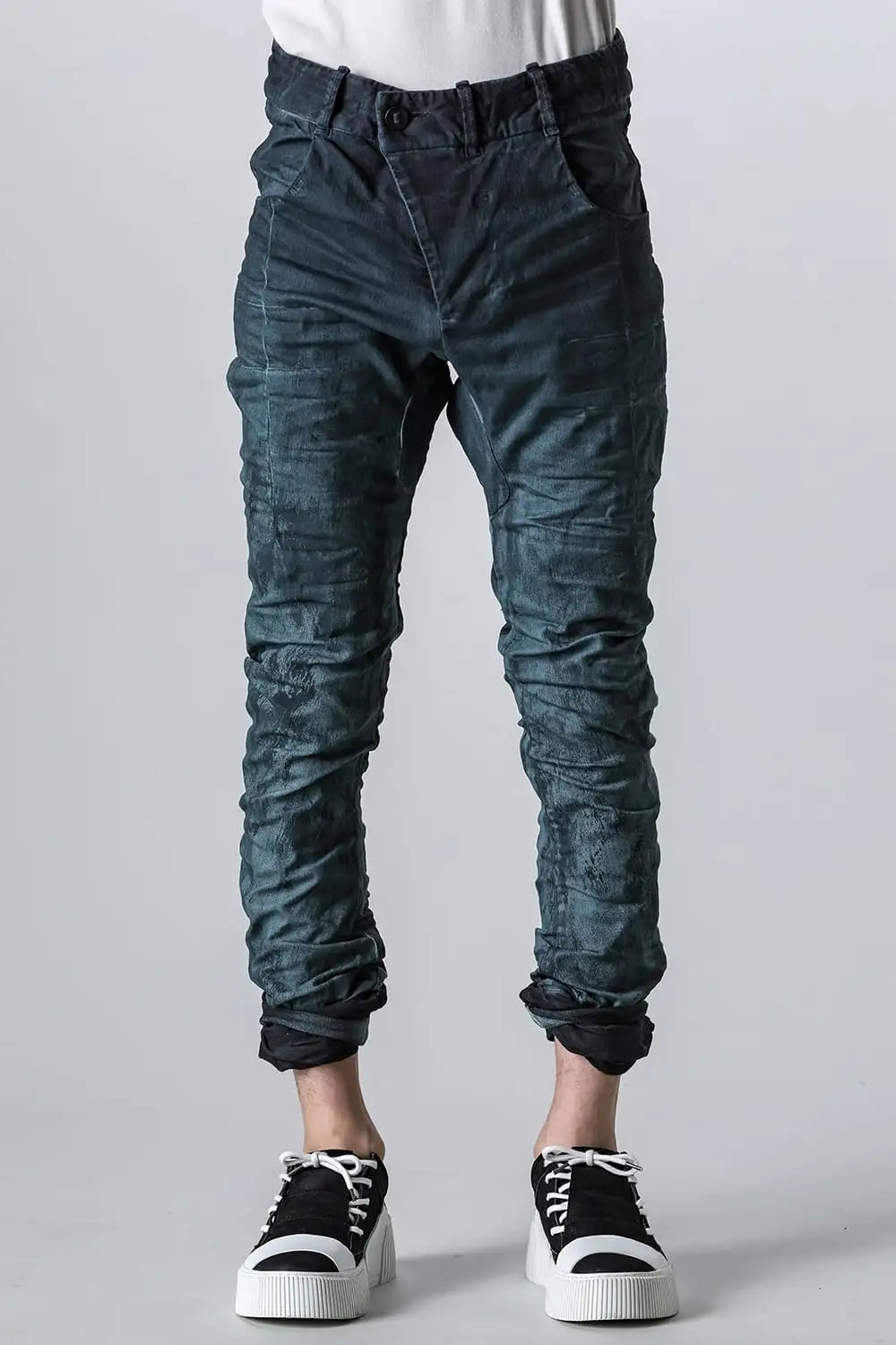 Featuring an unconventional drop-crotch silhouette with a slightly longer rise on the hip side and deliberately extended length, the pants create a flattering effect with wrinkling at the knees through three-dimensional shaping.
