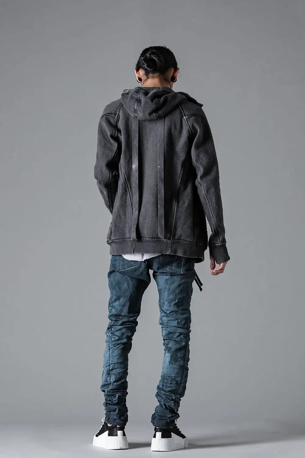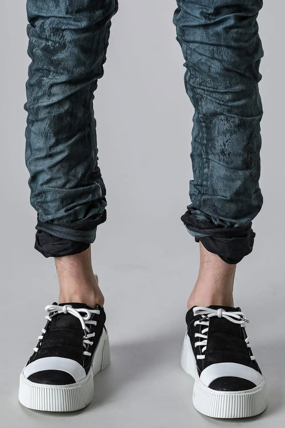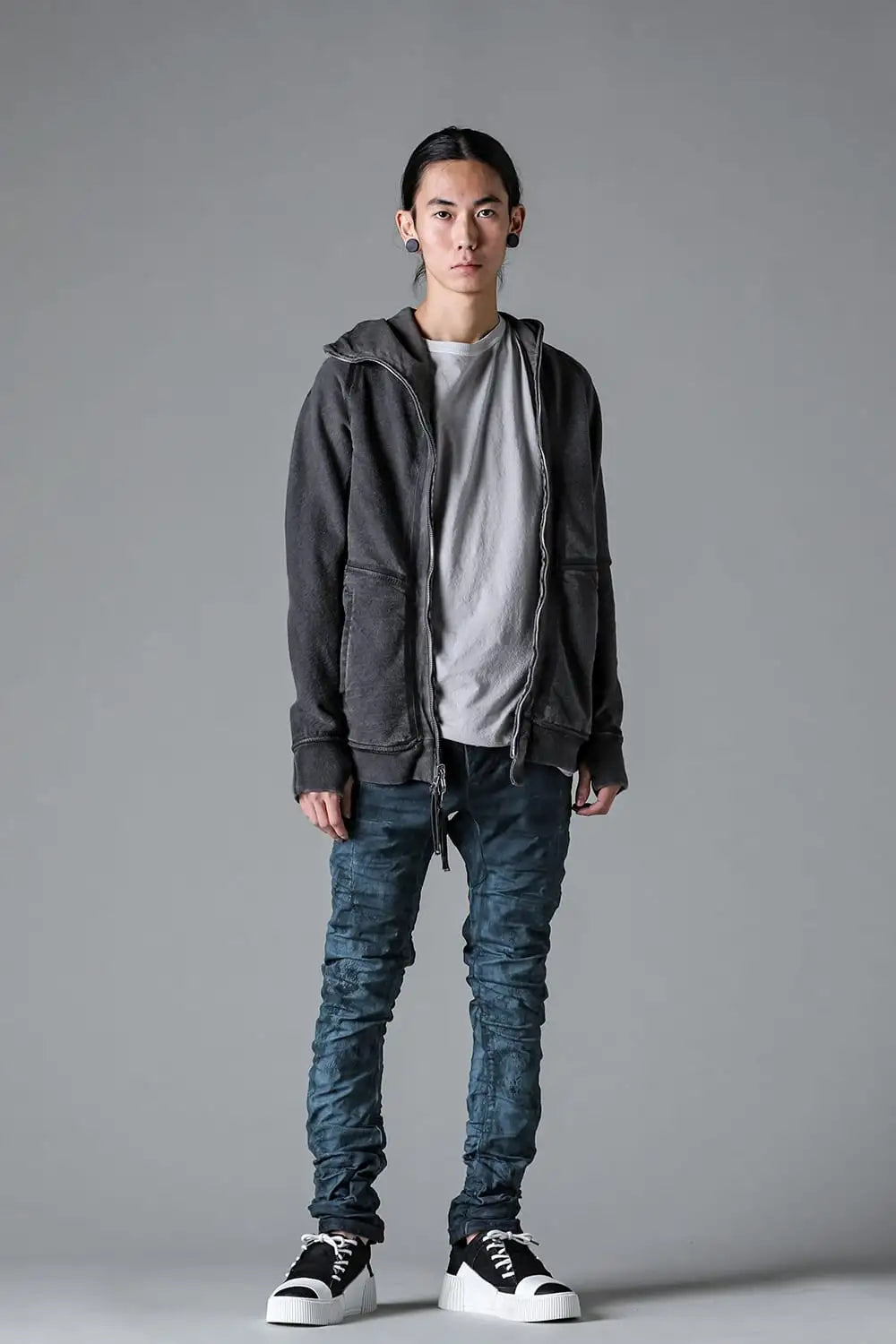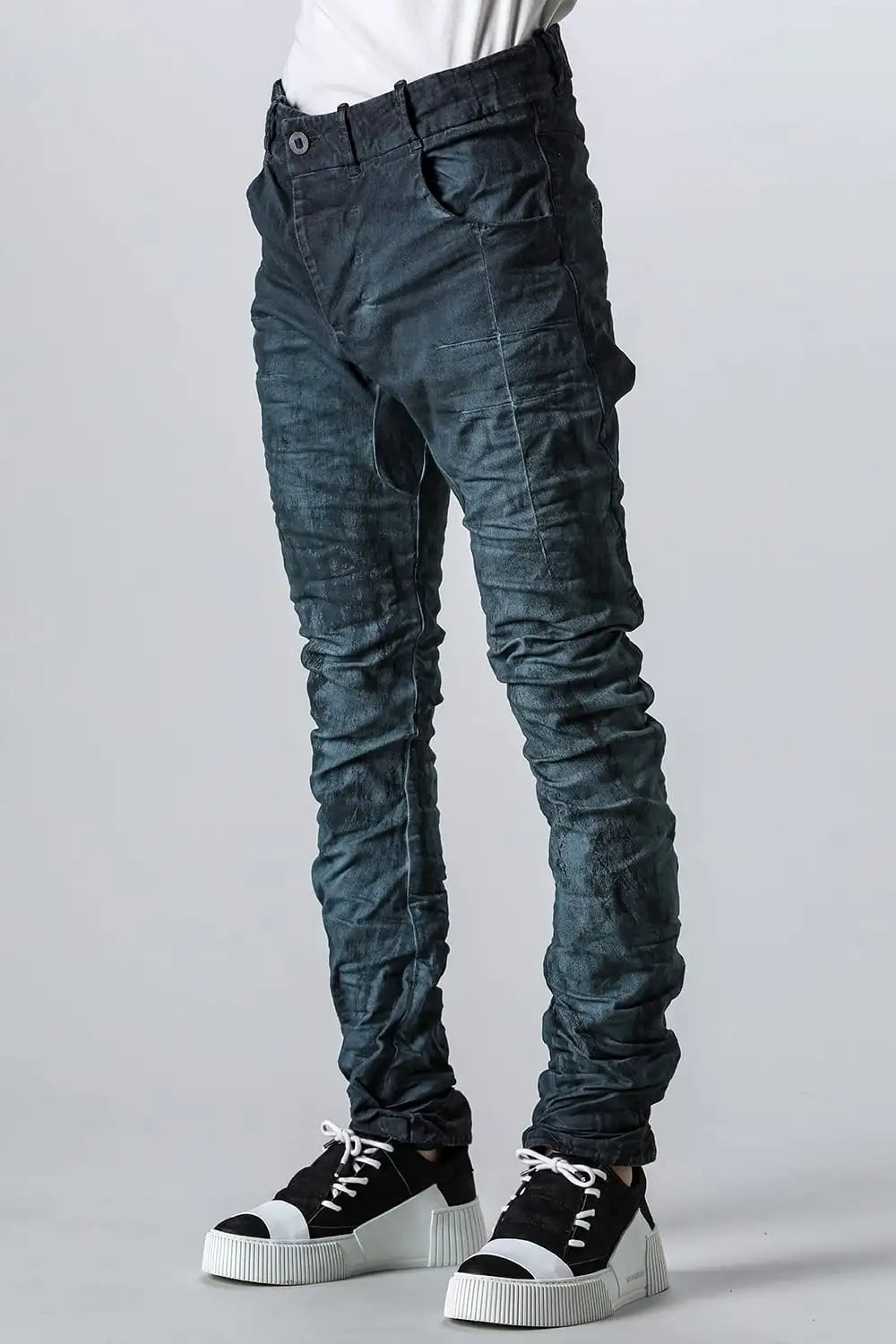 Featuring an unconventional drop-crotch silhouette with a slightly longer rise on the hip side and deliberately extended length, the pants create a flattering effect with wrinkling at the knees through three-dimensional shaping.