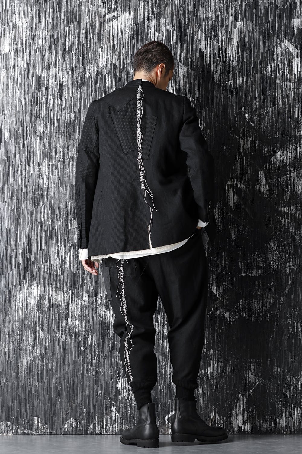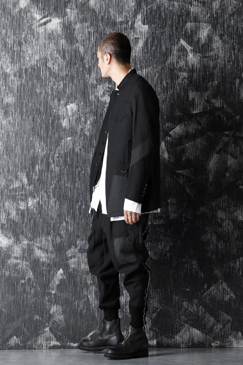 Based on one of the stage costumes made for JUAN's "III", this jacket was brushed up into a design that can be worn in everyday life. The design is a patchwork of two types of original plain and striped fabric with the "DUELLUM" logo woven into the ears and several types of dead stock suit fabric. The lining is a wrinkled, generous typewriter, the interior pockets are striped and the lining of the sleeves are striped cupra. It comes with a removable harness on the back and can be carried on your back without going through the sleeves. The back center joins the left and right sides of different materials and is hand stitched. The front 7-button stand collar is designed with a "classic" and "abstract" image.