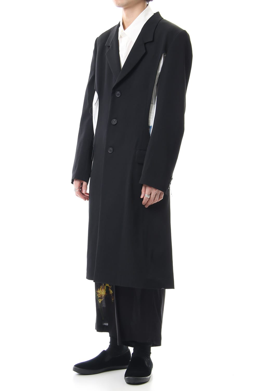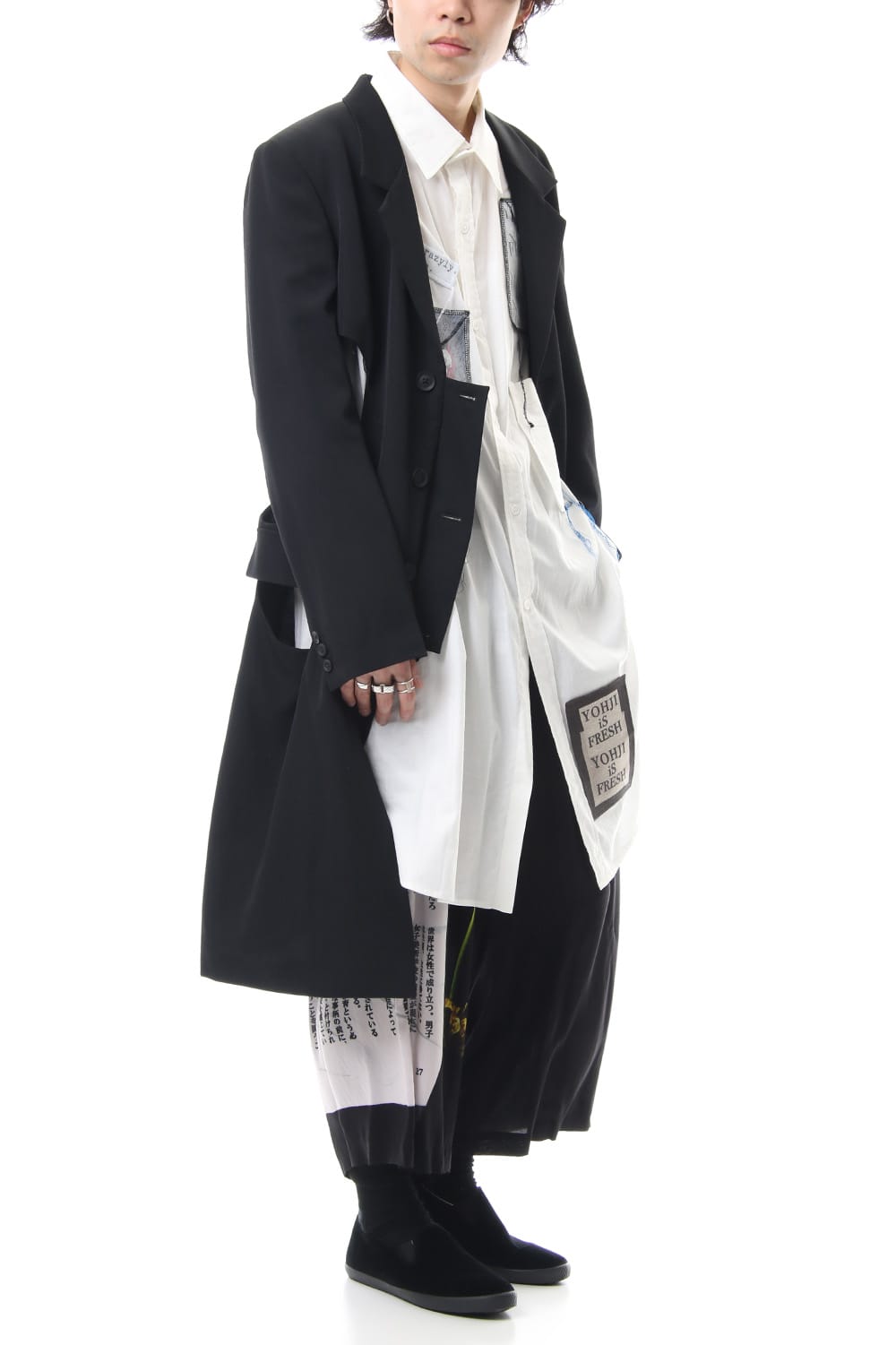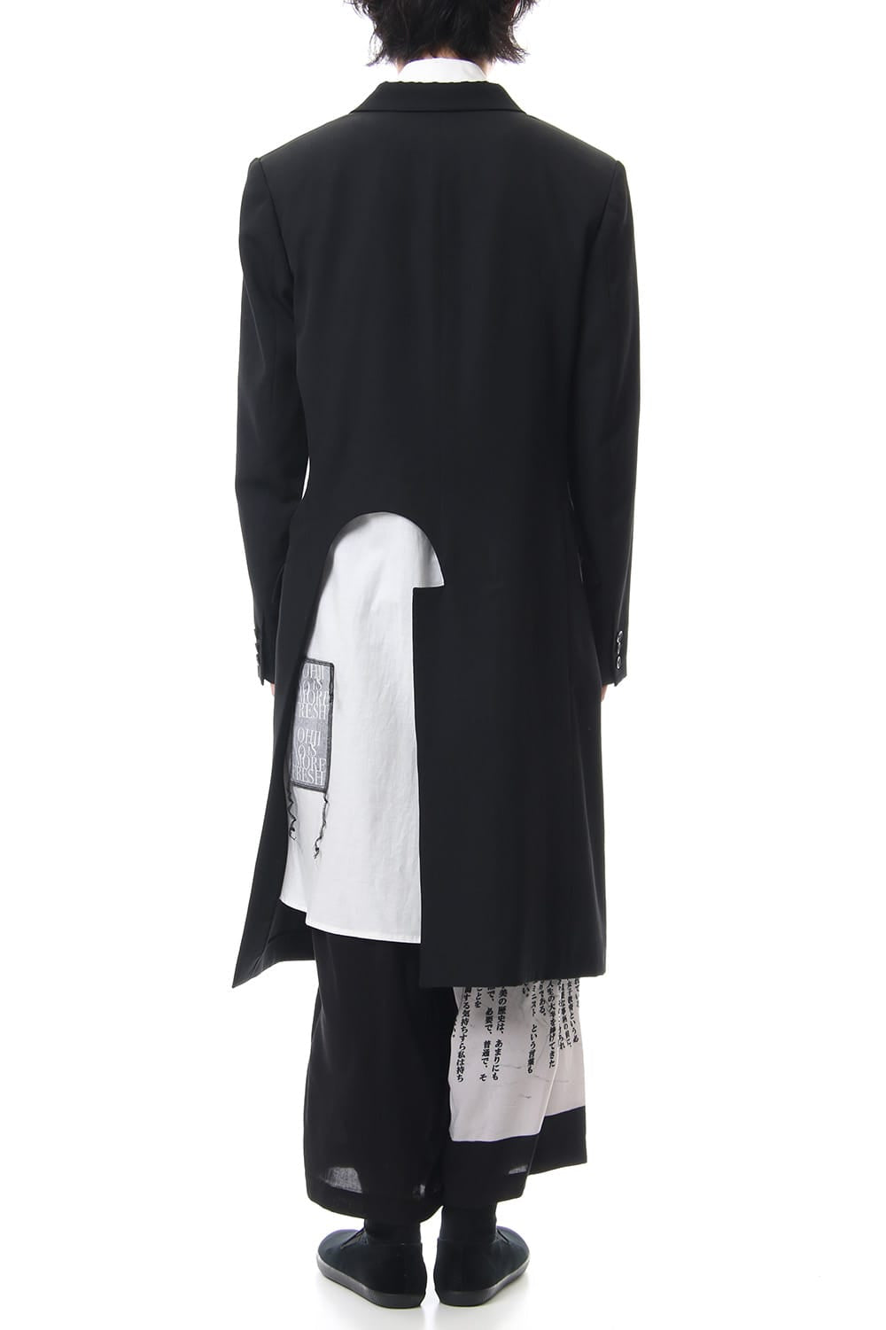 The jacket has a distinctive design that cuts out parts at random and is based on the long jacket worn during the Runway LOOK 4. It is one of the recommended wearing styles when paired with the patch work design shirt.