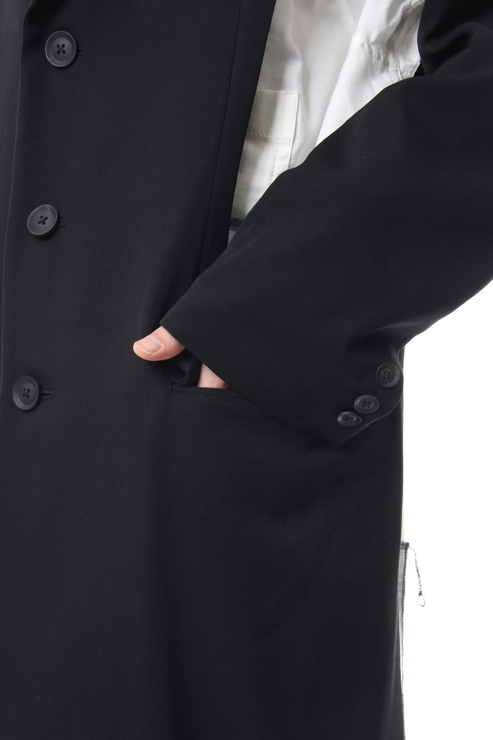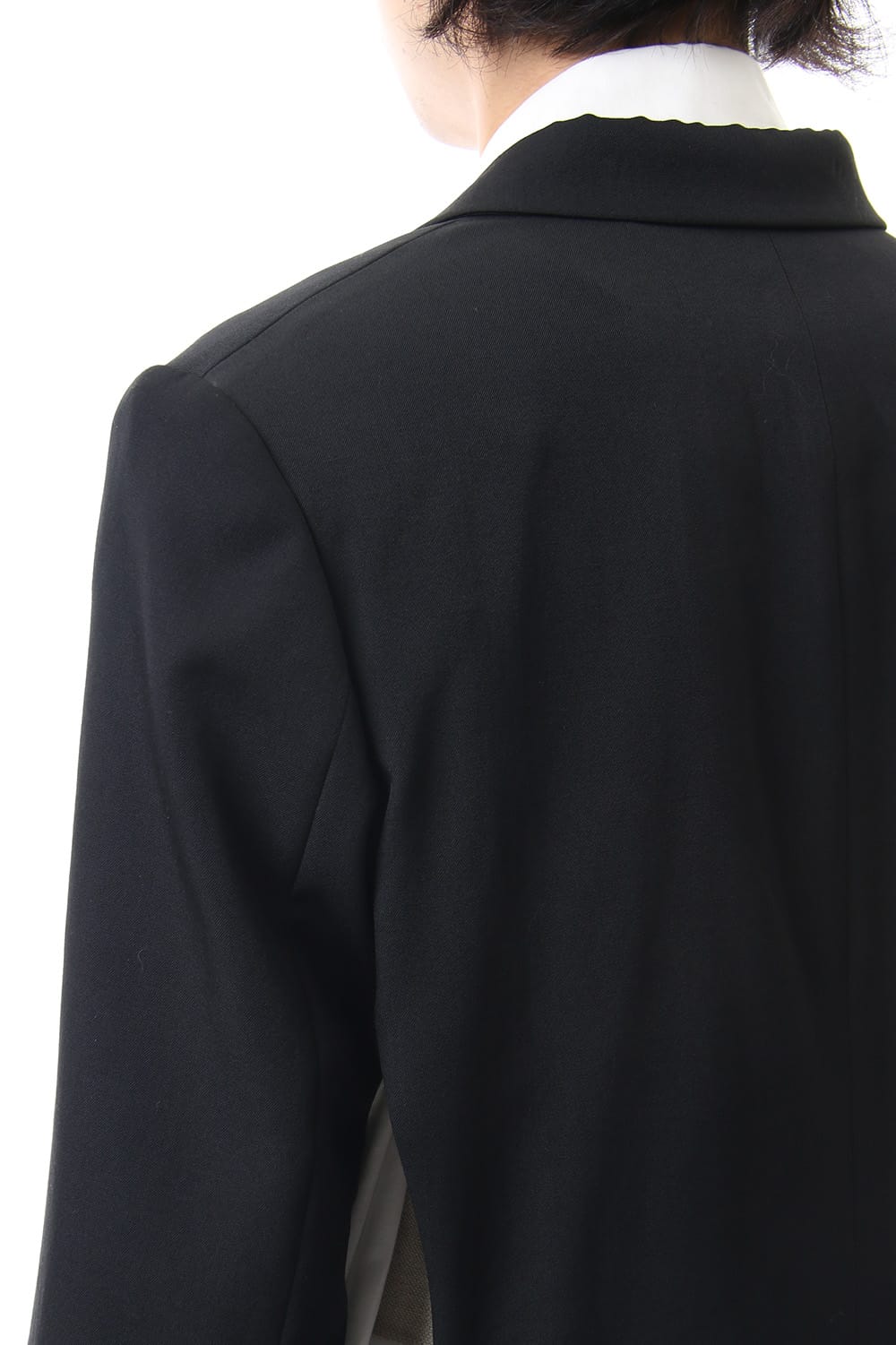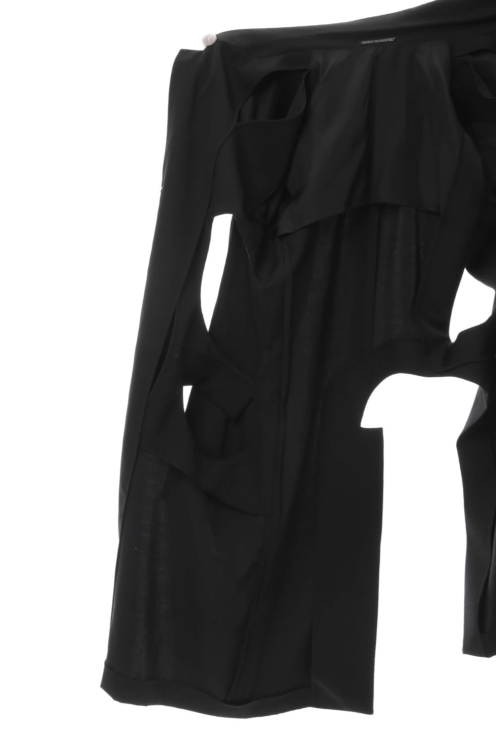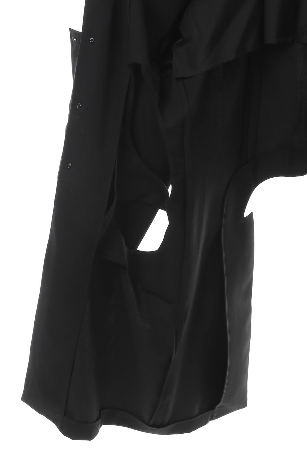The jacket has a distinctive design that cuts out parts at random and is based on the long jacket worn during the Runway LOOK 4. It is one of the recommended wearing styles when paired with the patch work design shirt.