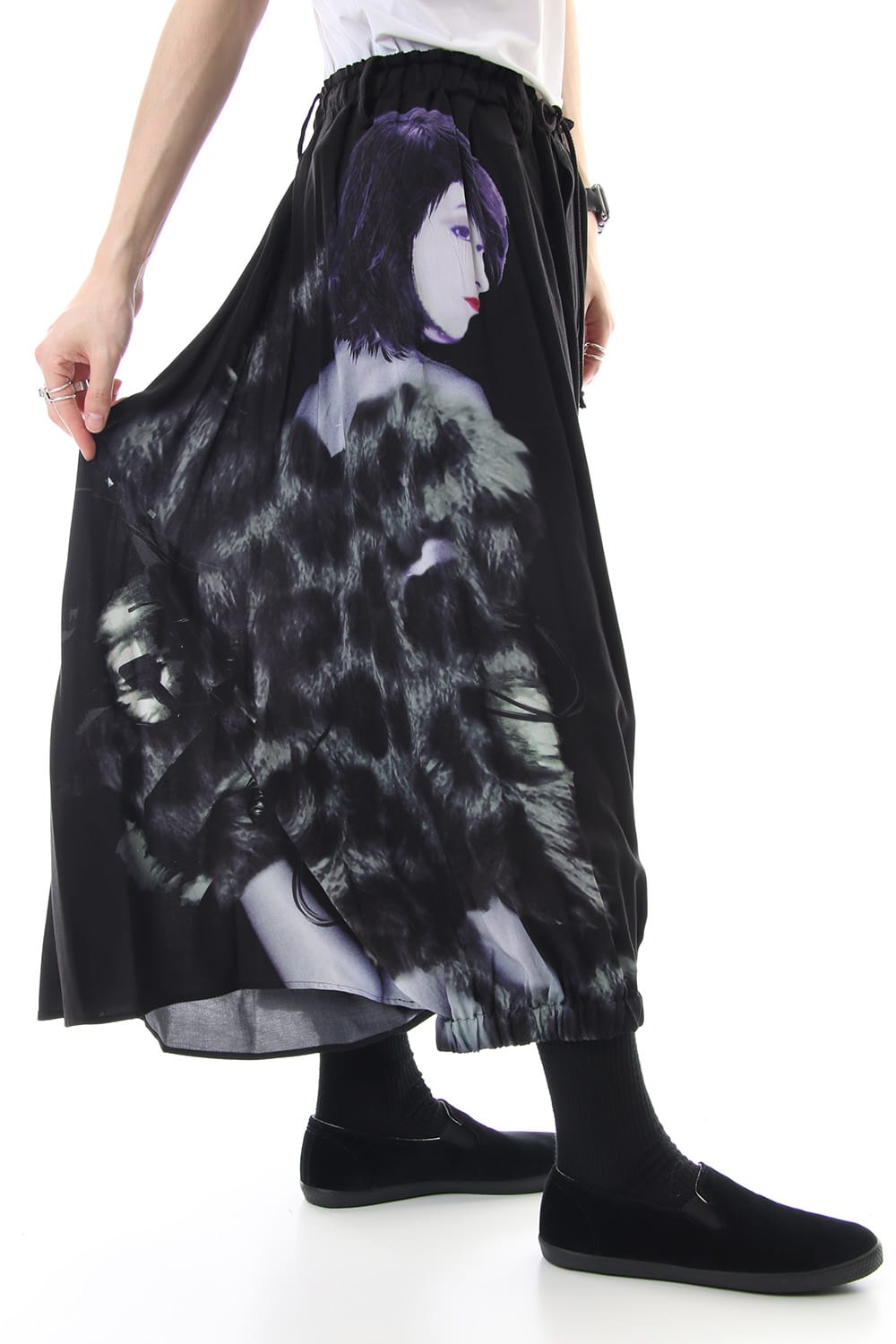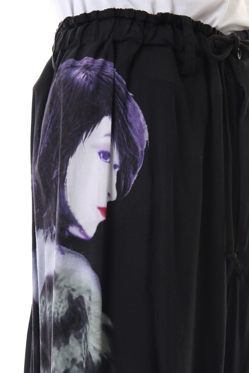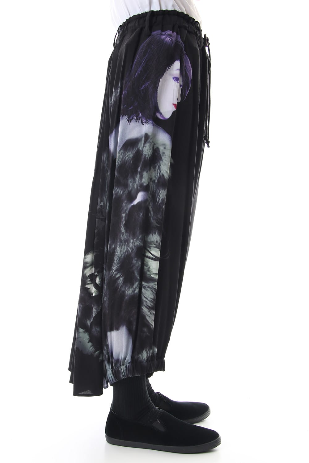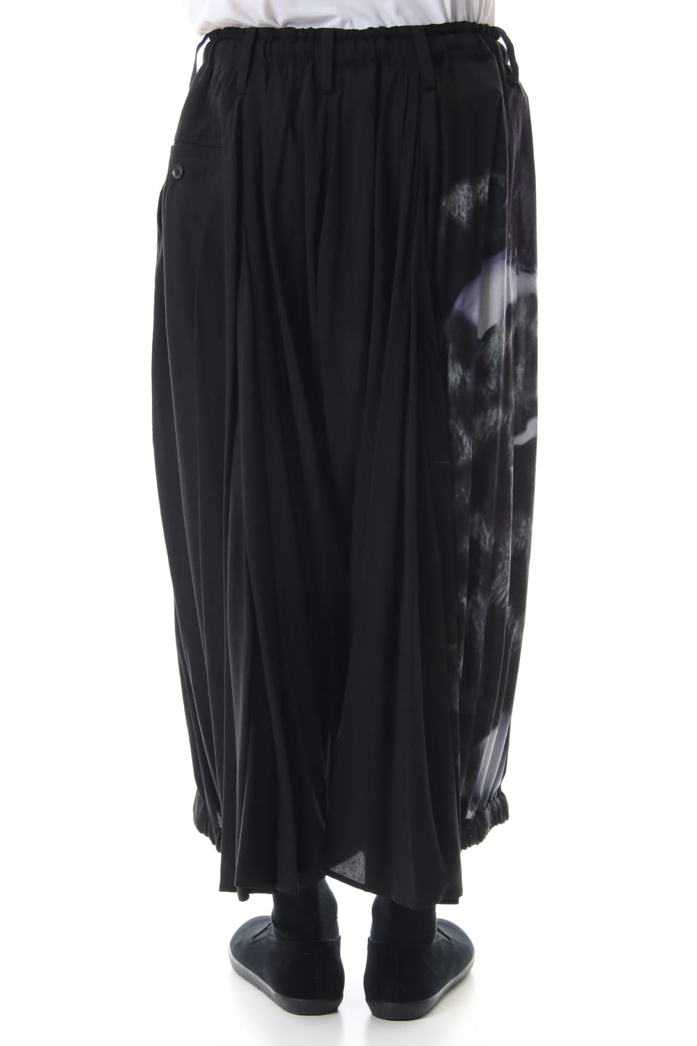 Crow pants with a woman print on the right side that was worn during the Runway LOOK 34. The crow pants were re-developed from the 19SS season, it has a unique shape that has voluminous fabric on the back that allows the pants to move beautifully when walking.
