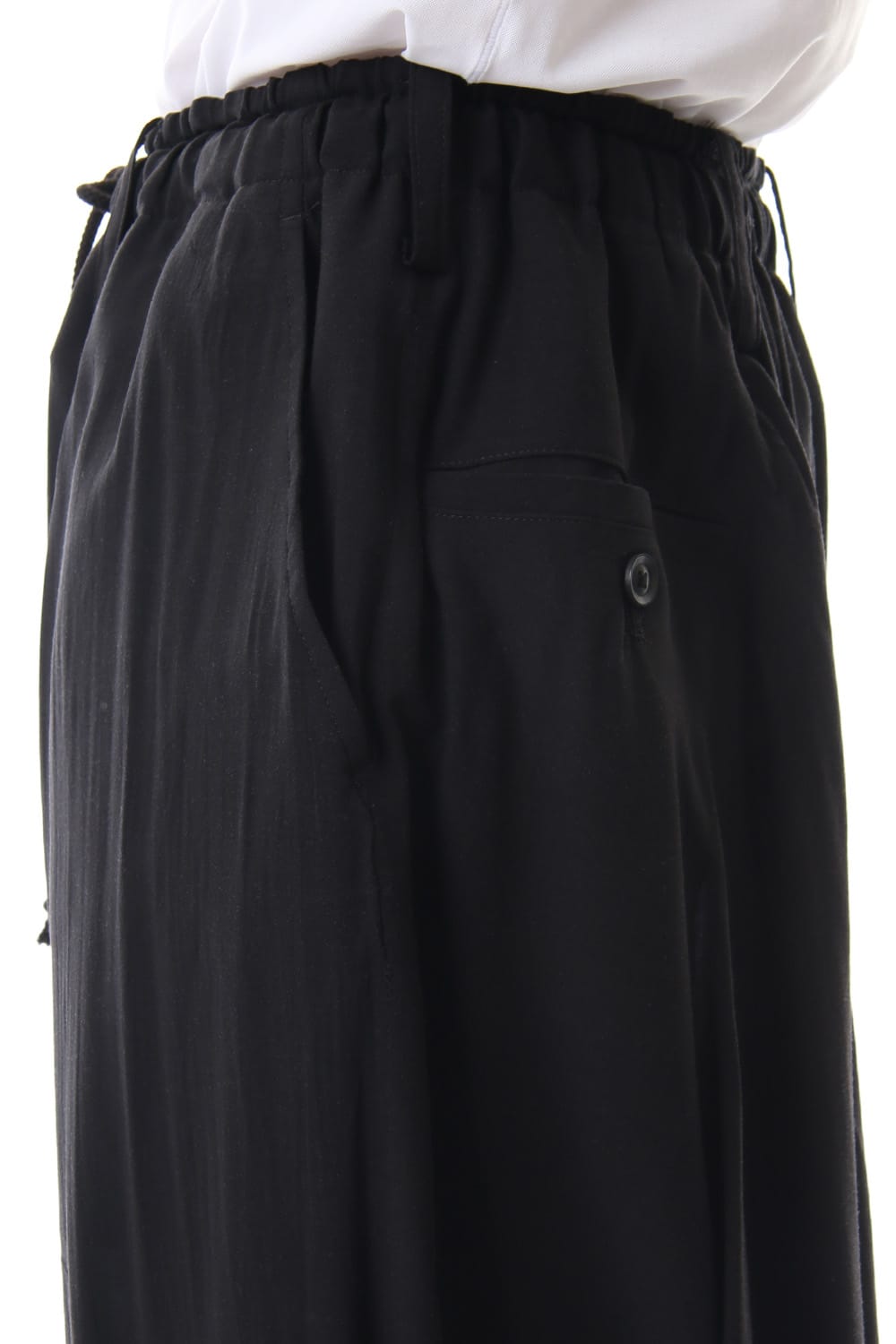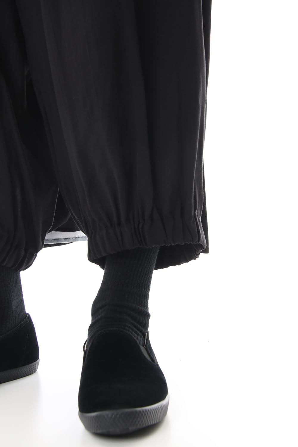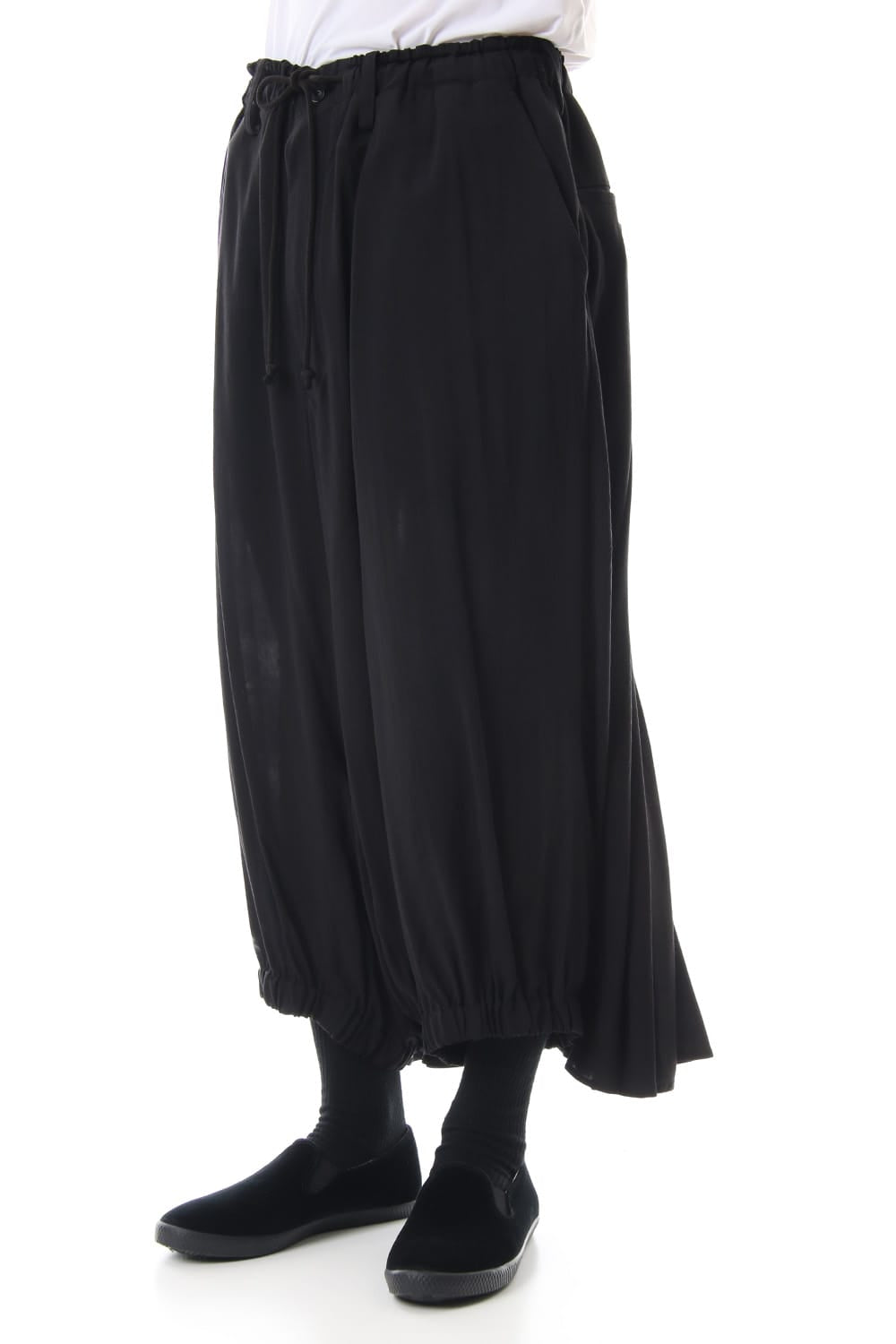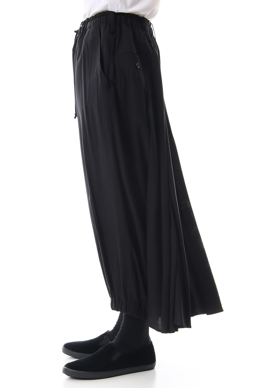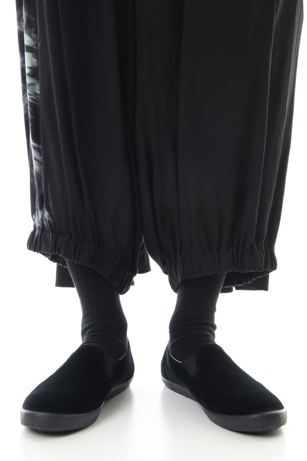Crow pants with a woman print on the right side that was worn during the Runway LOOK 34. The crow pants were re-developed from the 19SS season, it has a unique shape that has voluminous fabric on the back that allows the pants to move beautifully when walking.