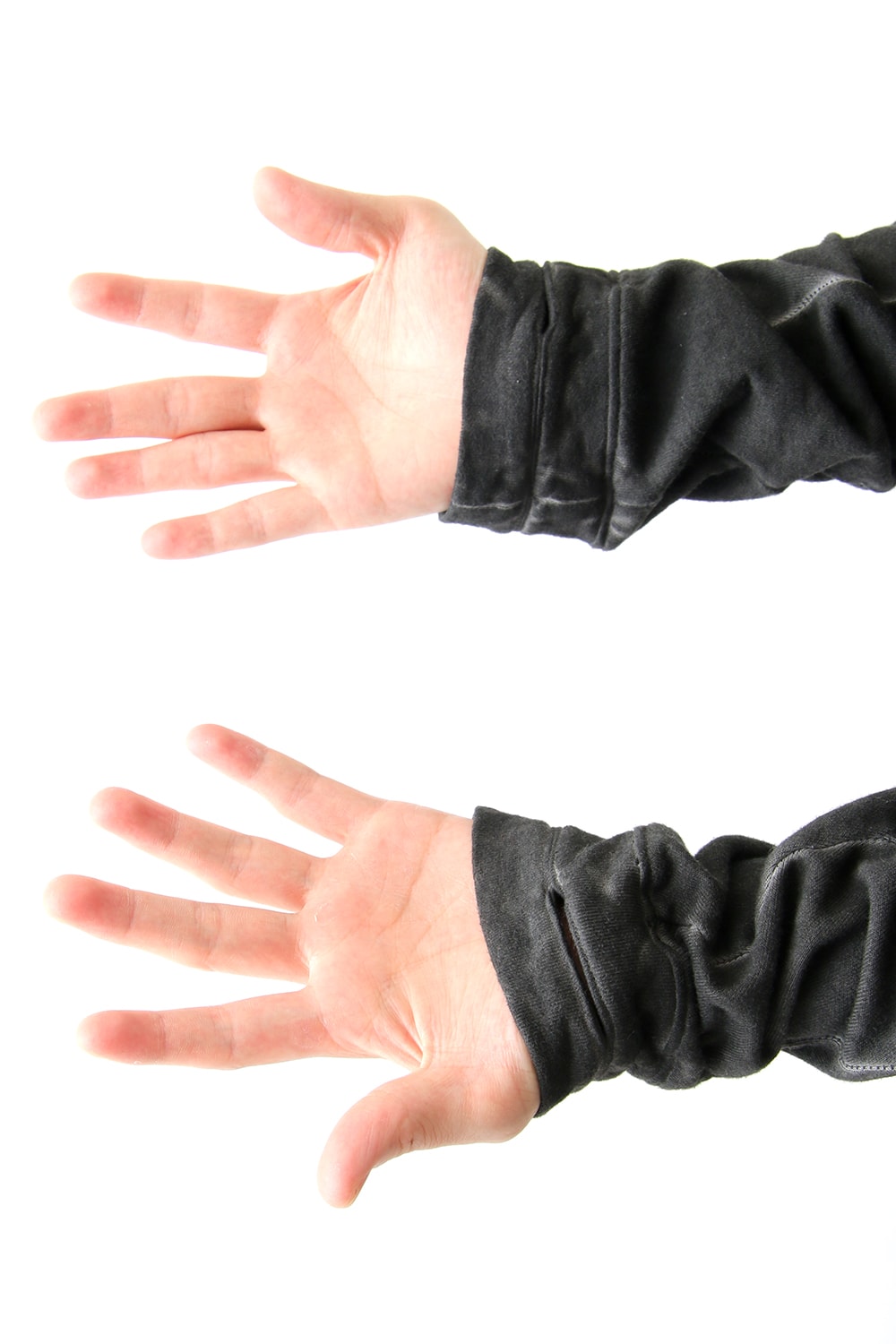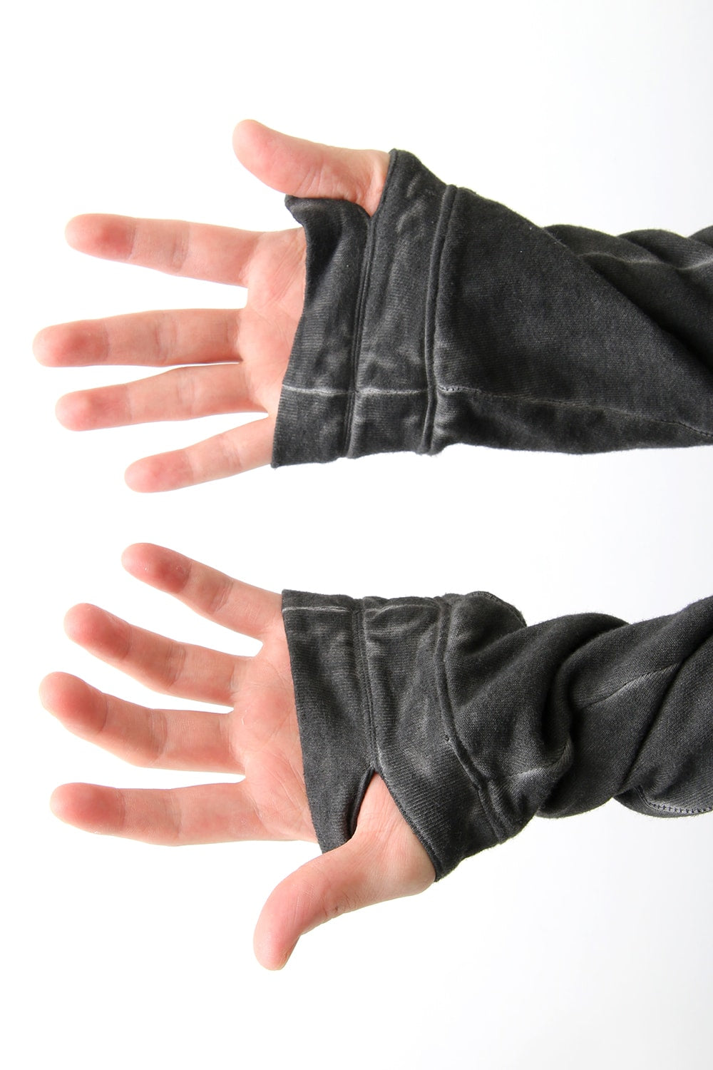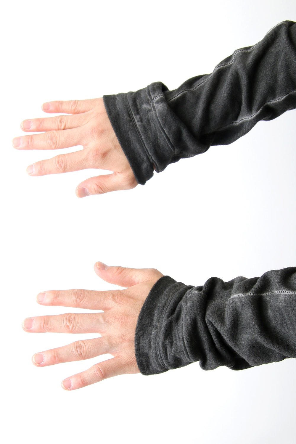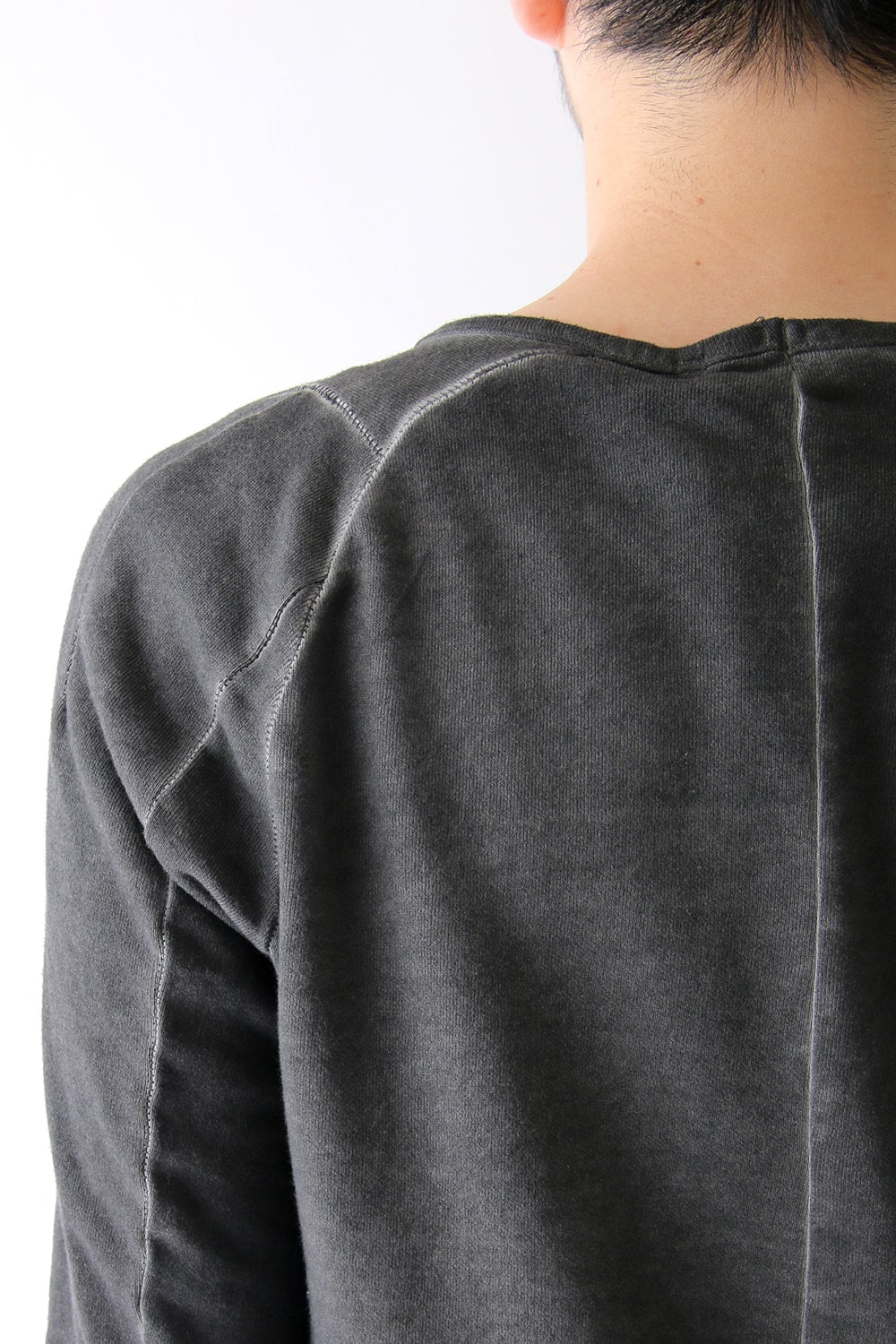 Although it is a basic long sleeve t-shirt, it has some characteristic patterns with the raglan and beautifully curved darts sleeves as well as SADDAM TEISSY's pattern technology. Sleeve parts are sewn by each eye-locking lock. Hidden thumbholes are attached to cuffs. Processing was by special product dyeing that draws a sense of unevenness and decadent expression