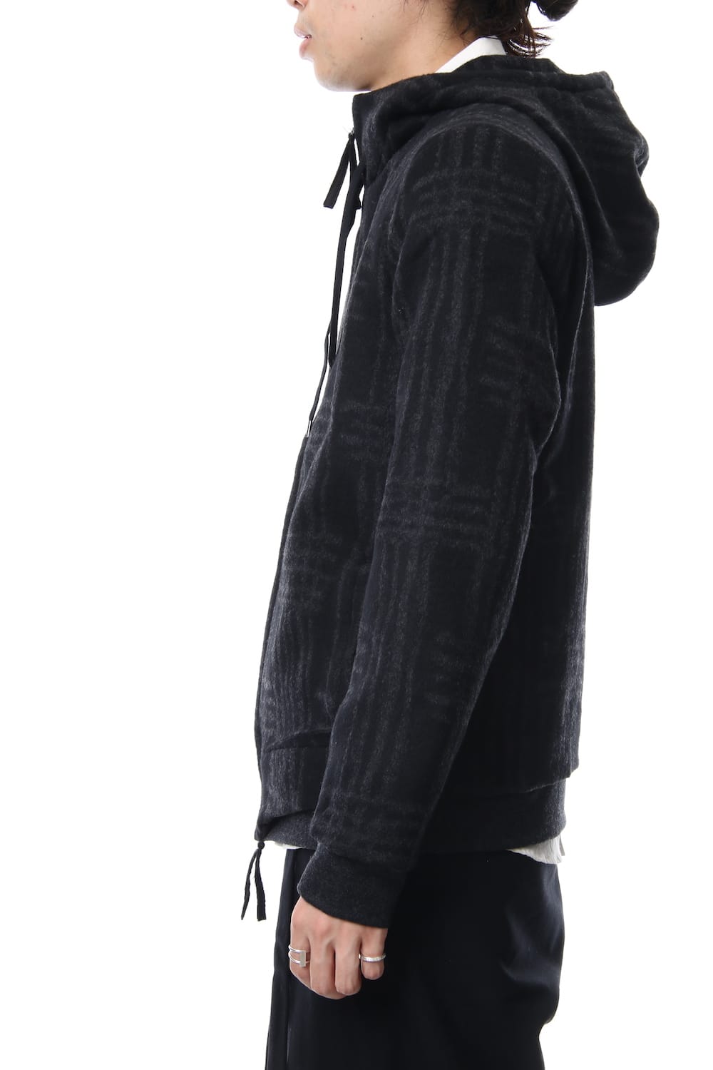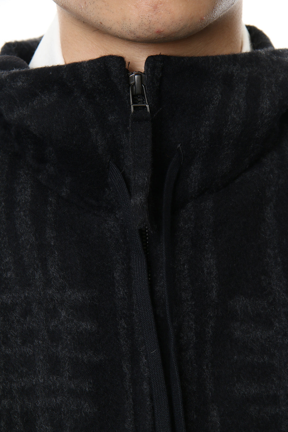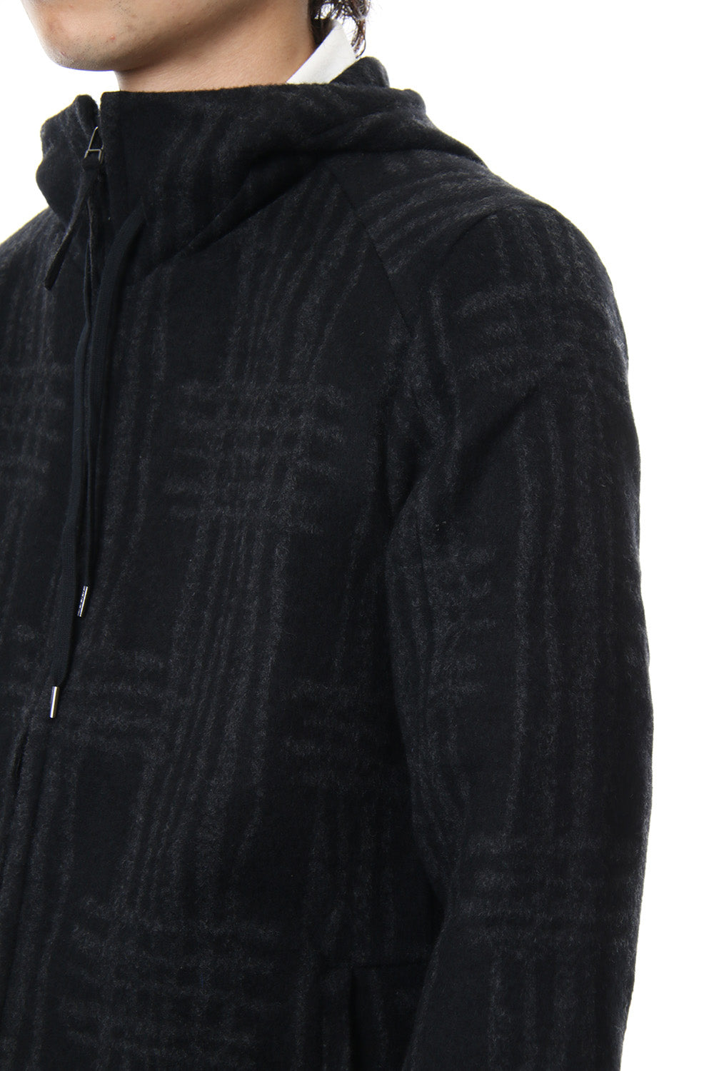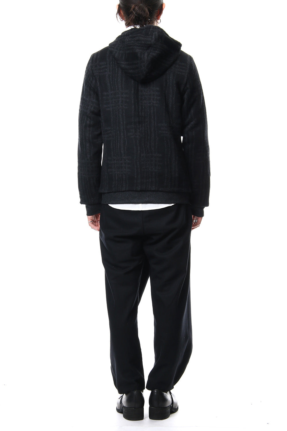This is a hood jacket with distorted lines drawn like handwriting, made with Jacquard woven fabric wool cashmere with beaver finish.