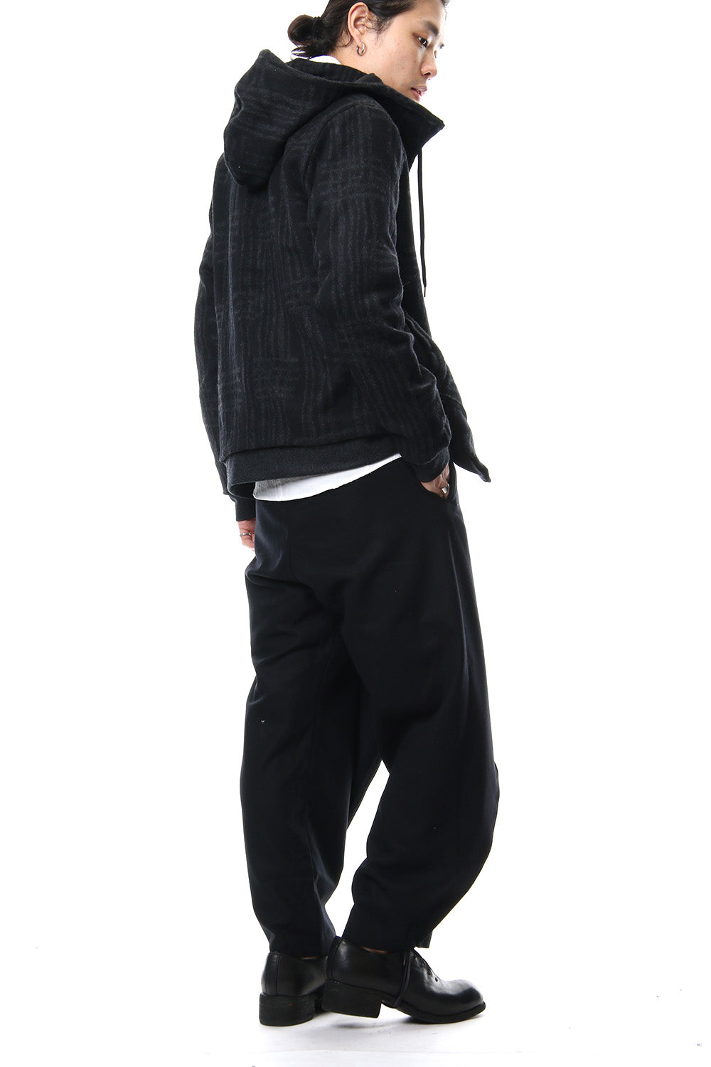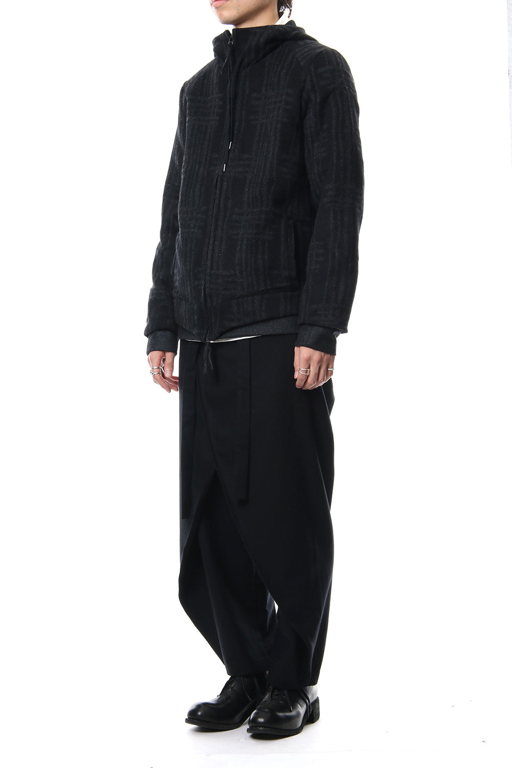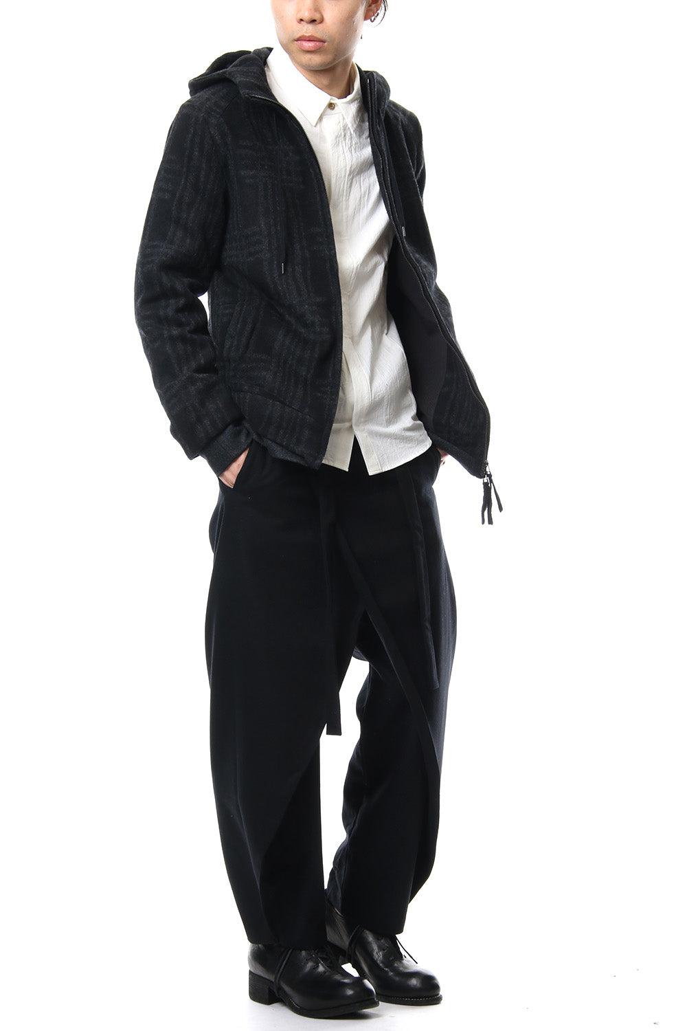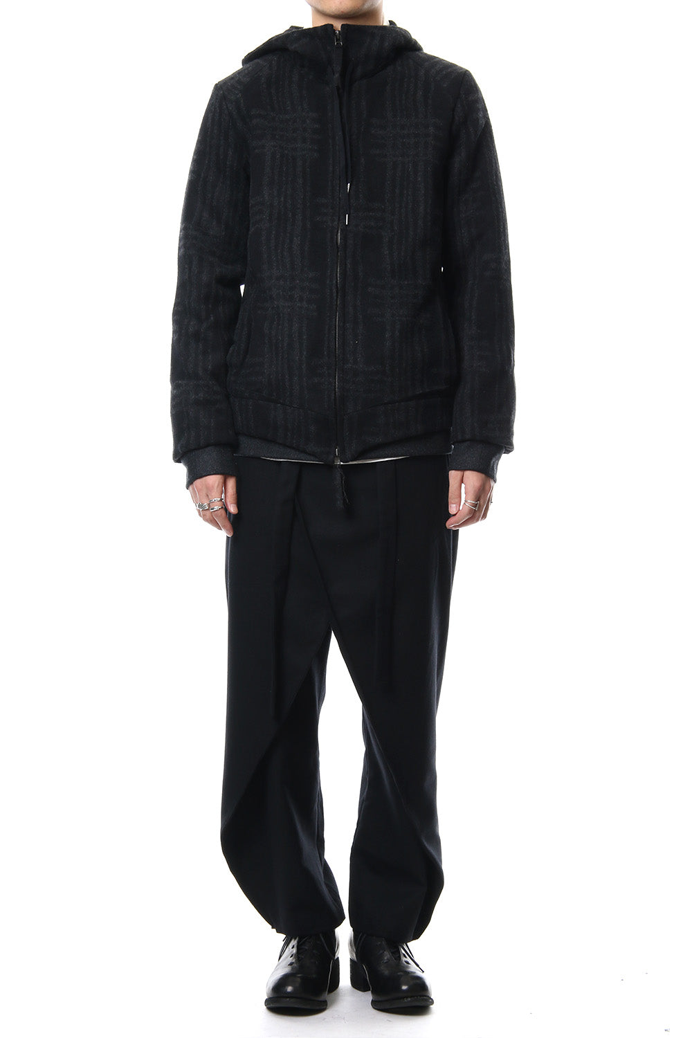 This is a hood jacket with distorted lines drawn like handwriting, made with Jacquard woven fabric wool cashmere with beaver finish.
