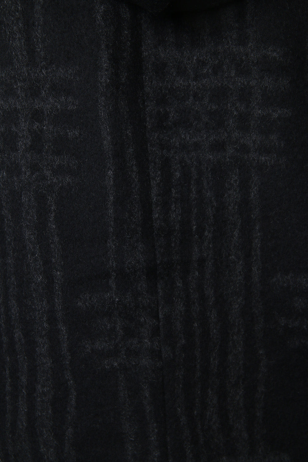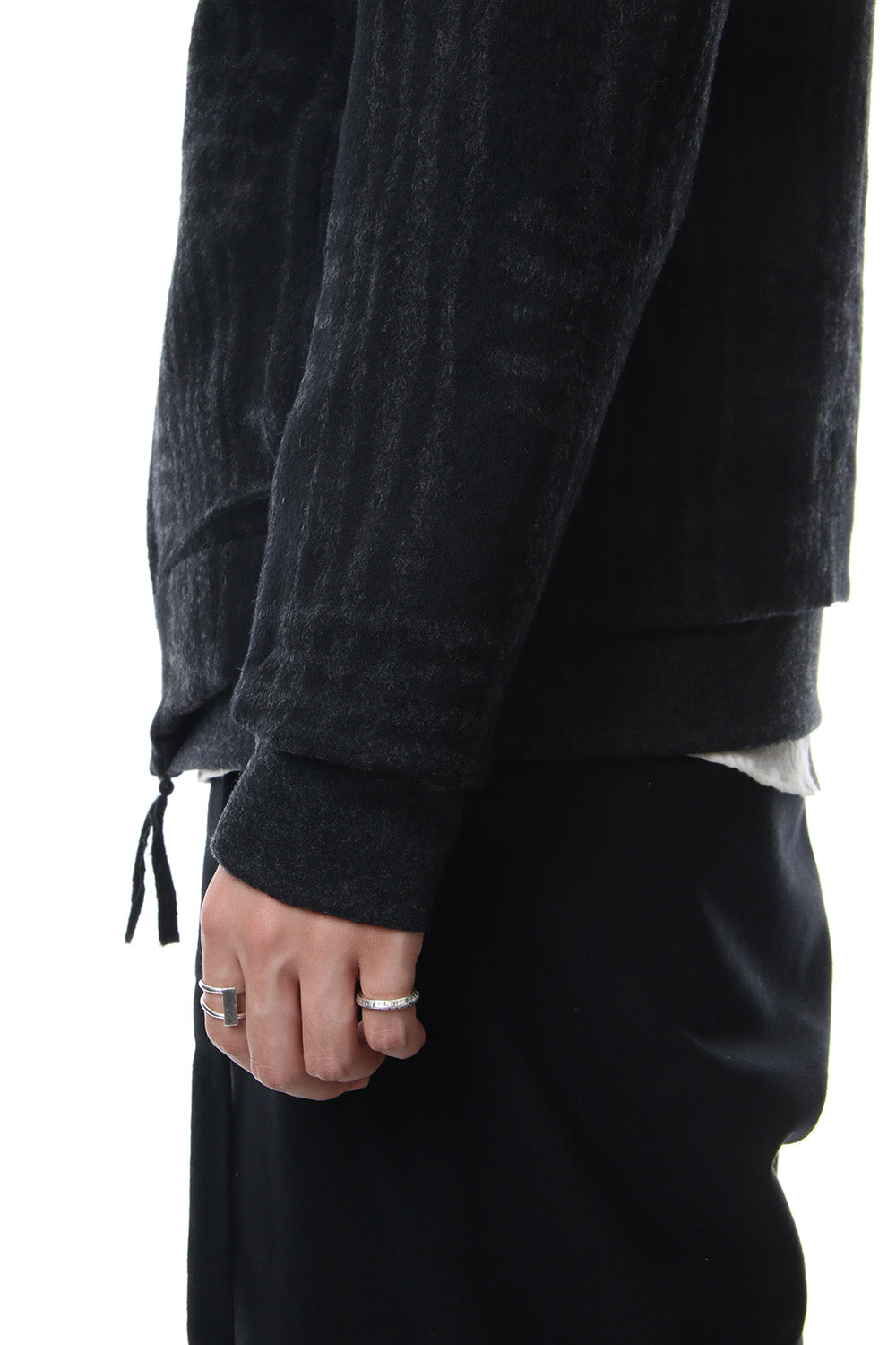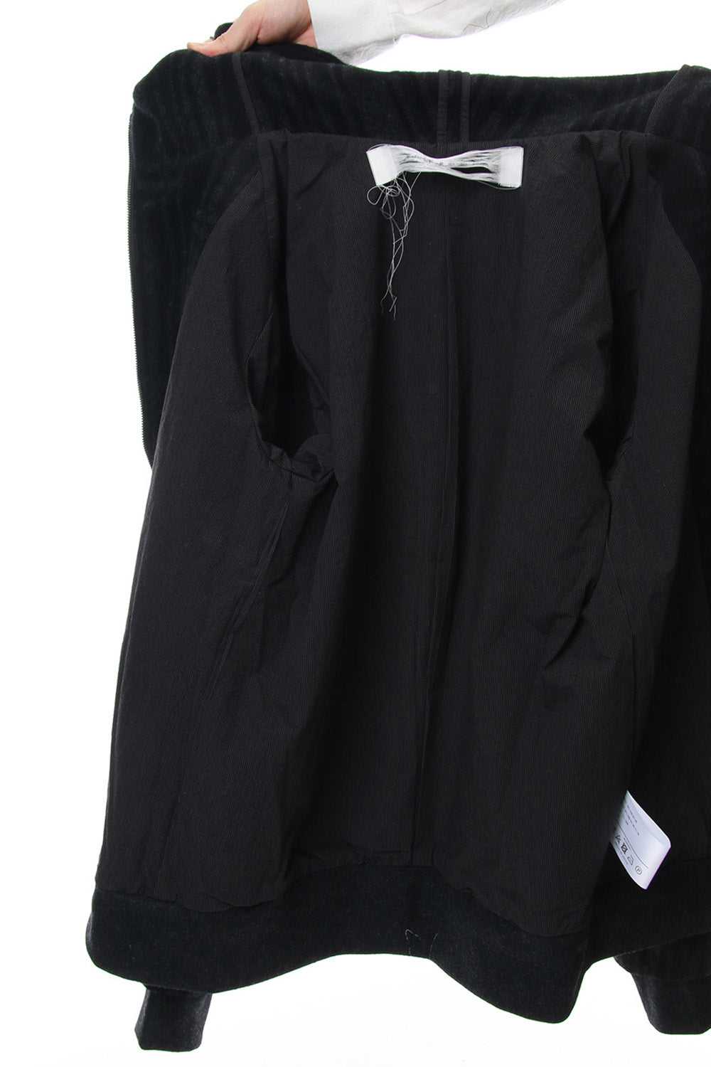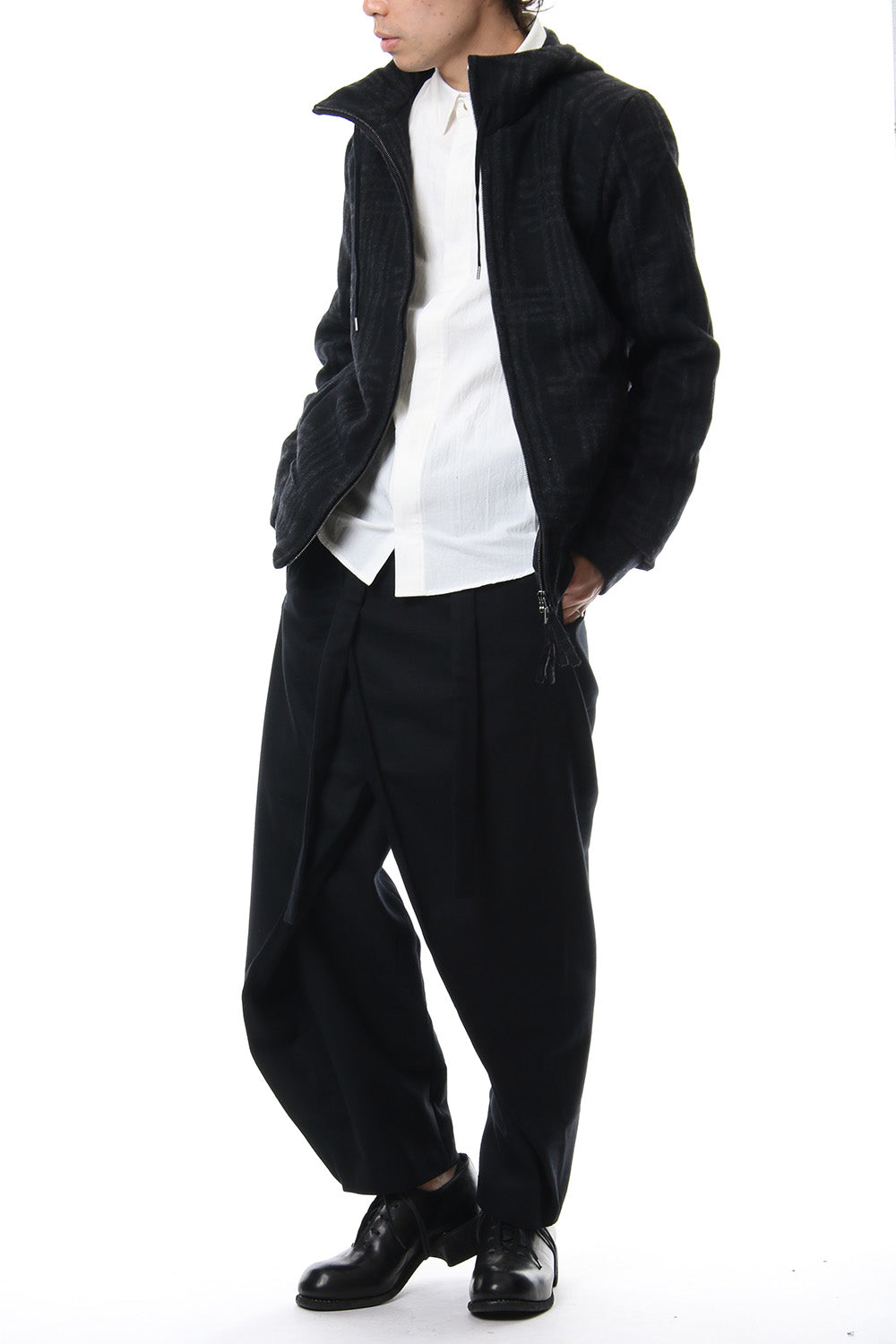 This is a hood jacket with distorted lines drawn like handwriting, made with Jacquard woven fabric wool cashmere with beaver finish.