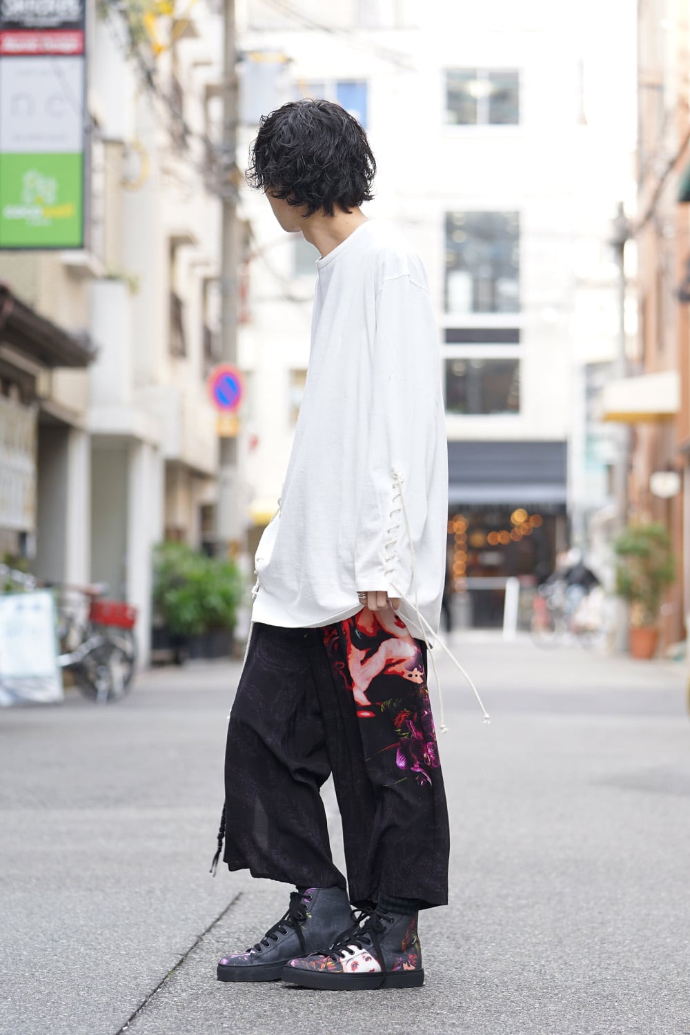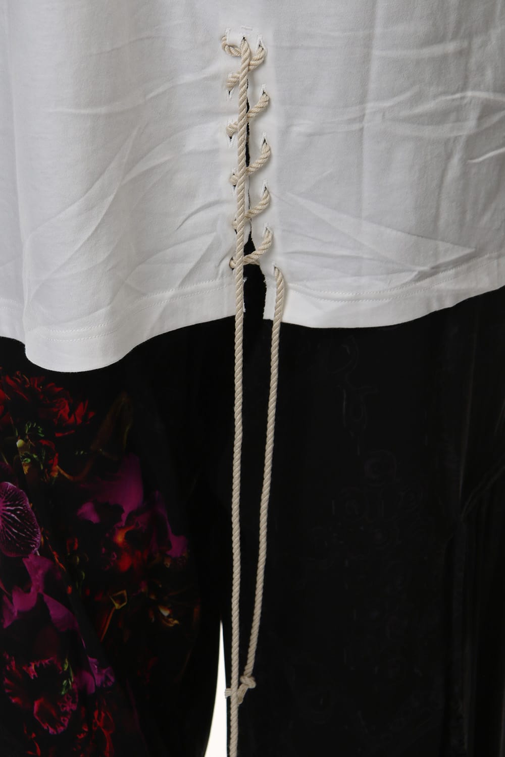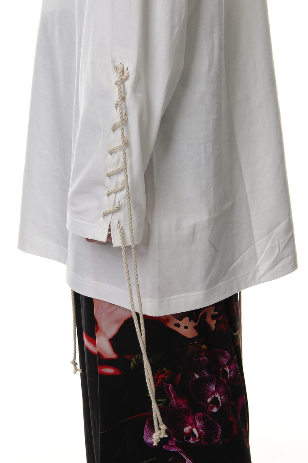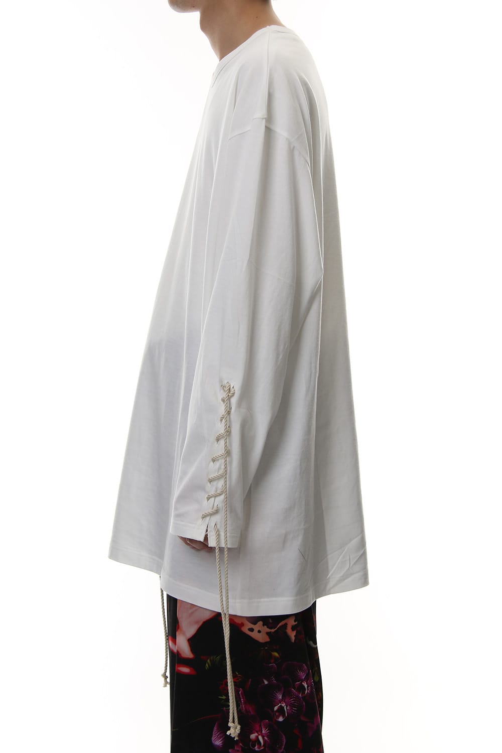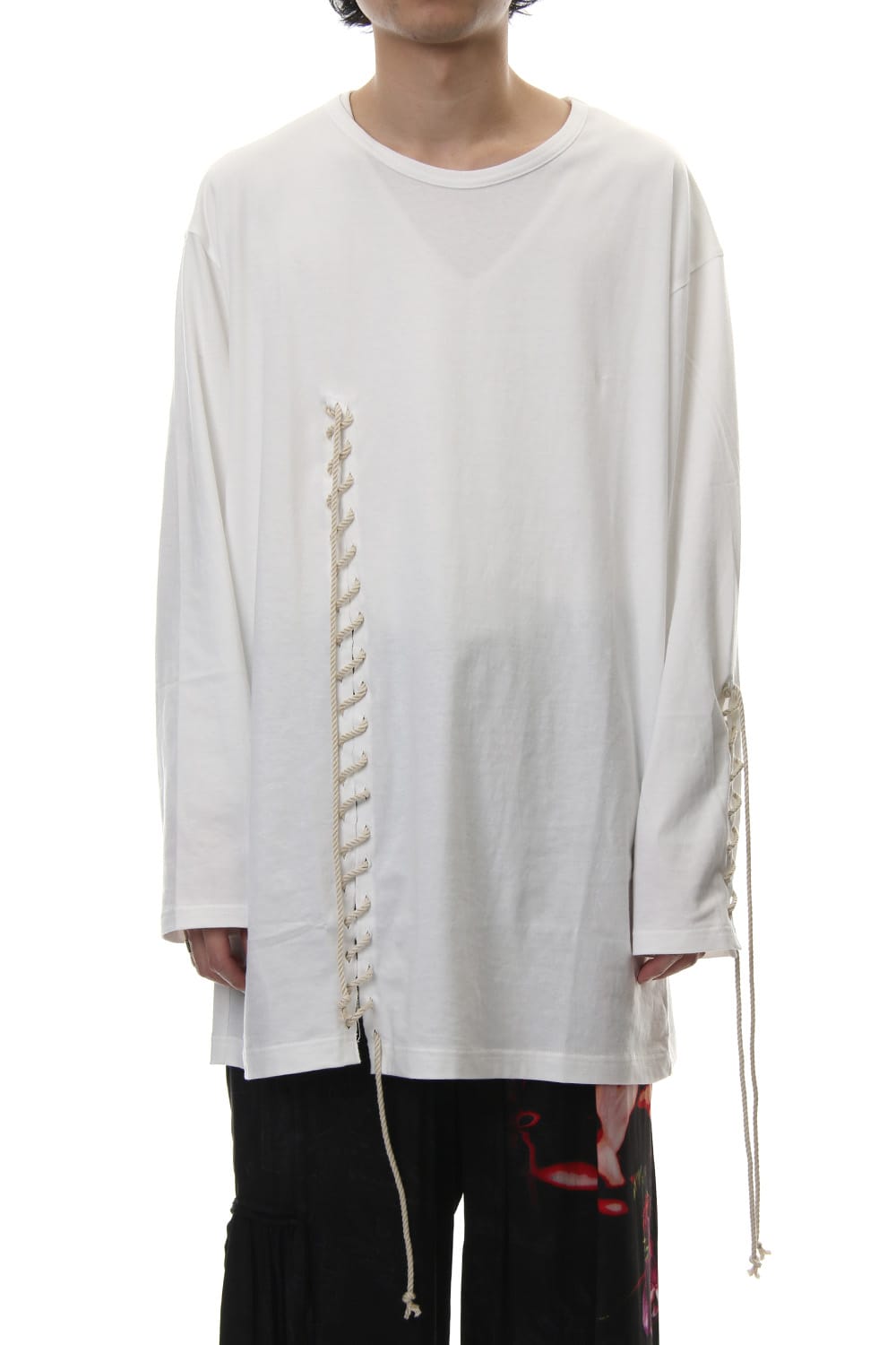 Long sleeve T-shirt with lace-up design on left sleeve and front. It is an item that will give a nice detail design for plain and simple looks. it is a piece recommended for those who are not too fond of impactful prints as the lace up design is simple and casual but has a good accent.