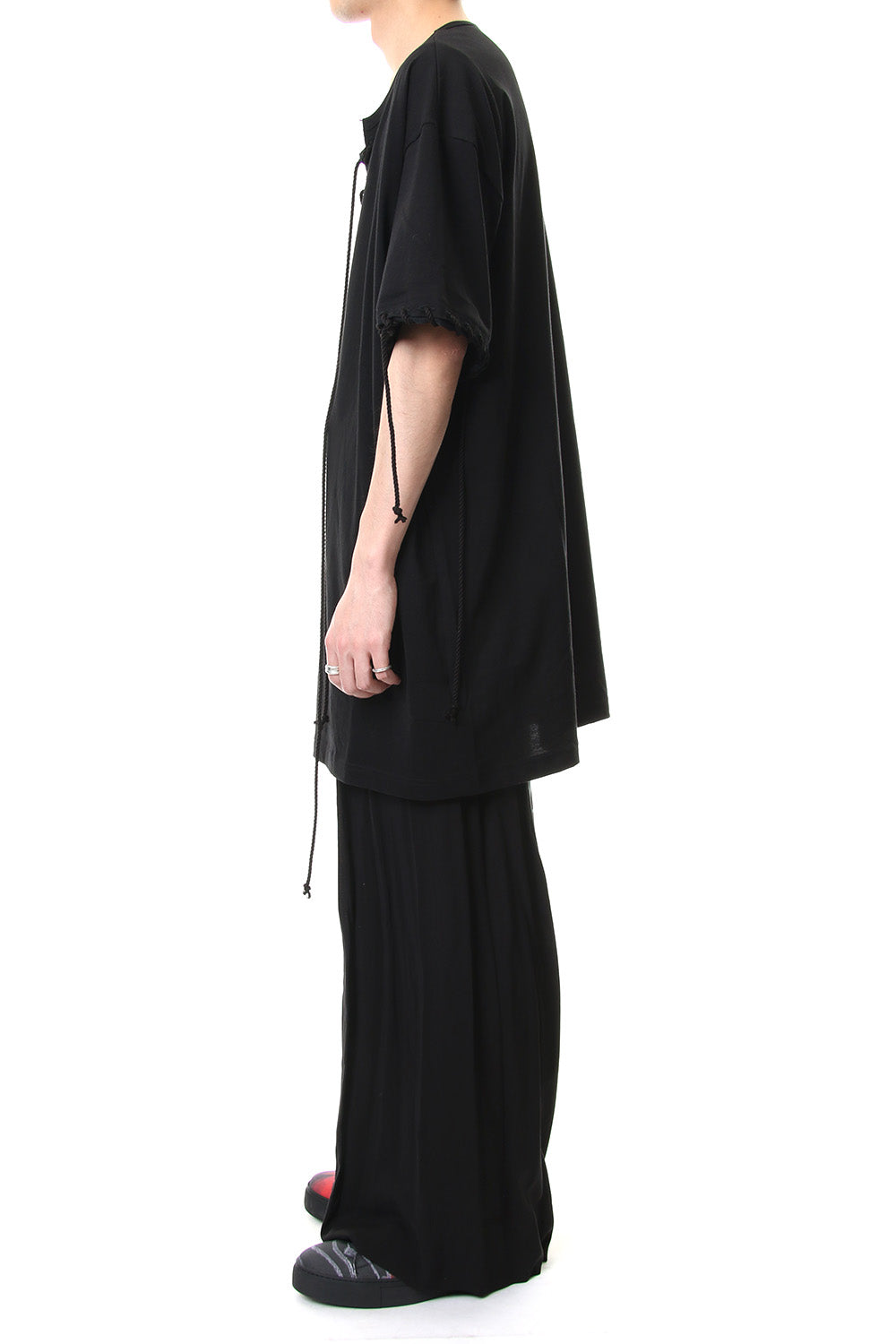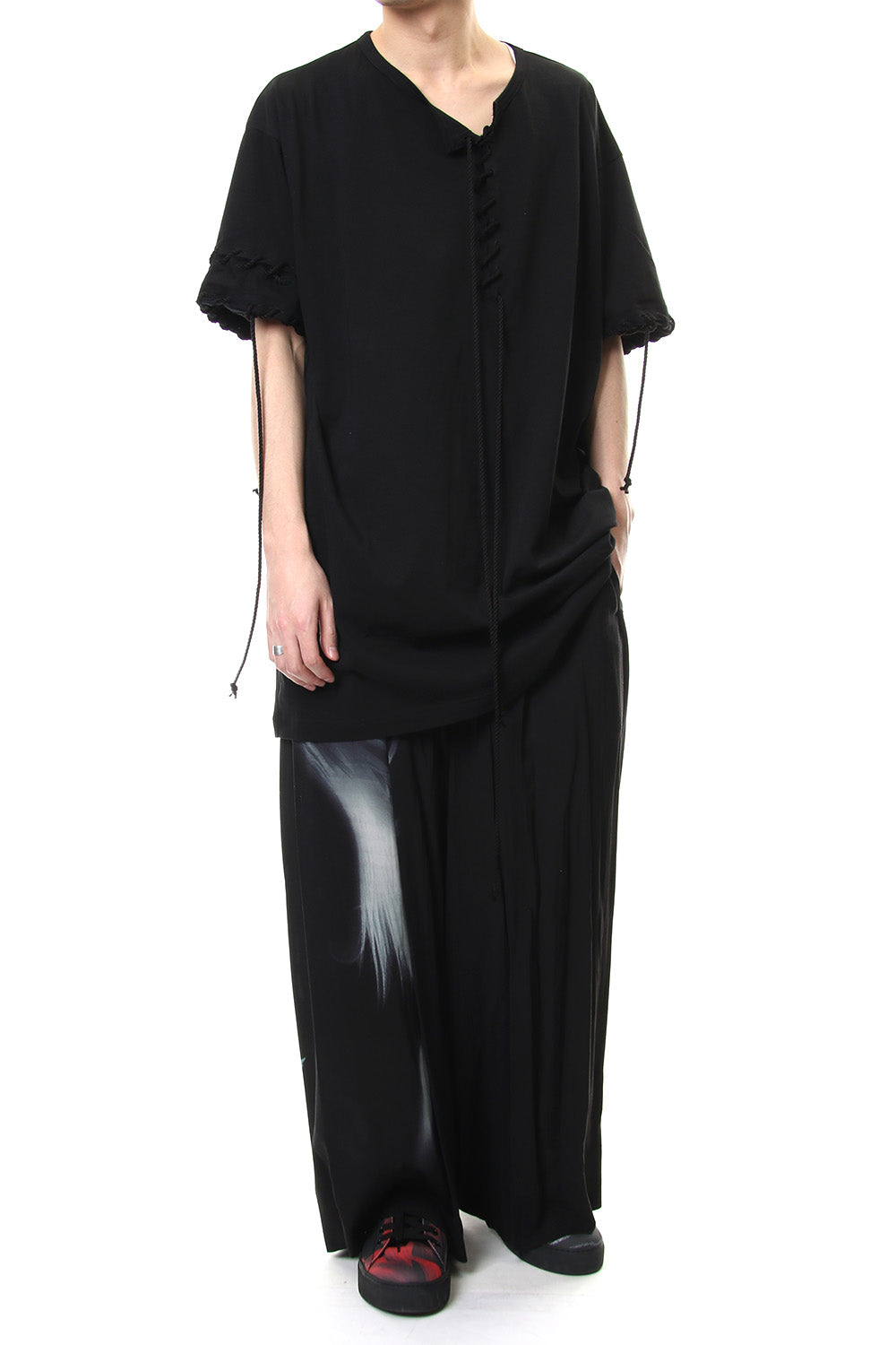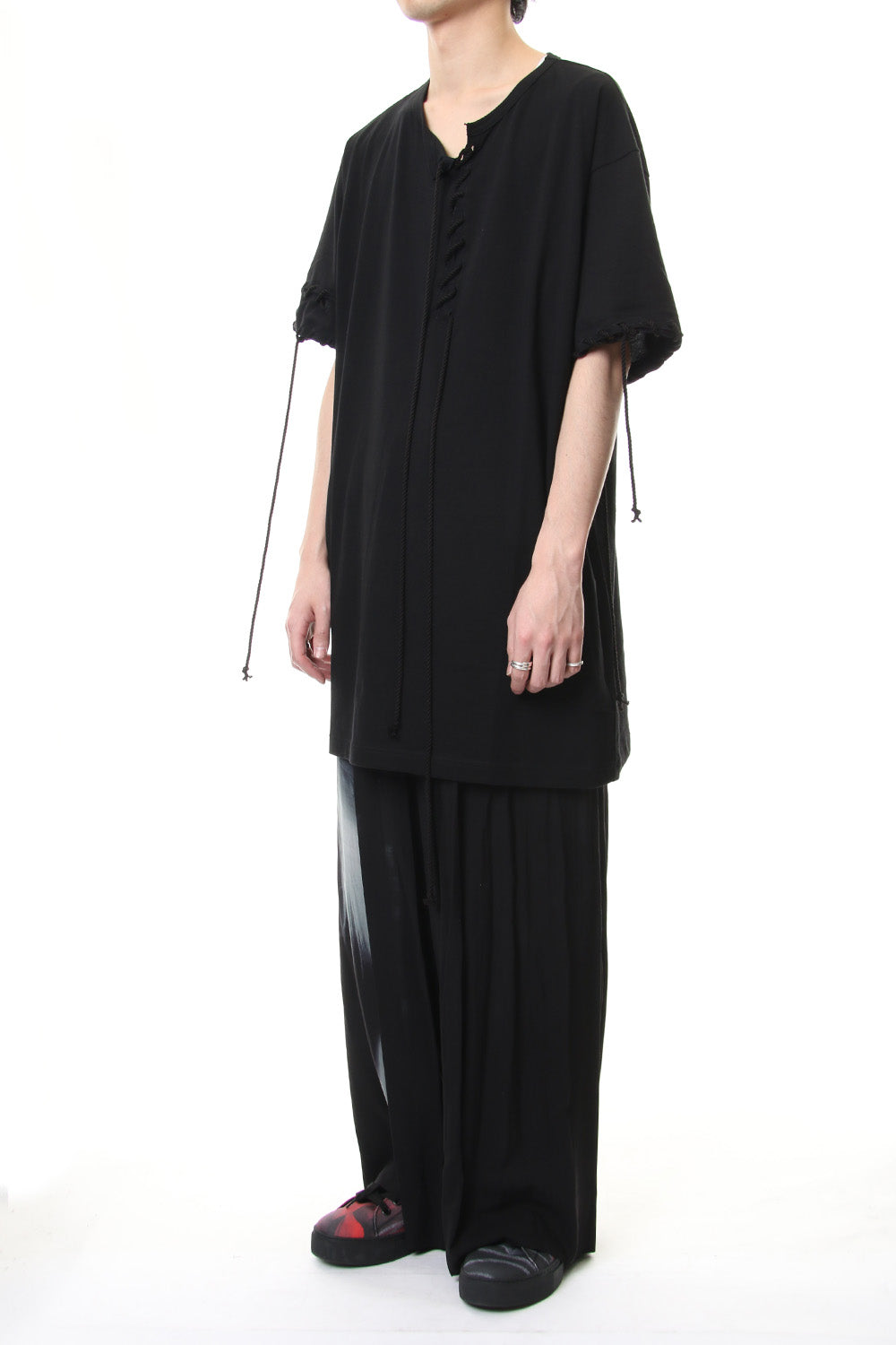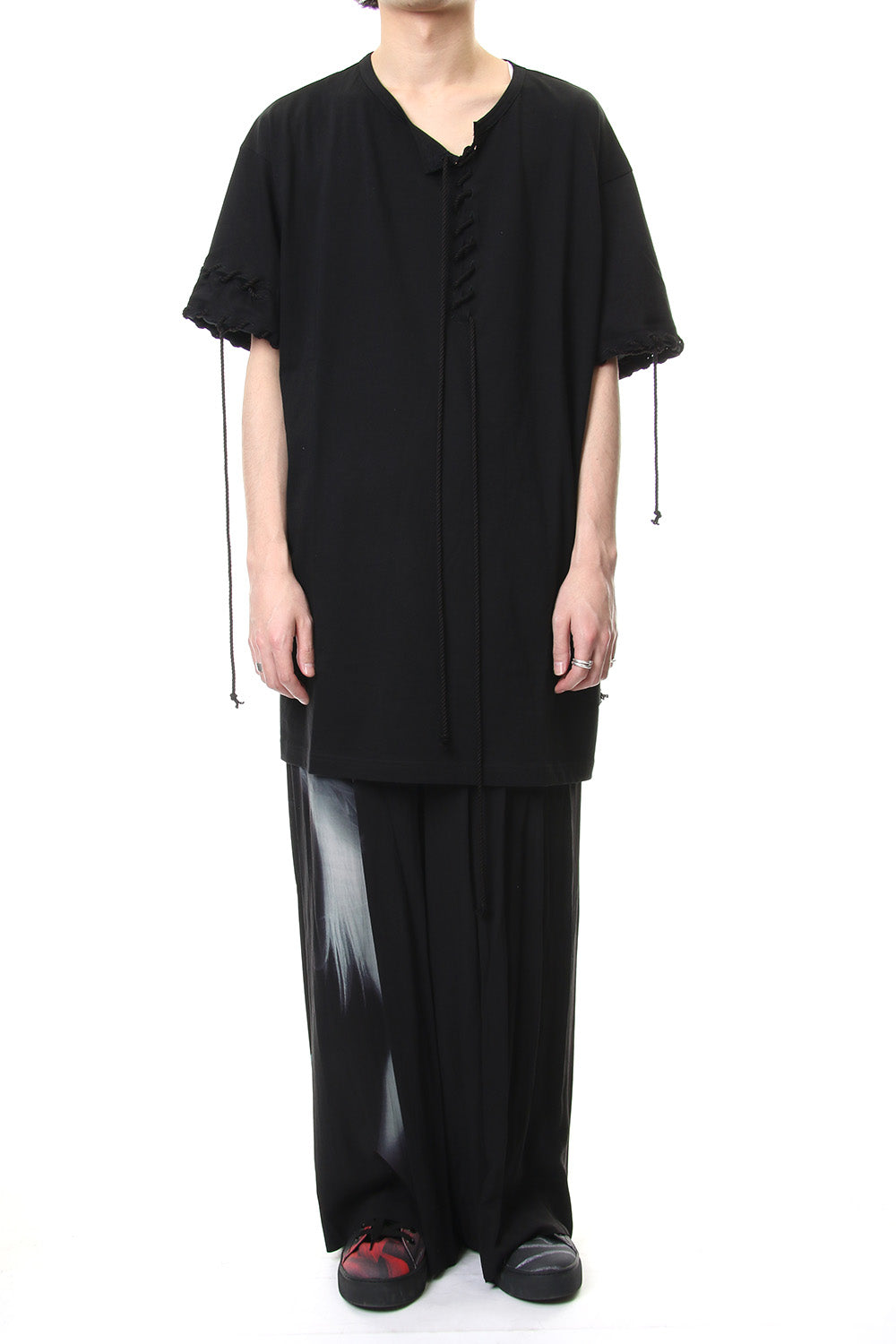 Lace-up design short sleeve T-shirt that was worn during the runway LOOK 3. It is an item that will moderately accentuate a simple design with the rope weaving the neck and cuffs. it is a piece recommended for those who are not too fond of impactful prints as the lace up design is simple and casual but has a good accent.