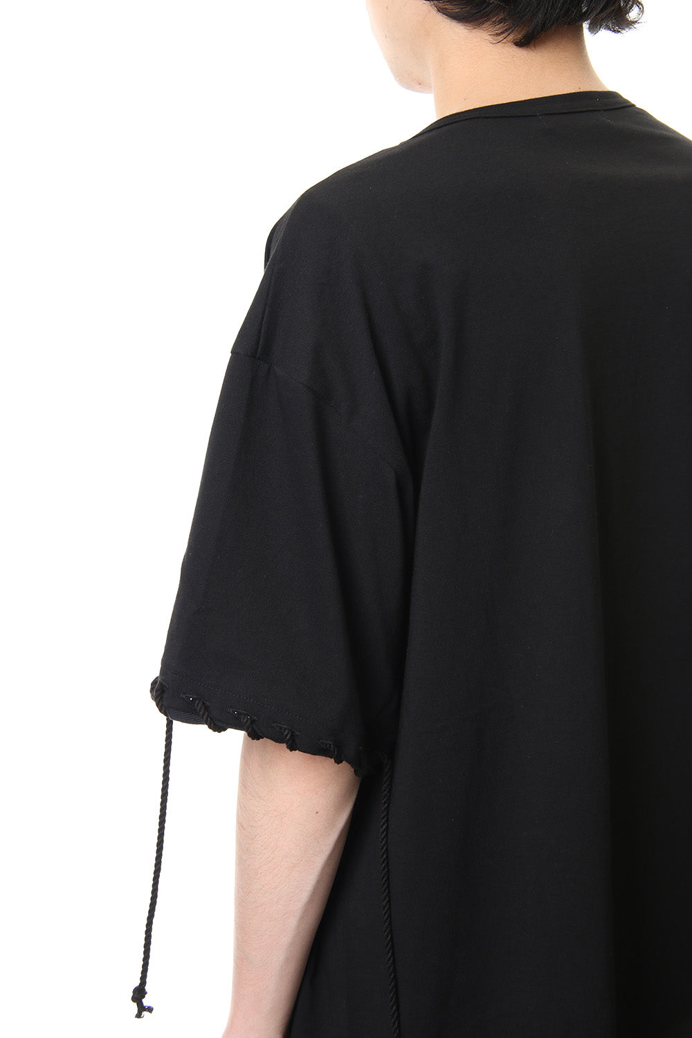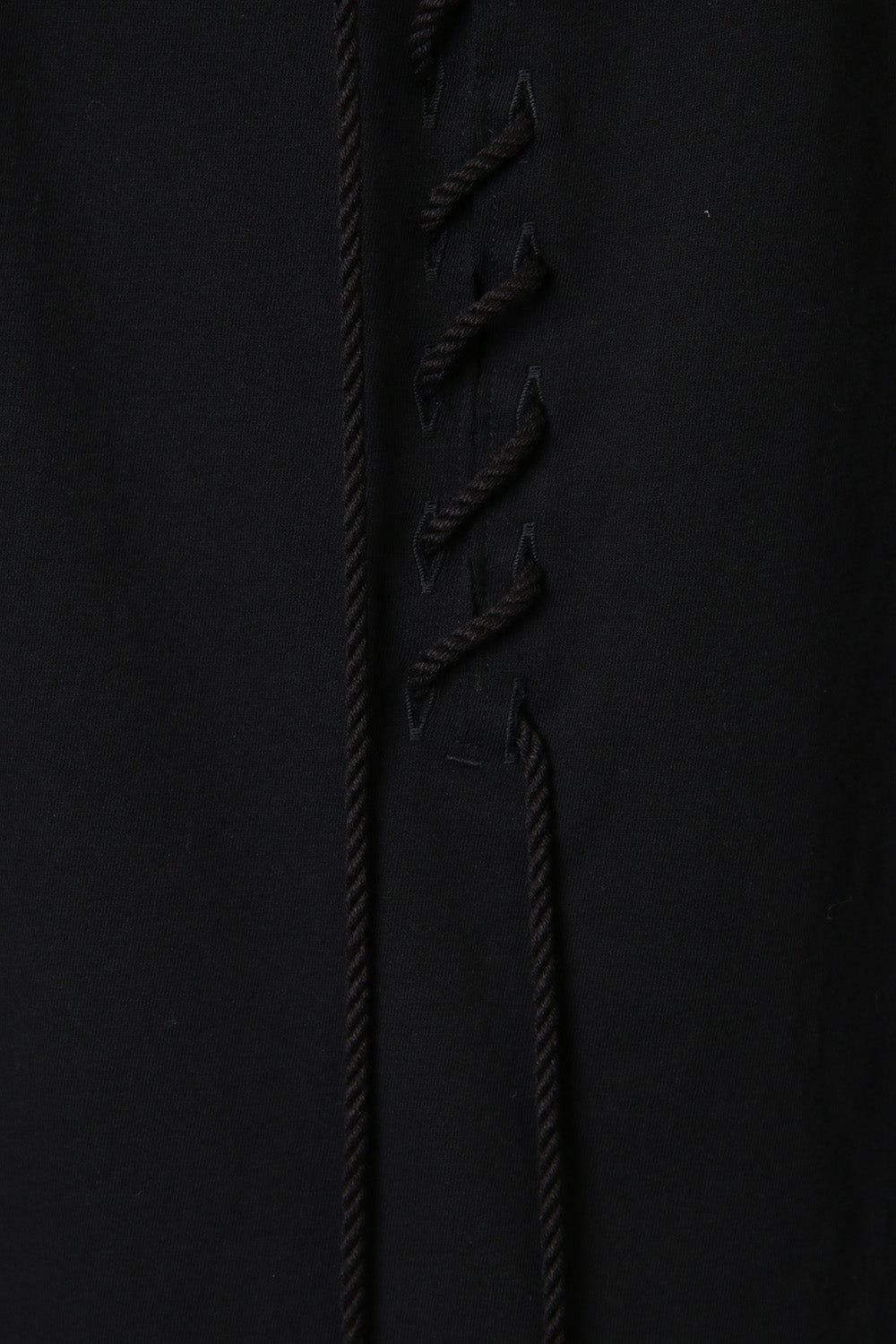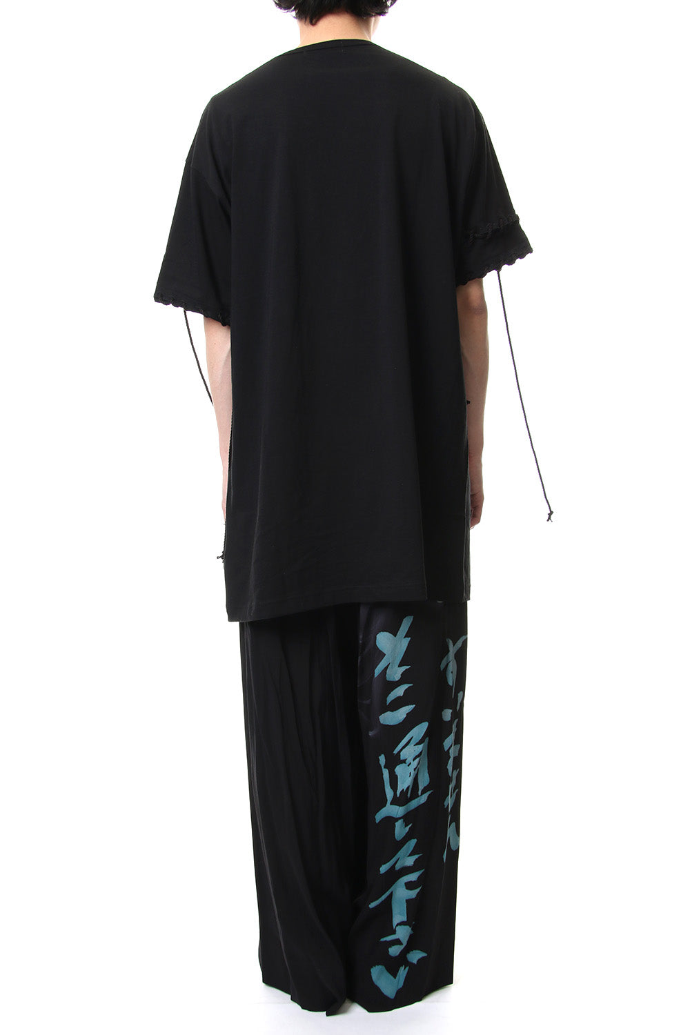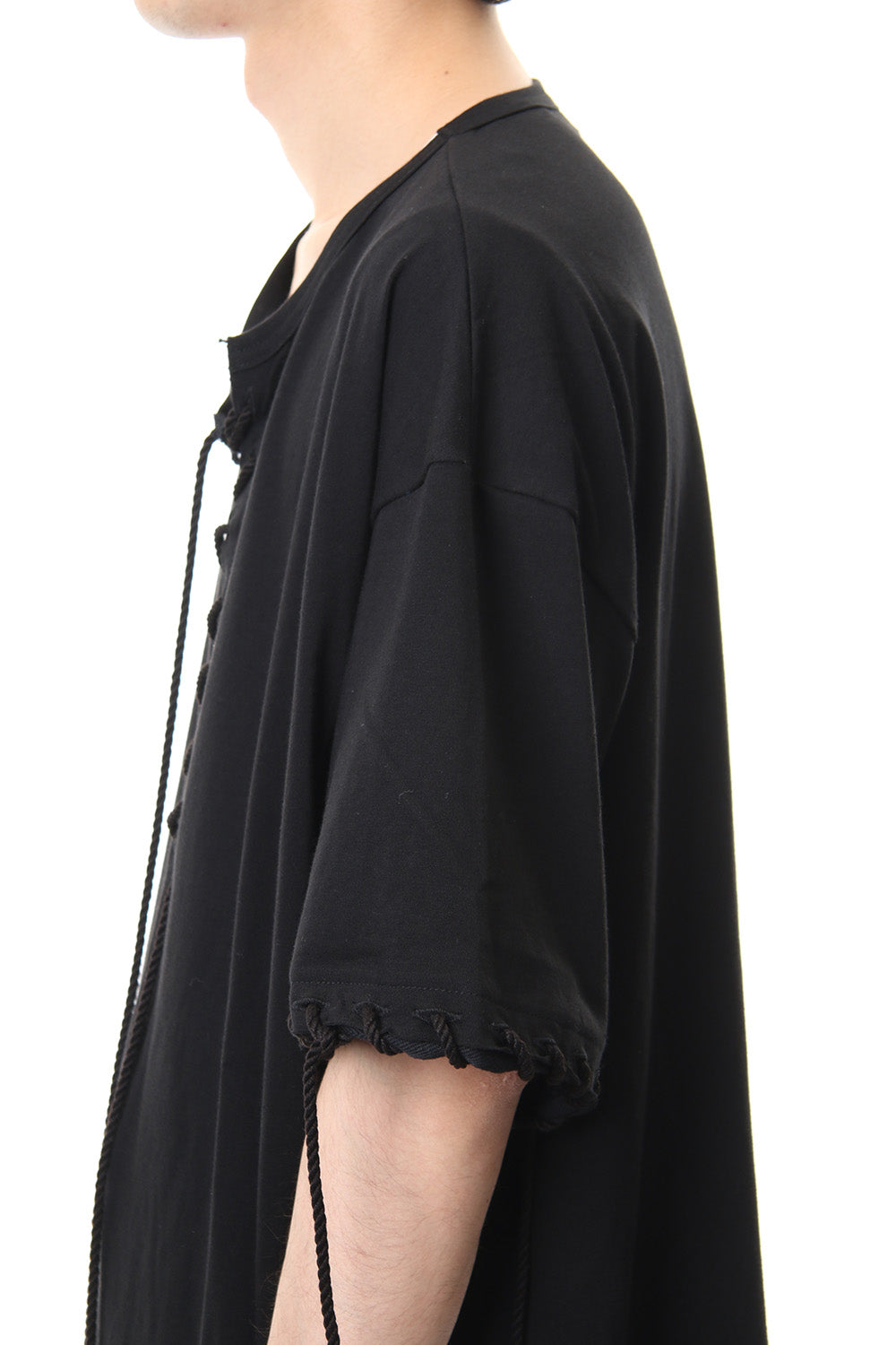 Lace-up design short sleeve T-shirt that was worn during the runway LOOK 3. It is an item that will moderately accentuate a simple design with the rope weaving the neck and cuffs. it is a piece recommended for those who are not too fond of impactful prints as the lace up design is simple and casual but has a good accent.
