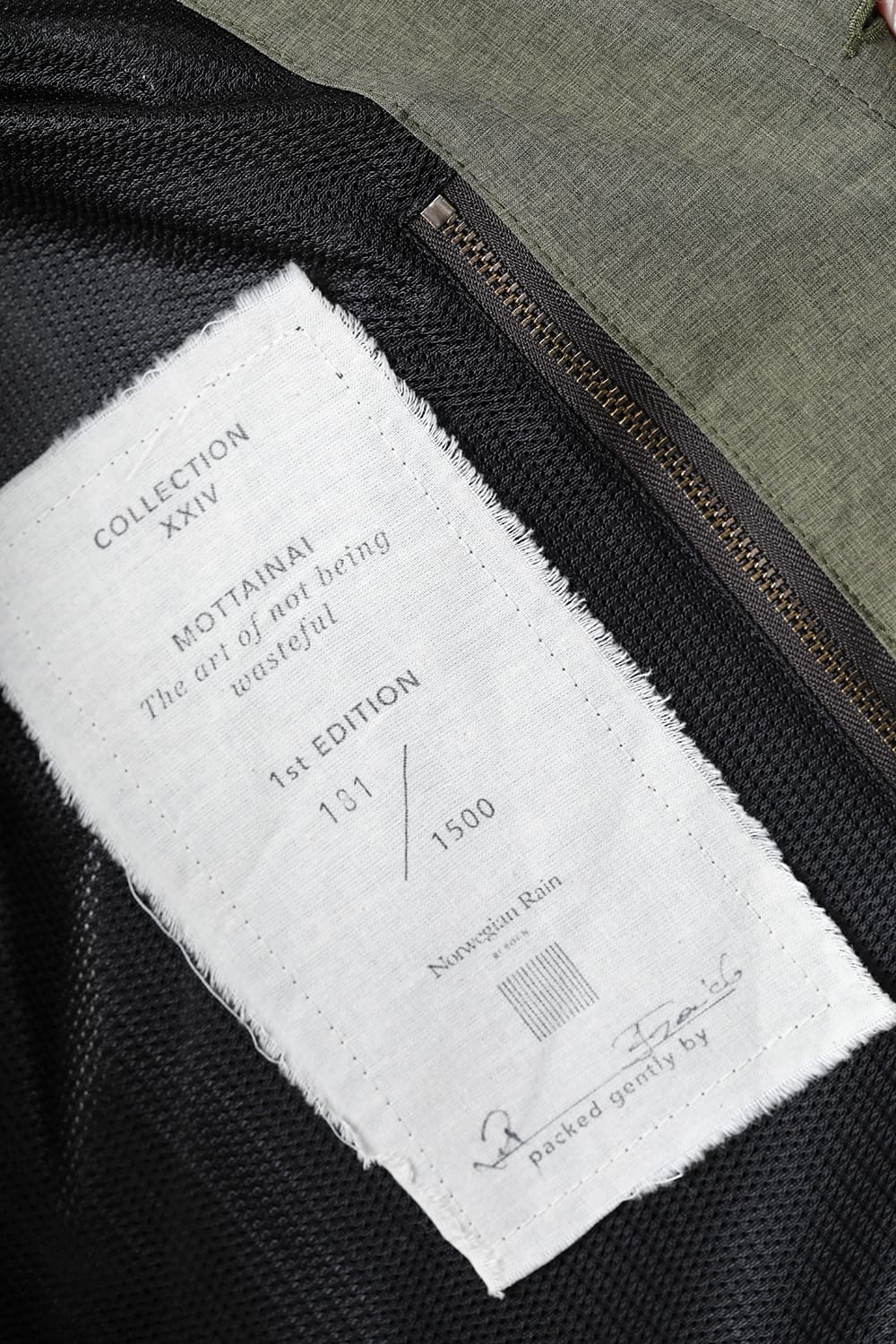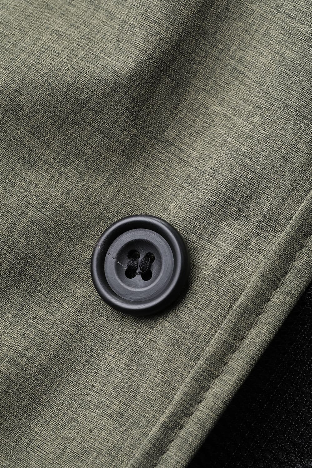 面料采用纤维行业中经过环境、劳动、消费者观点的可持续供应链的蓝印认证的面料,面料使用尽可能减少有害物质排出的再生聚酯面料,前襟和袖子上使用的水牛纽扣只使用被认证为实用牛的角等,设计上考虑到了彻底的可持续性。