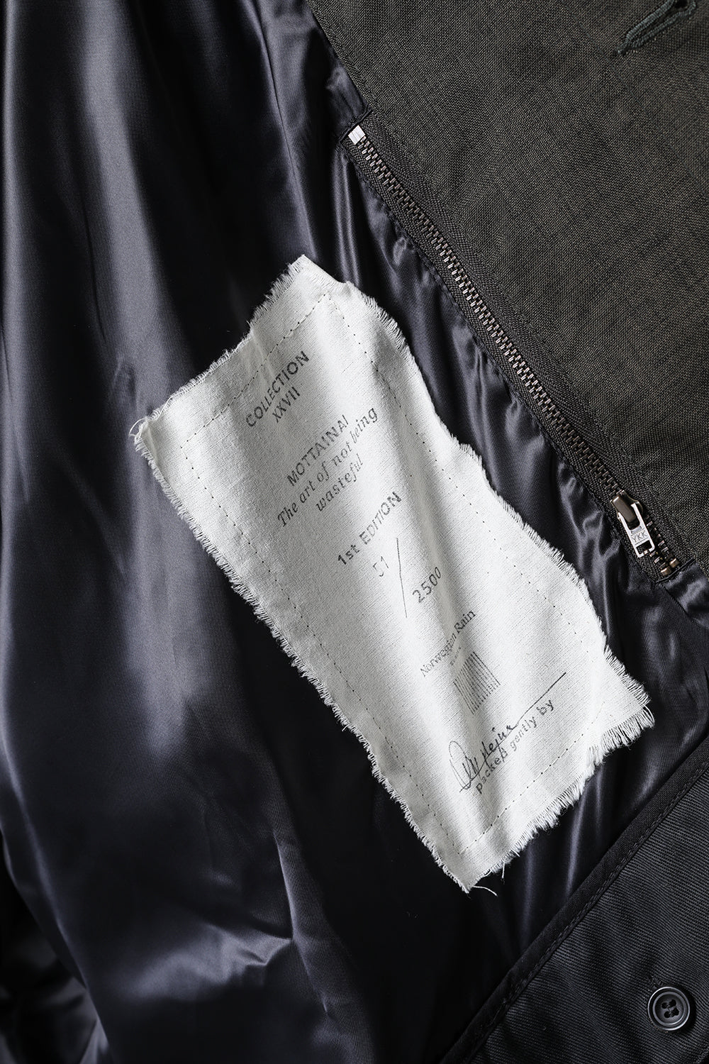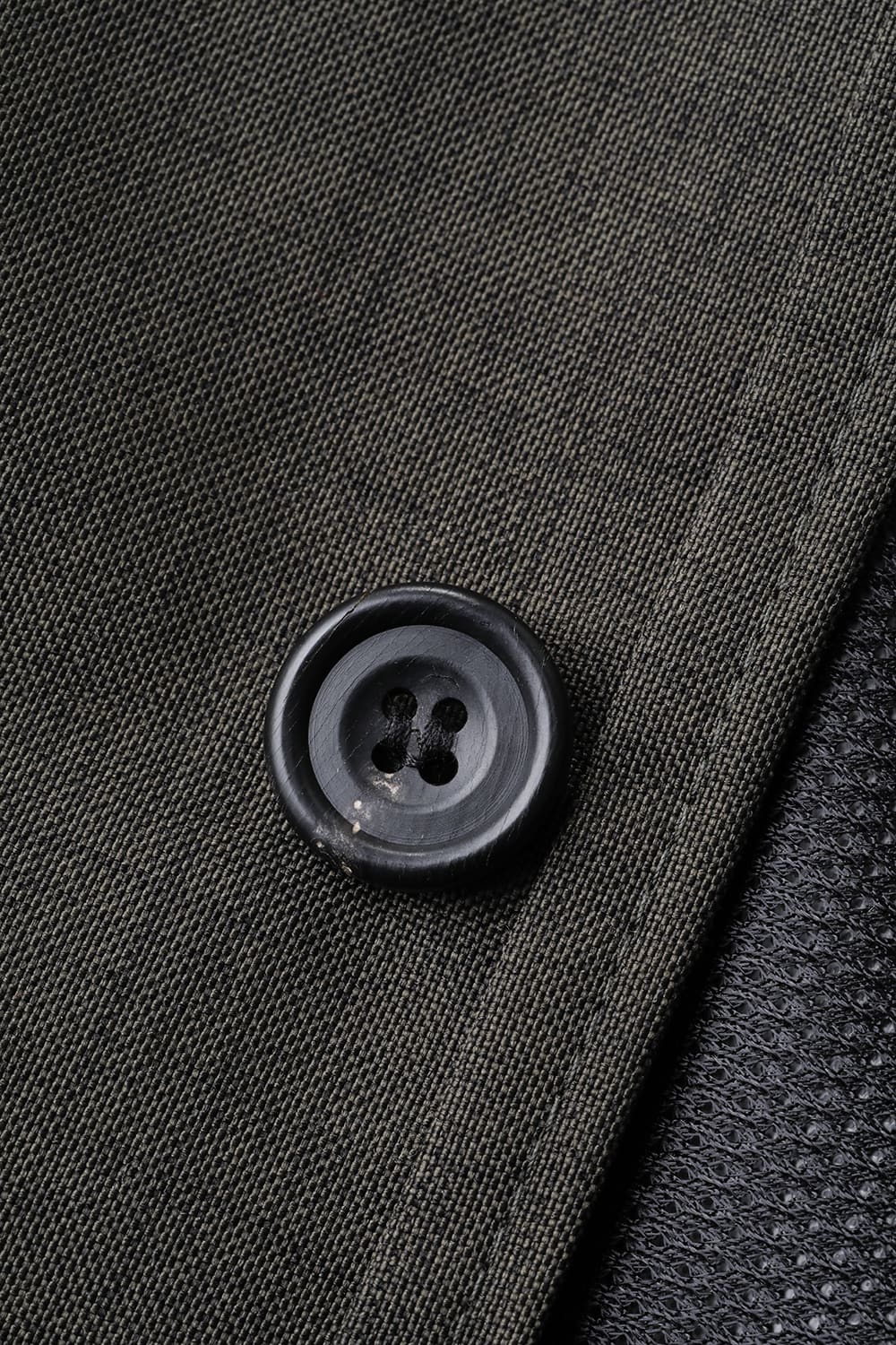 面料采用纤维行业中经过环境、劳动、消费者观点的可持续供应链的蓝印认证的面料,面料使用尽可能减少有害物质排出的再生聚酯面料,前襟和袖子上使用的水牛纽扣只使用被认证为实用牛的角等,设计上考虑到了彻底的可持续性。