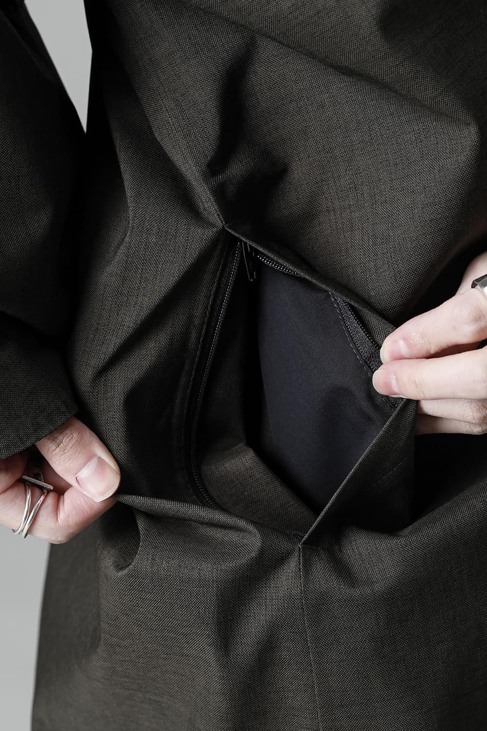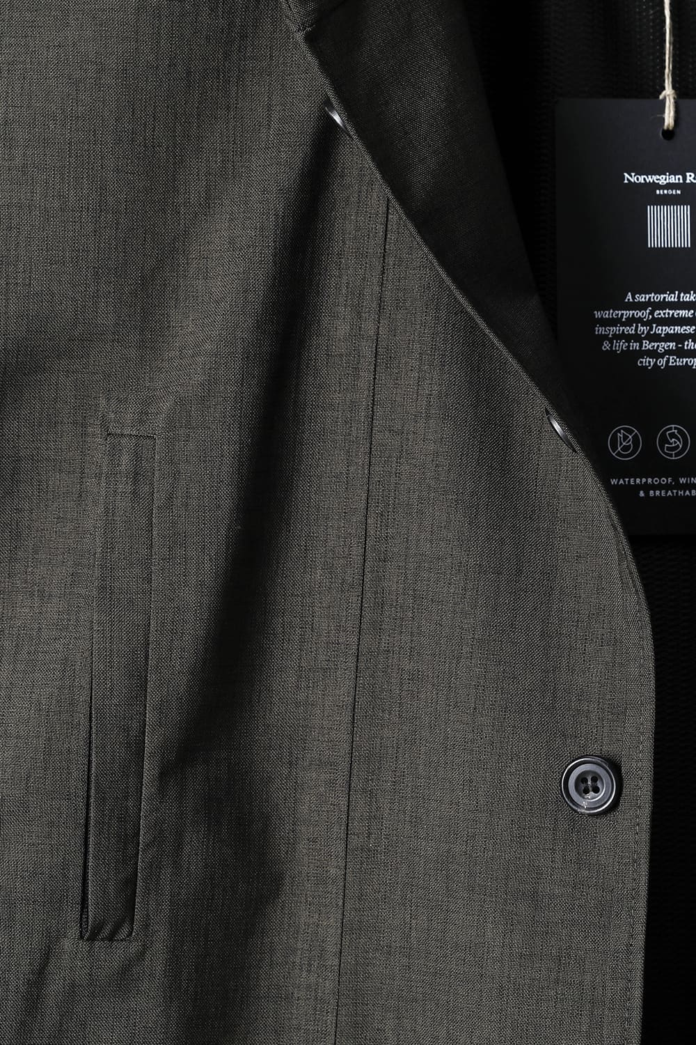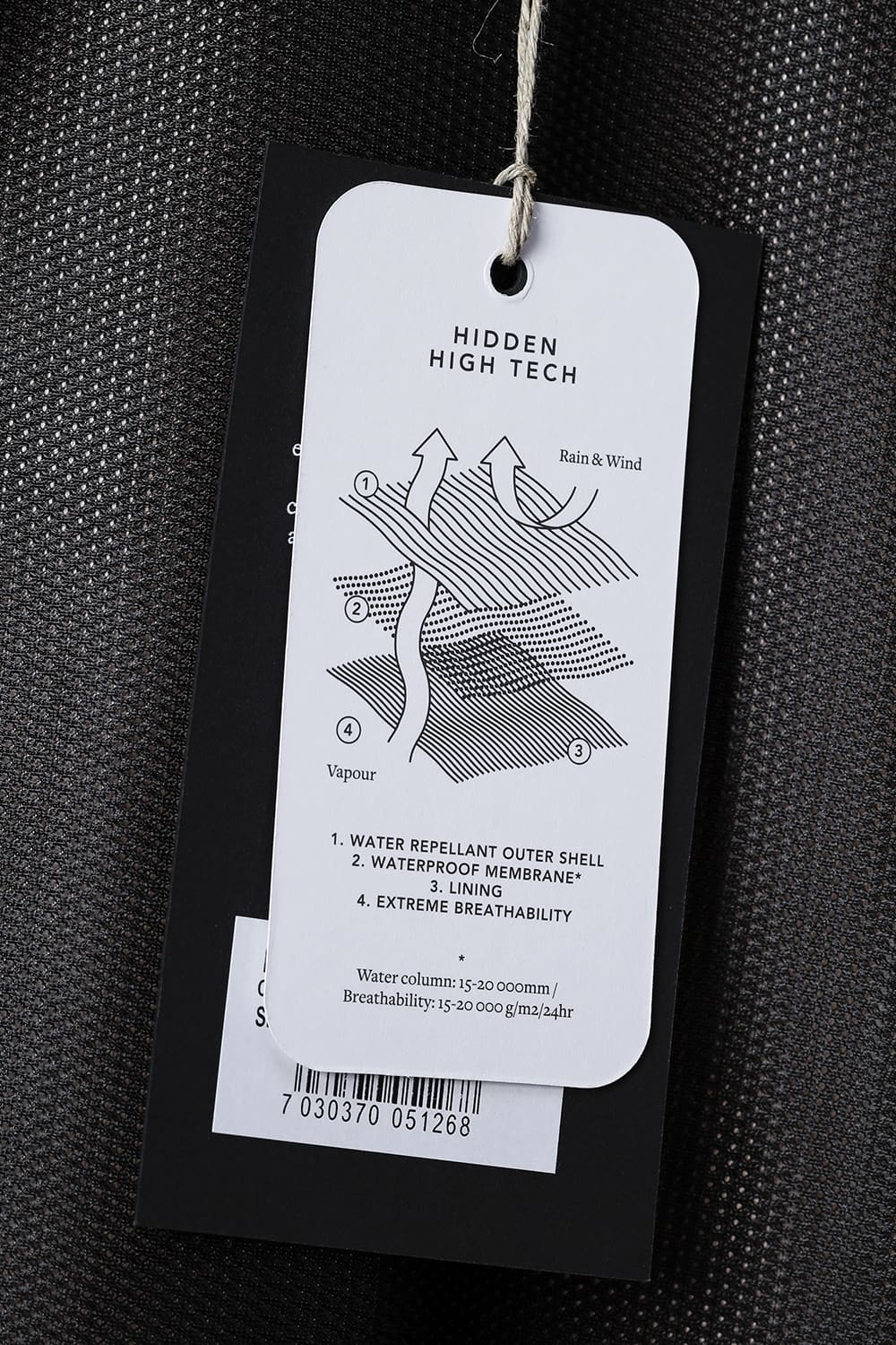 乍一看不像是防水材料的混色面料的面料,在涤纶面料上加入了防水加工,再加上尼龙薄膜的粘合,使其具有完全的防水性能,而且缝制部分采用了密封胶带进行了防水处理,因此具有与真正的户外服装相同水平的防水性能。