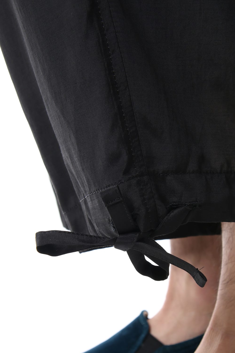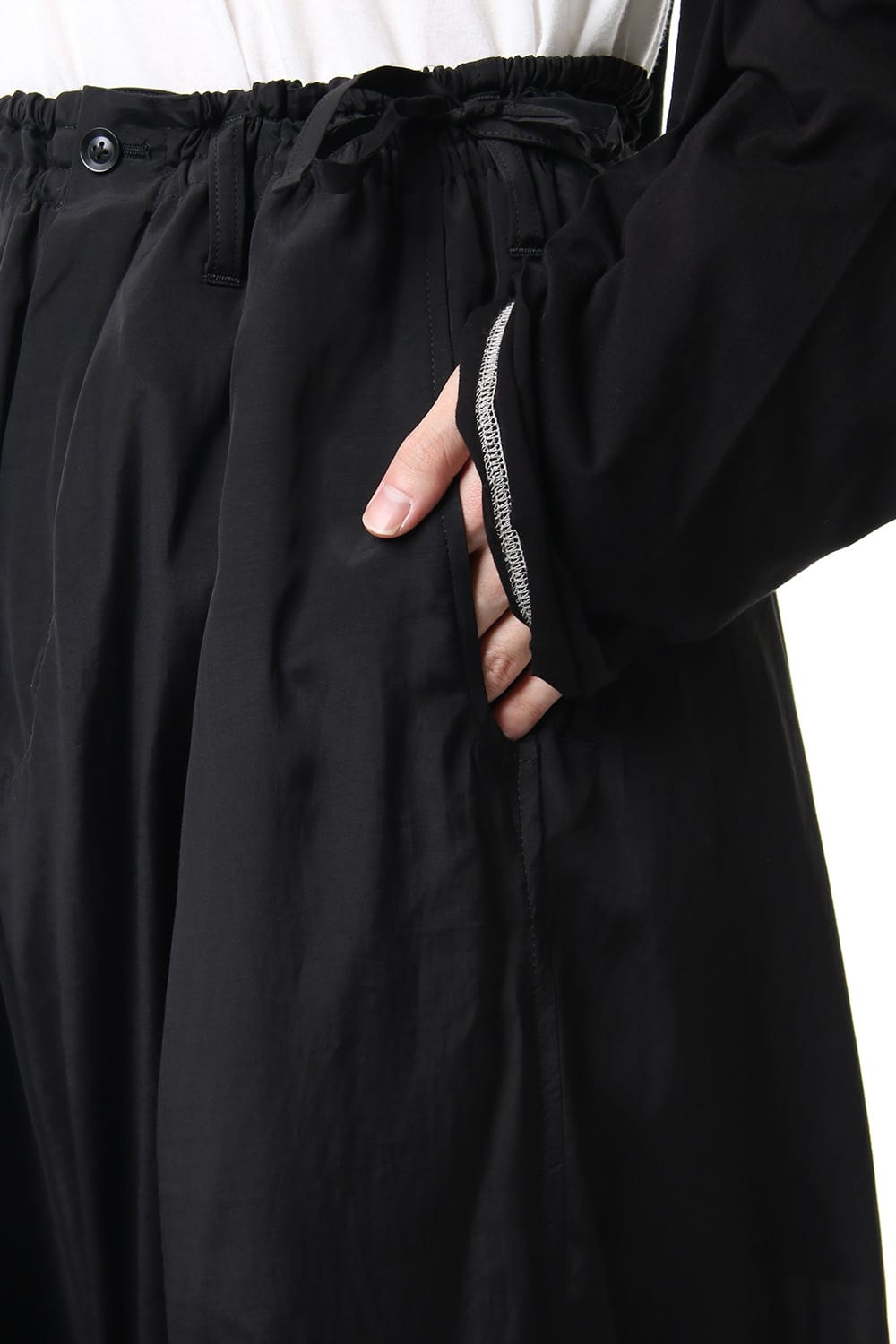 New type of crow pants with Sarouel silhouette worn during the Runway LOOK15. It is deeper than a normal pair of crow pants, as it has a drawcord at the hem, it is possible to change the width as well. The fabric uses a shiny cotton rayon poplin and it has a lightweight impression as well.