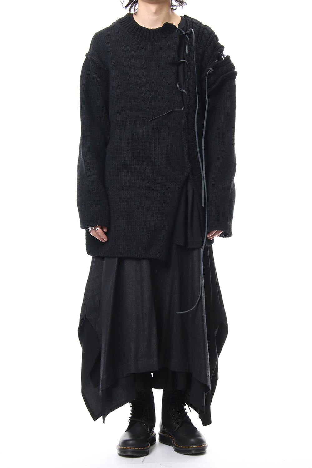 This skirt of a layered design was worn during the runway LOOK 37. It is an item you can enjoy with the different arrangements using the front buttons and zipper. it is also a remarkable item in the collection of Yohji Yamamoto this season as it has a strong genderless element.
