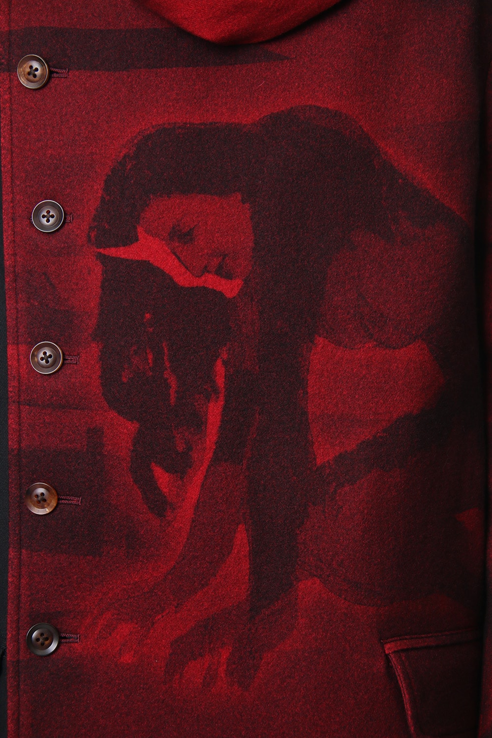 This scarf design jacket is made of the representative red flannel fabric of this season and was worn during the runway LOOK 33. By applying a moderate shrinking process, a graphic designer used advanced technology on the Flannel material and brought out the original warmth and gloss of wool, it was then printed at the factory in Kyoto.