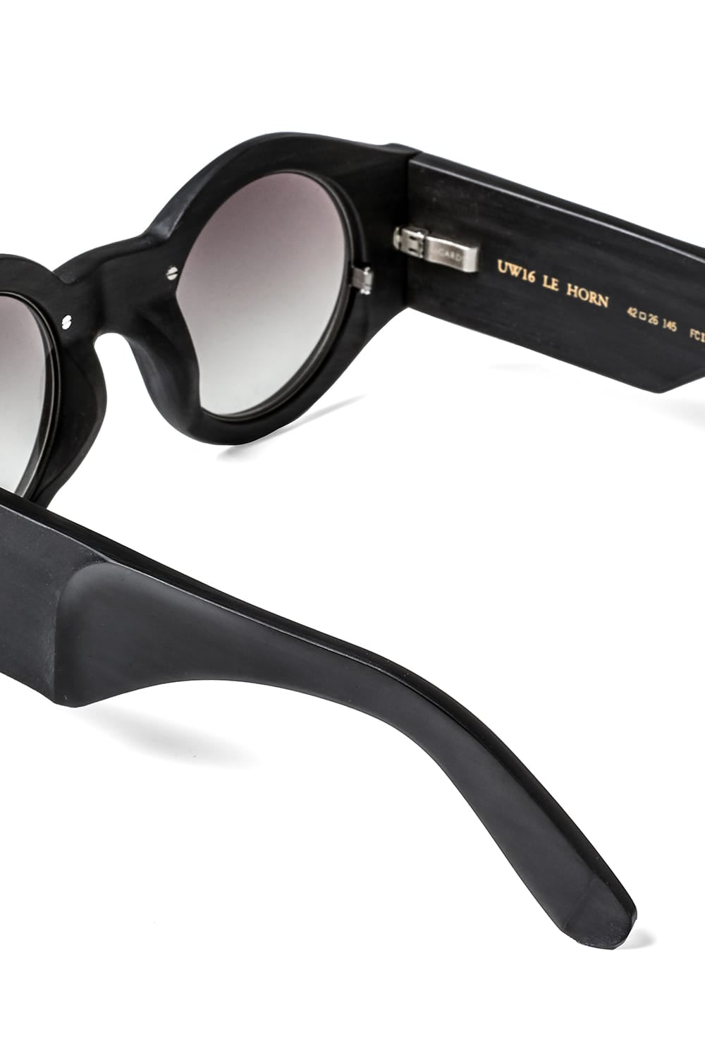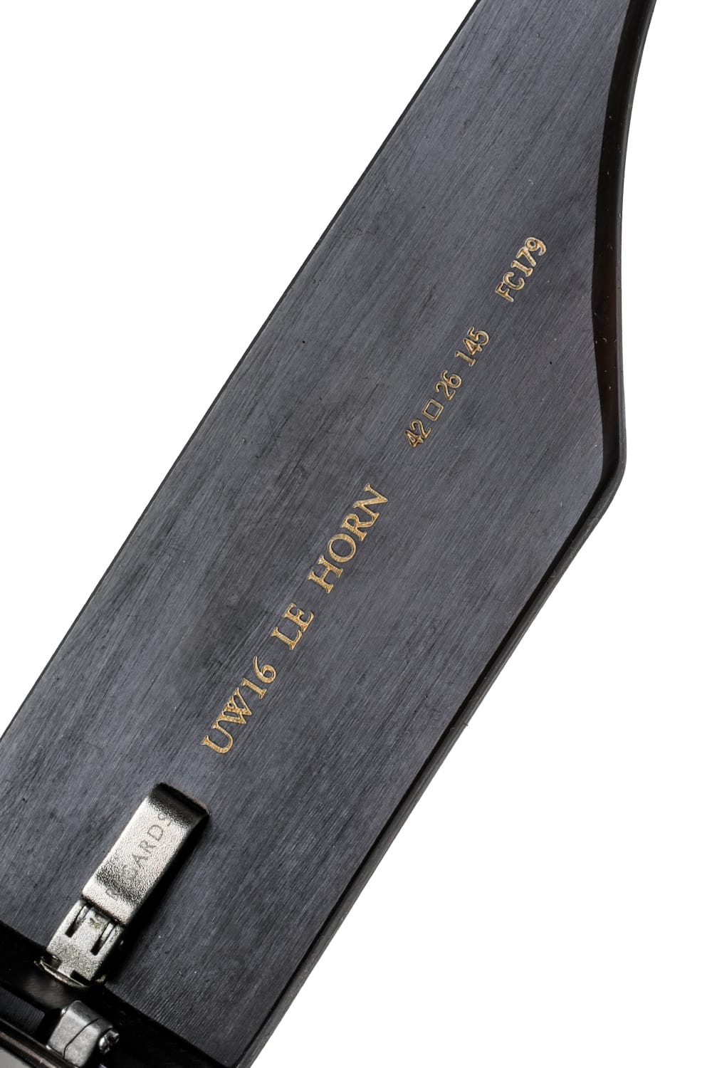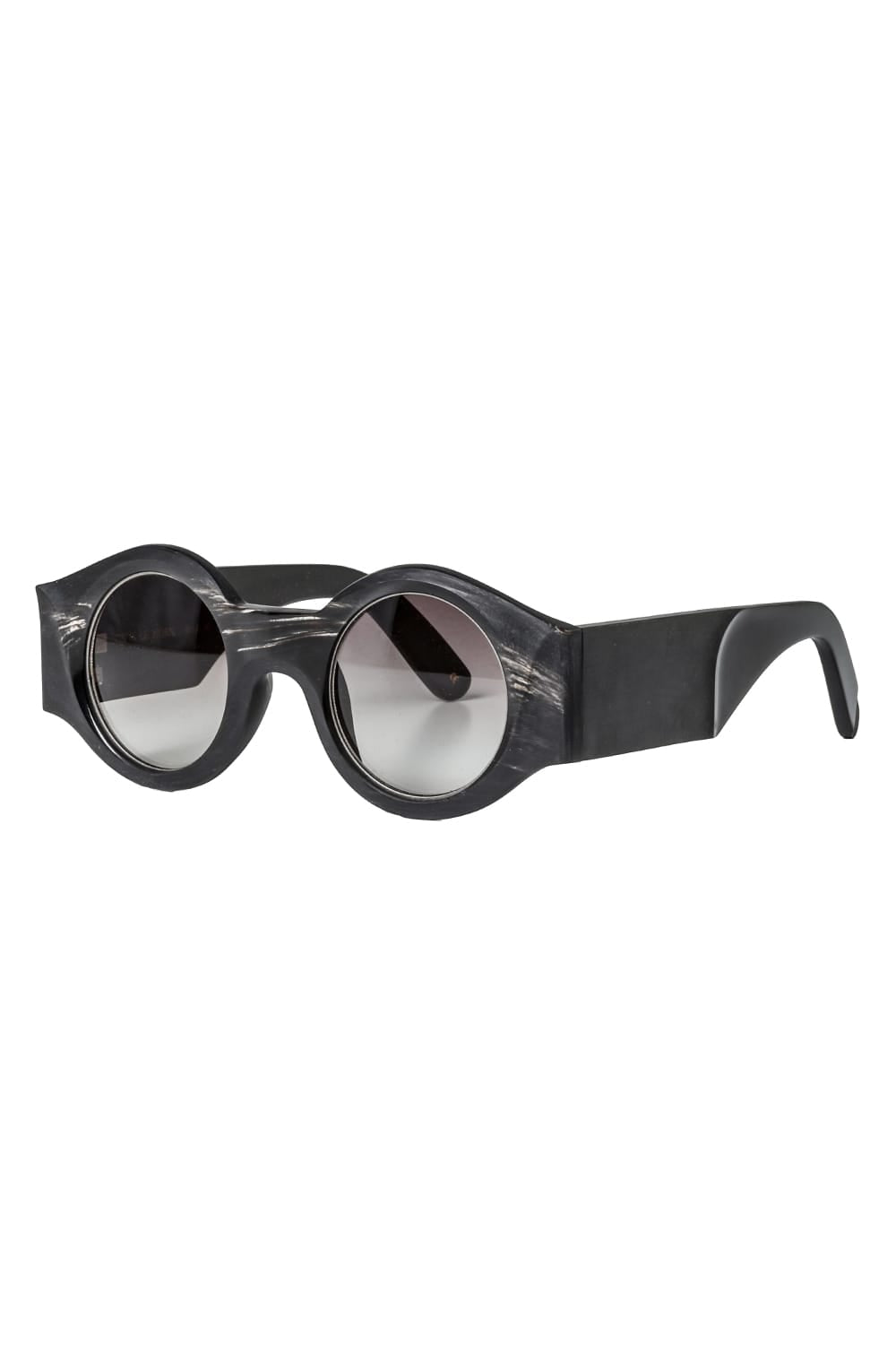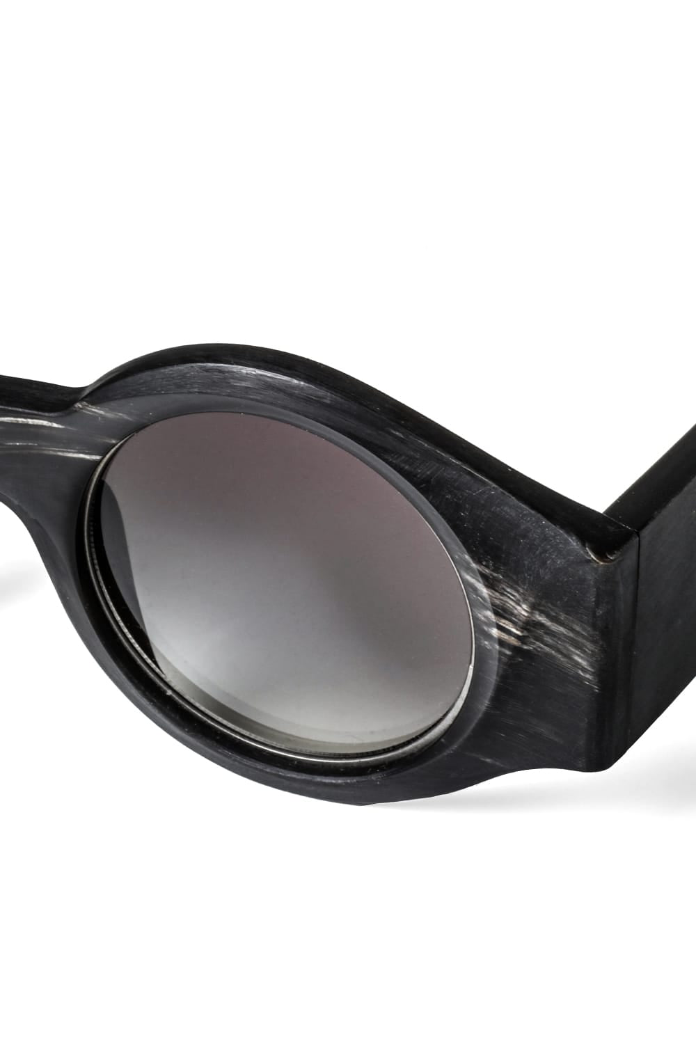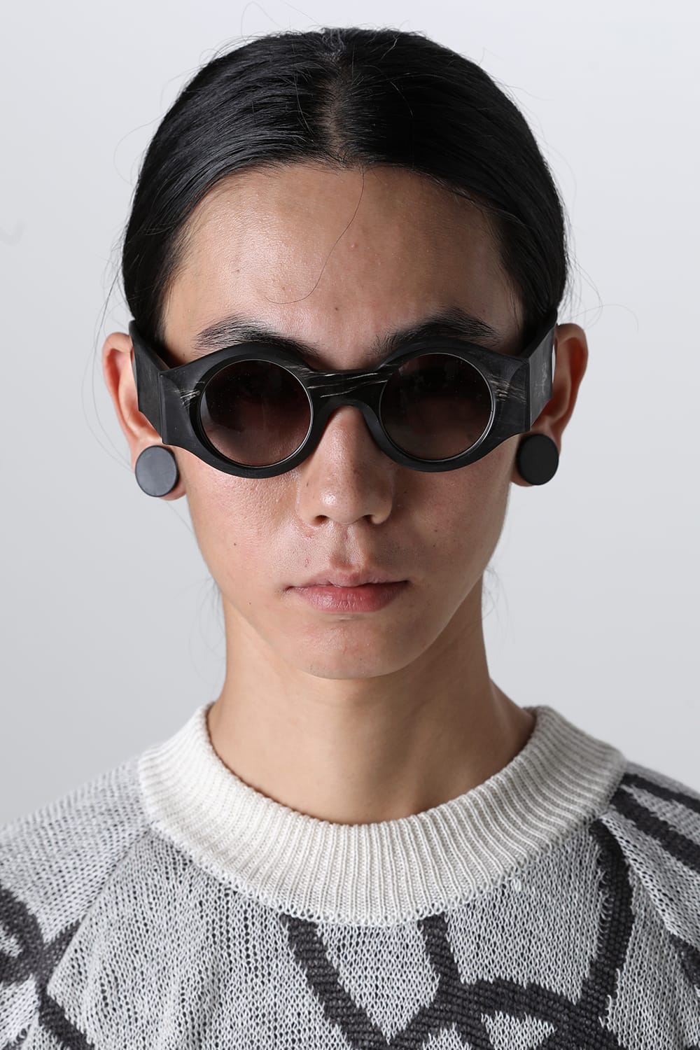 Metal parts are incorporated around the lenses, creating a unique piece where the hardness of metal coexists with the warmth of horn.