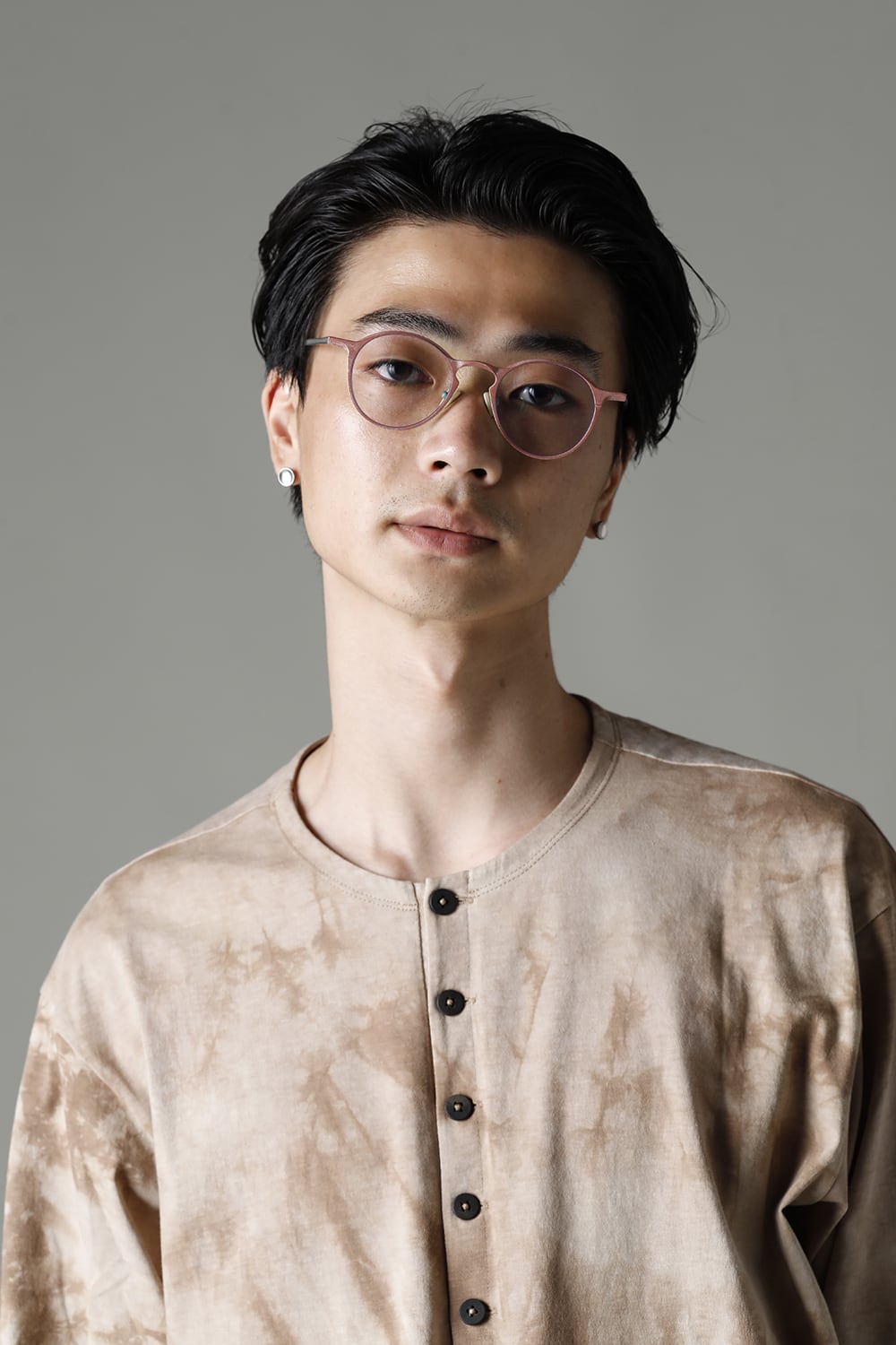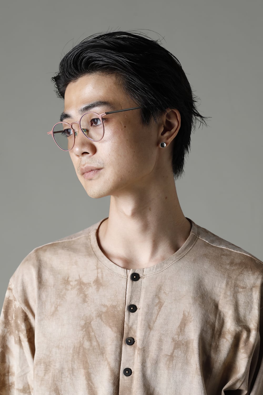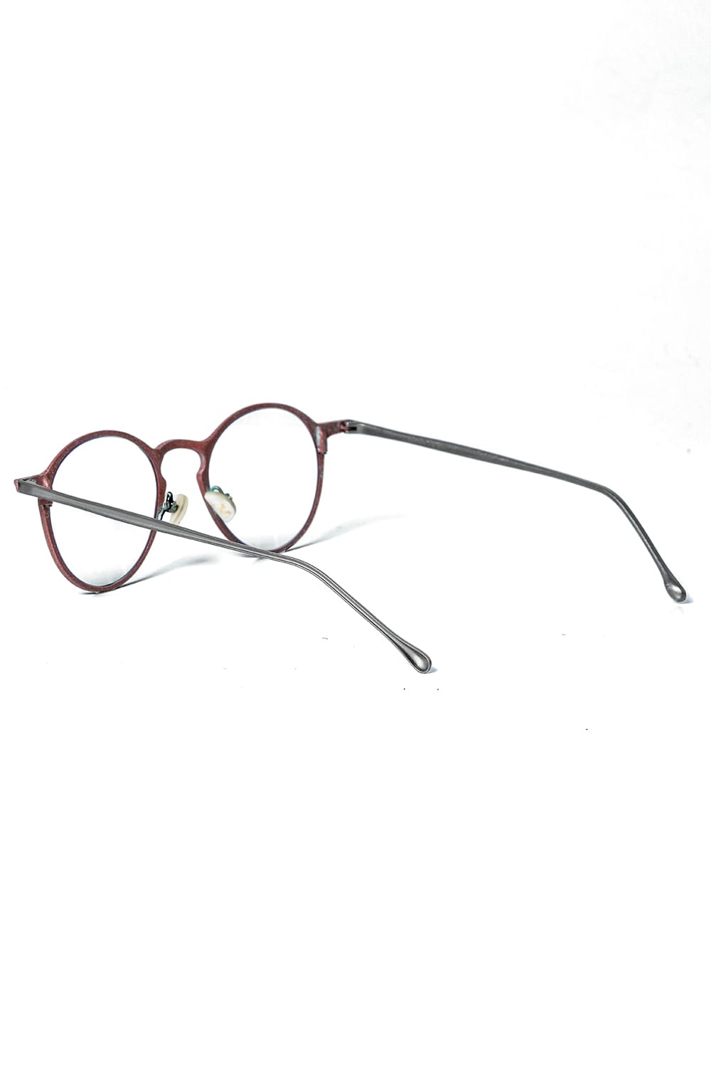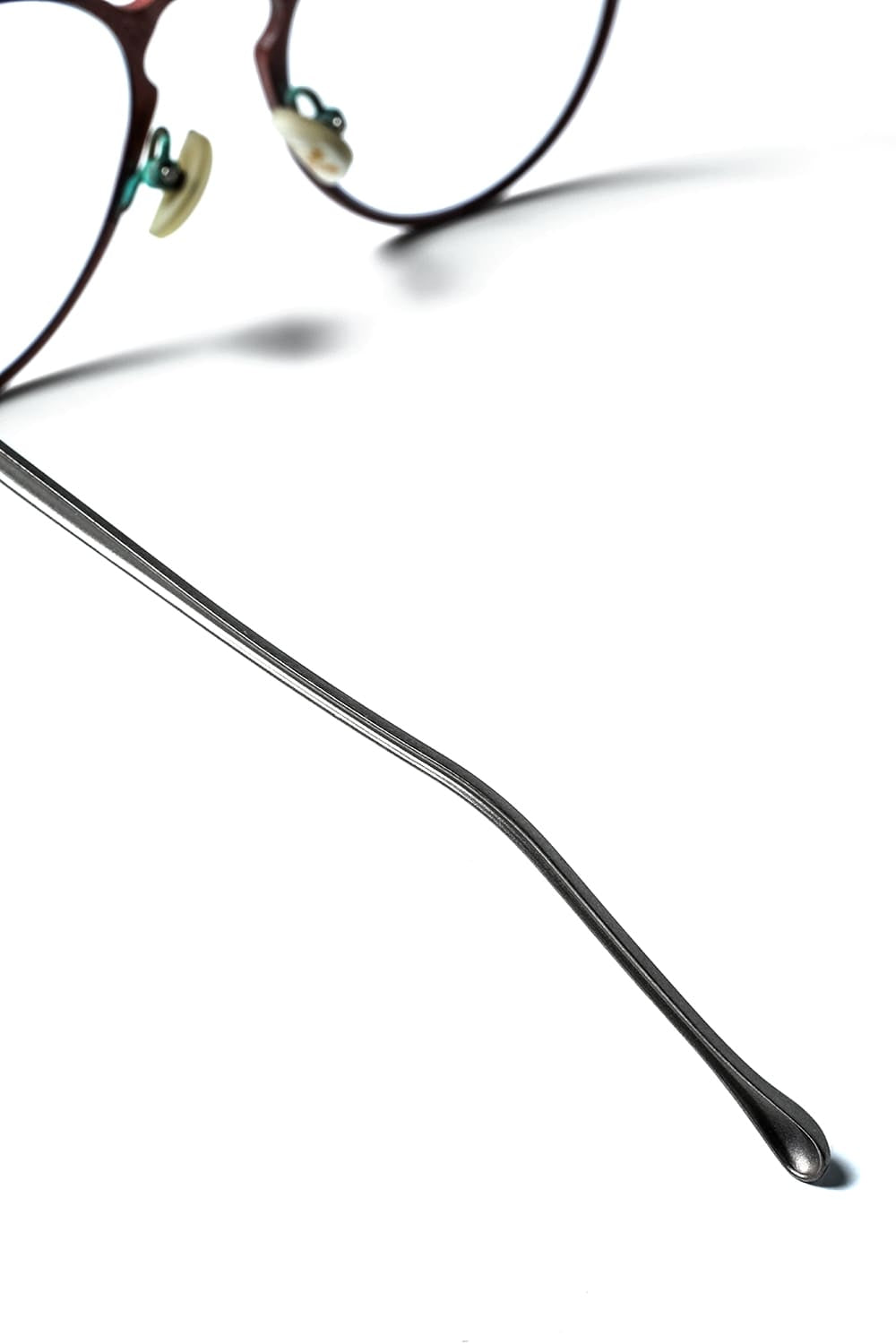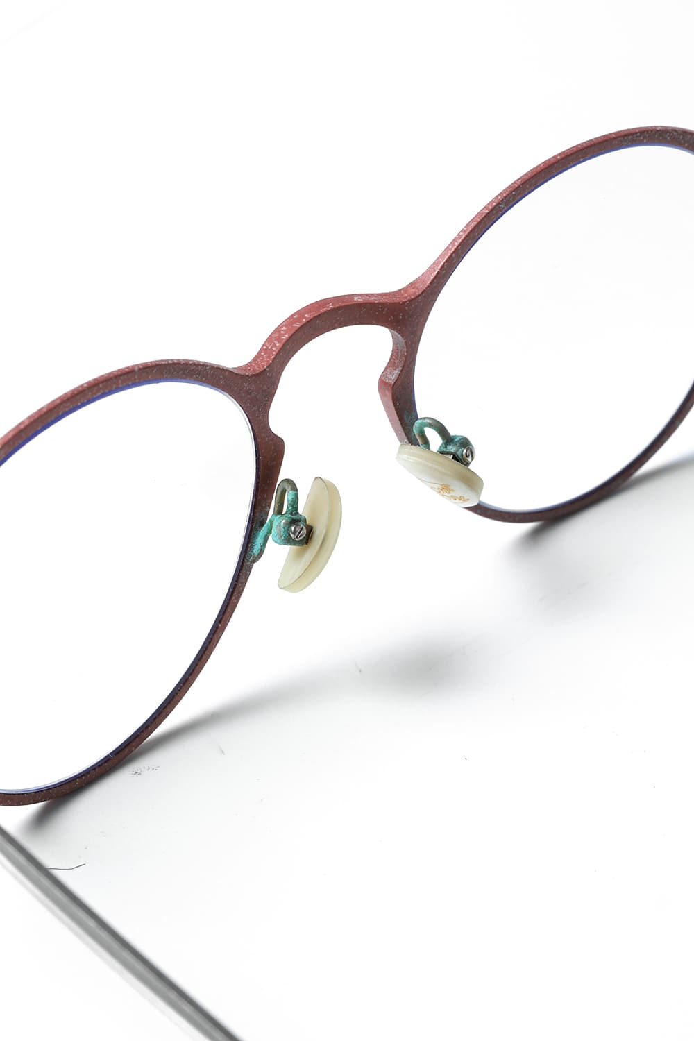 这款圆形眼镜使用了经过生锈处理的铜材。 有两种颜色,红锈和蓝锈。浸泡在独自调配的特殊药品中调整色调,浸泡时间的调整根据设计师的感觉进行,所以每一件的效果都不同。通过观察表面看起来像被烤过的纹理,您可以很好地看到差异。由于经过生锈加工后进行涂层保护,因此不太会随着时间的推移变化,您可以尽情享受它的外观。镜腿的零件是钛制的,整体上很轻。鼻垫也采用符合亚洲人的设计。因此,它具有良好的合身感和实用性。另外还附带皮套、保修卡和十字架。