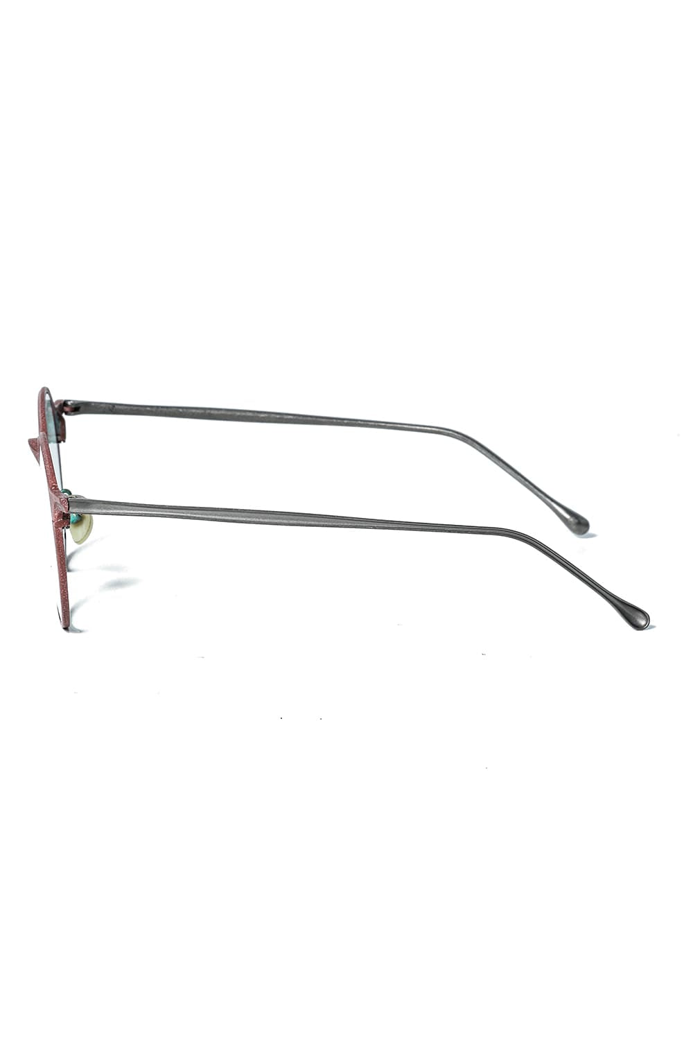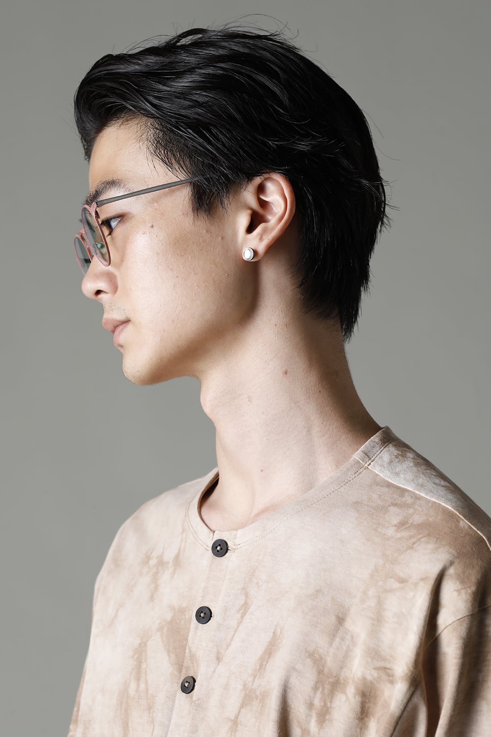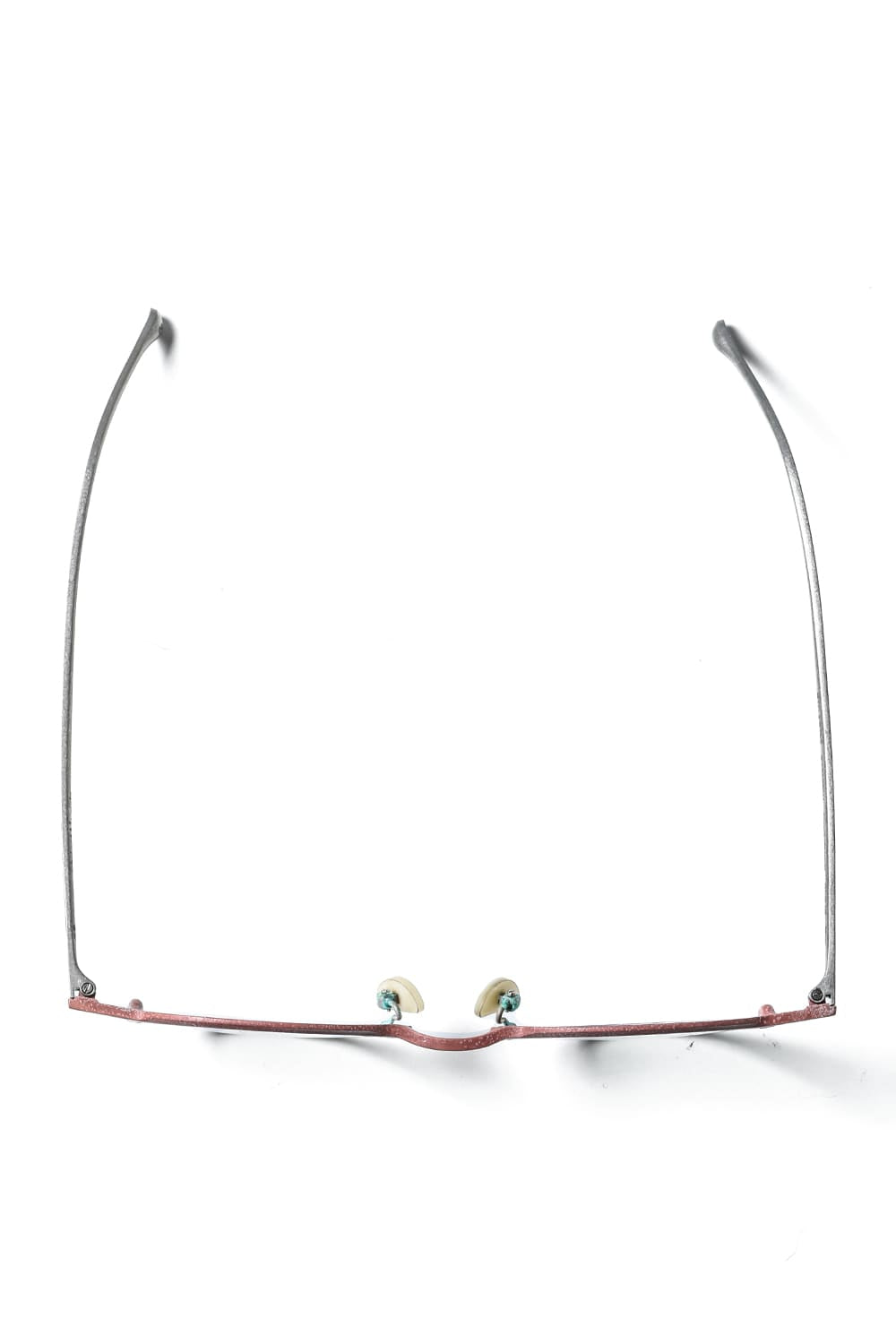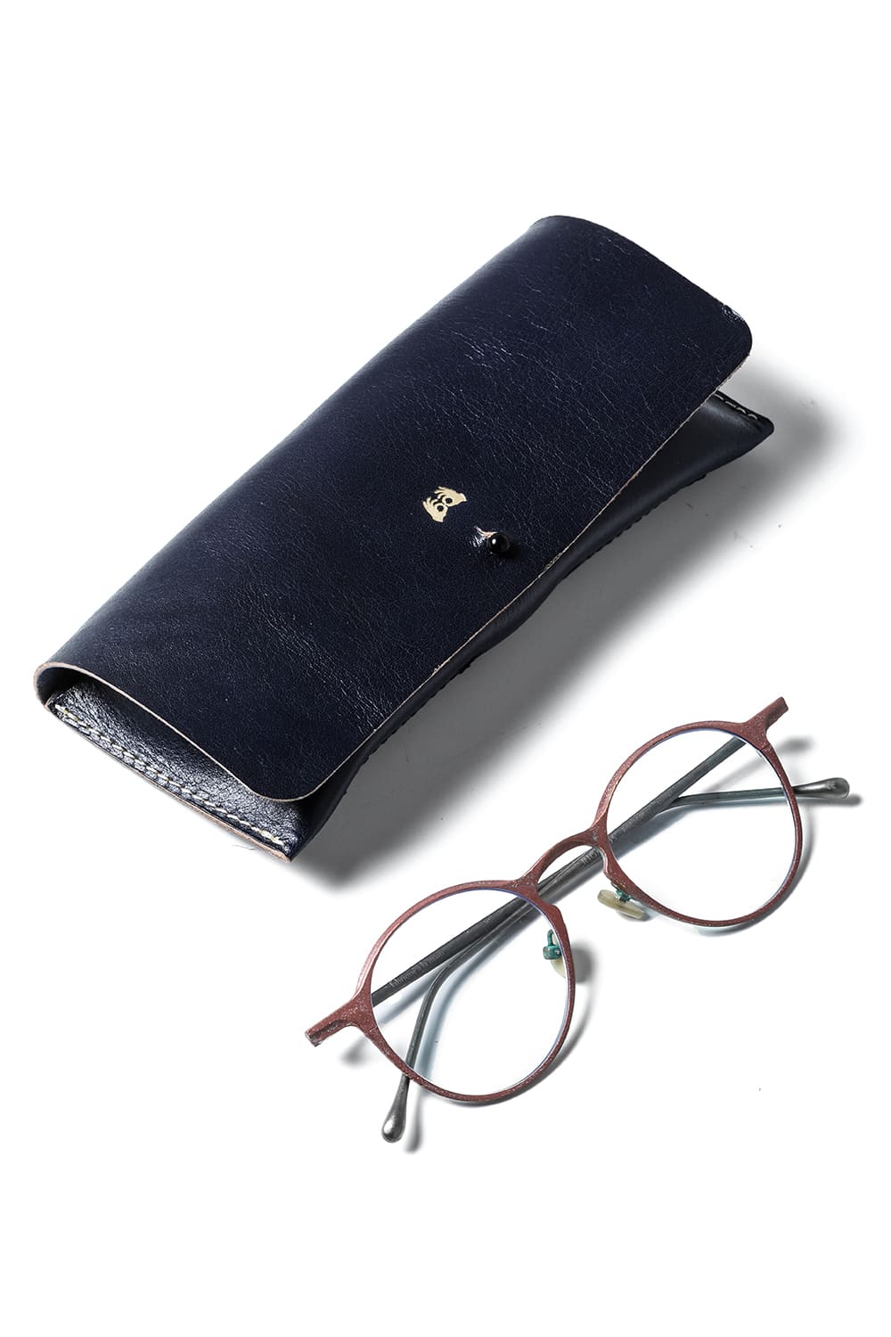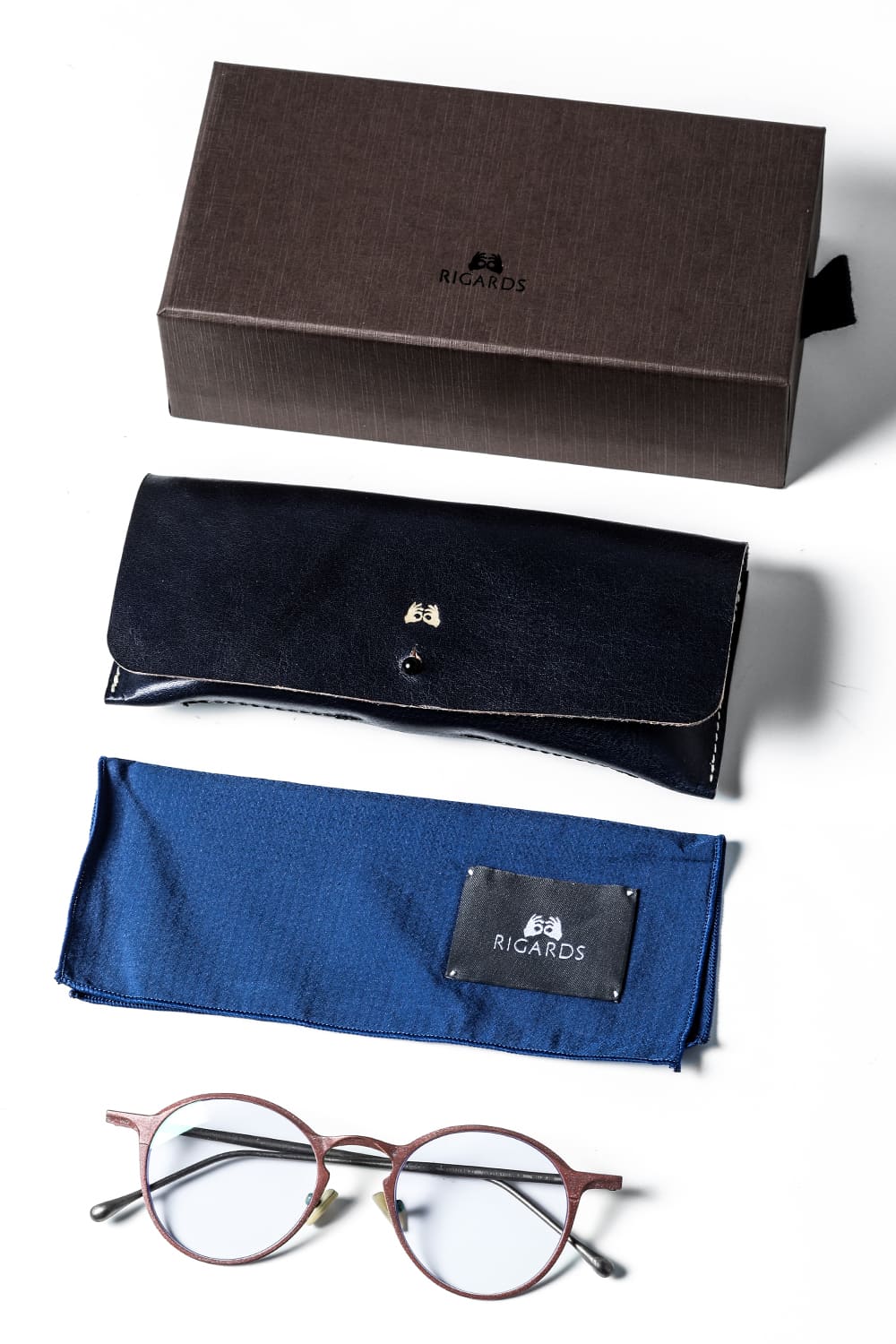 这款圆形眼镜使用了经过生锈处理的铜材。 有两种颜色,红锈和蓝锈。浸泡在独自调配的特殊药品中调整色调,浸泡时间的调整根据设计师的感觉进行,所以每一件的效果都不同。通过观察表面看起来像被烤过的纹理,您可以很好地看到差异。由于经过生锈加工后进行涂层保护,因此不太会随着时间的推移变化,您可以尽情享受它的外观。镜腿的零件是钛制的,整体上很轻。鼻垫也采用符合亚洲人的设计。因此,它具有良好的合身感和实用性。另外还附带皮套、保修卡和十字架。