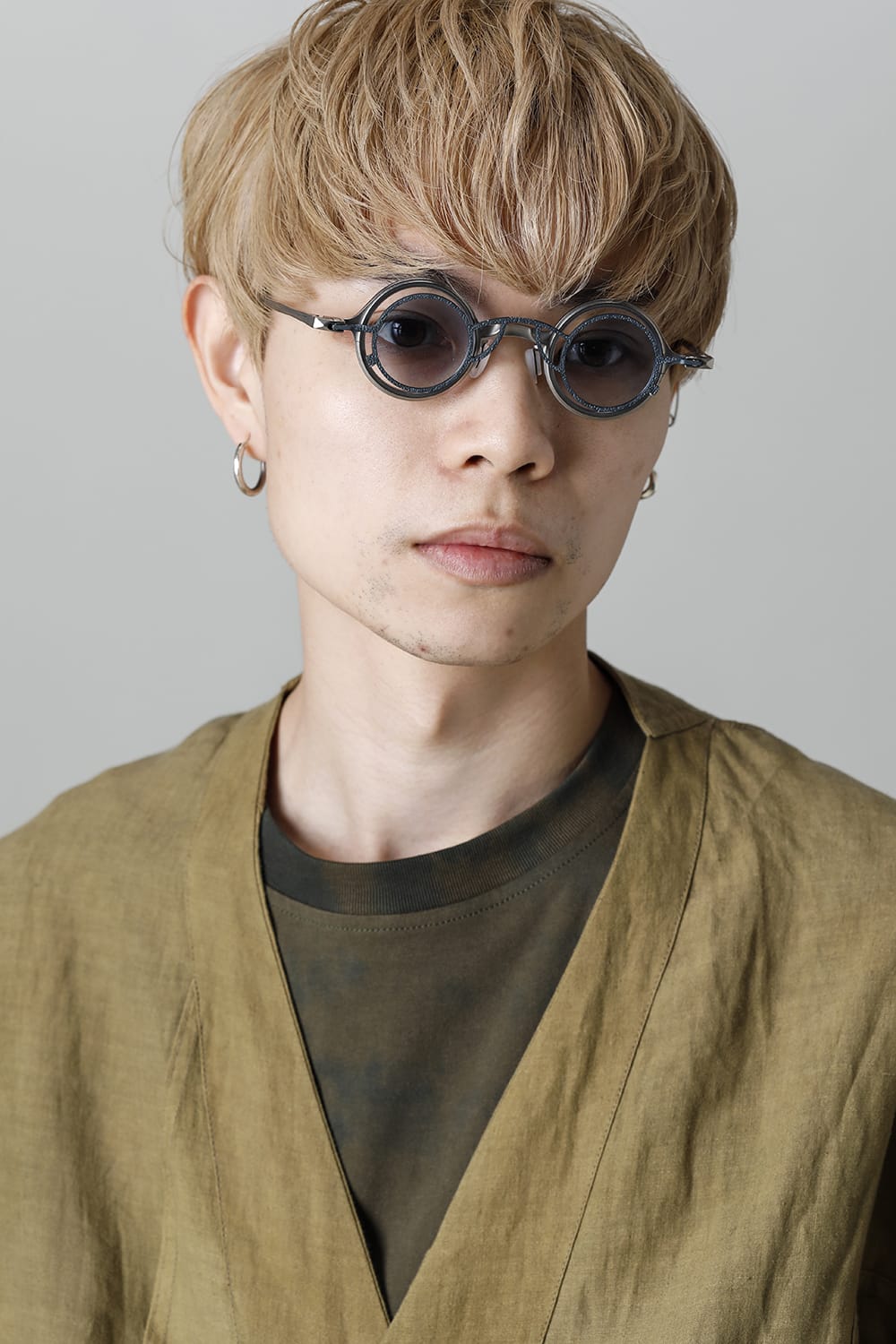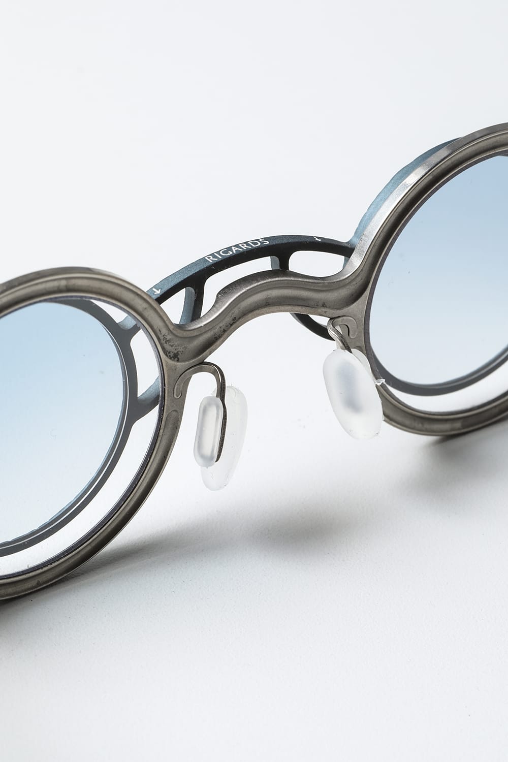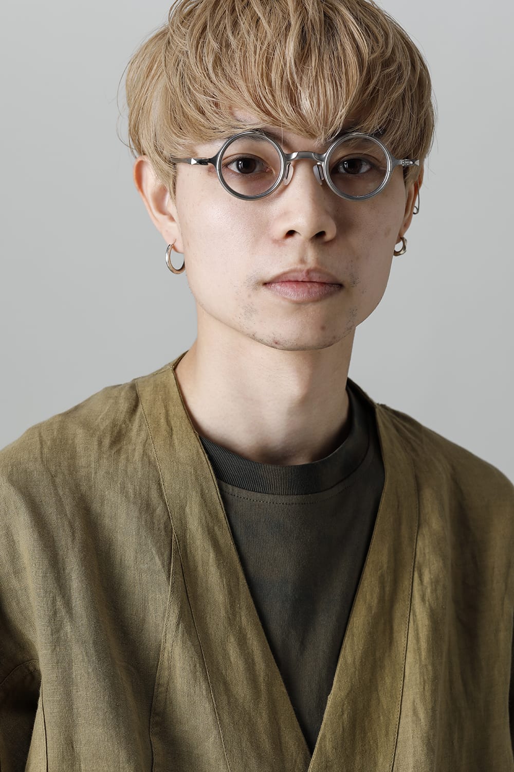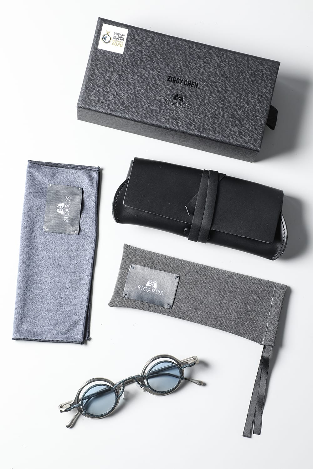 在RIGARDS的金属框架系列中给人留下深刻印象的一款ZIGGY CHEN合作商品“Mad Scientist”。以让人联想到古董眼镜的古典款式的圆形铜框为基础,具有近代印象的2way磁吸式设计为特点。由于磁吸设计,带给穿着者带来不可思议的神秘印象的框架设计,可以说是现在RIGARDS眼镜的主要形象之一。镜框整体采用了钛,与铜制材料的模型相比,外观比较素雅,也减轻了铜制镜框的重量问题,因此作为实用性较高的模型推出。另外,磁吸部分的框架与主体框架的素雅风格完全相反,进行了凹凸不平的纹理加工,是一款可以享受对比的商品。鼻垫部分使用了柔软的橡胶面料,穿起来非常舒适。