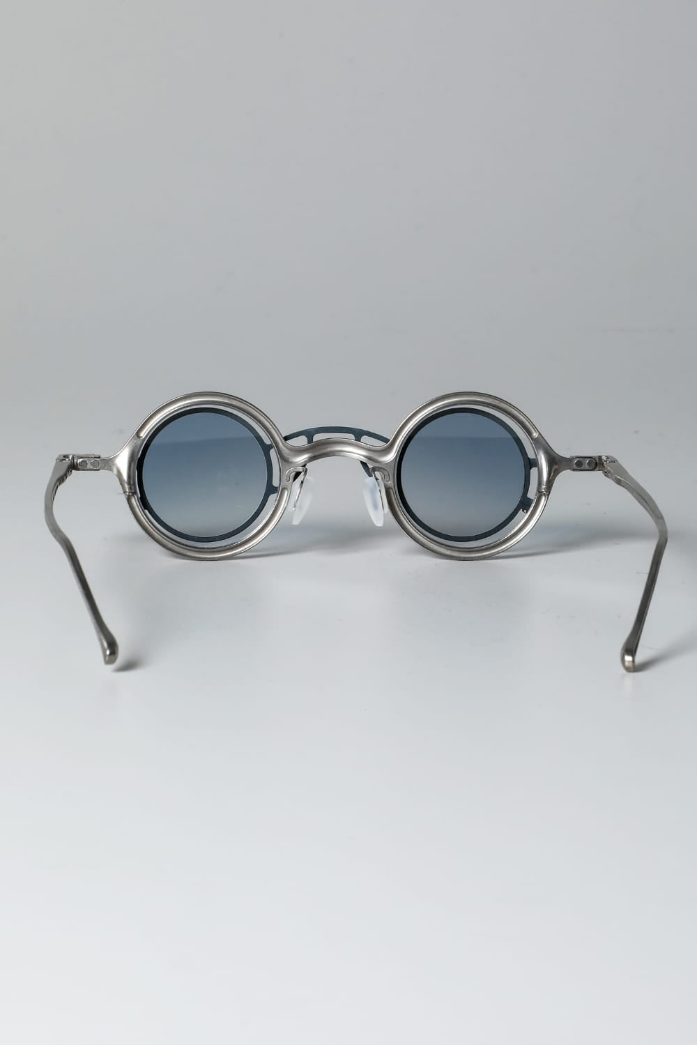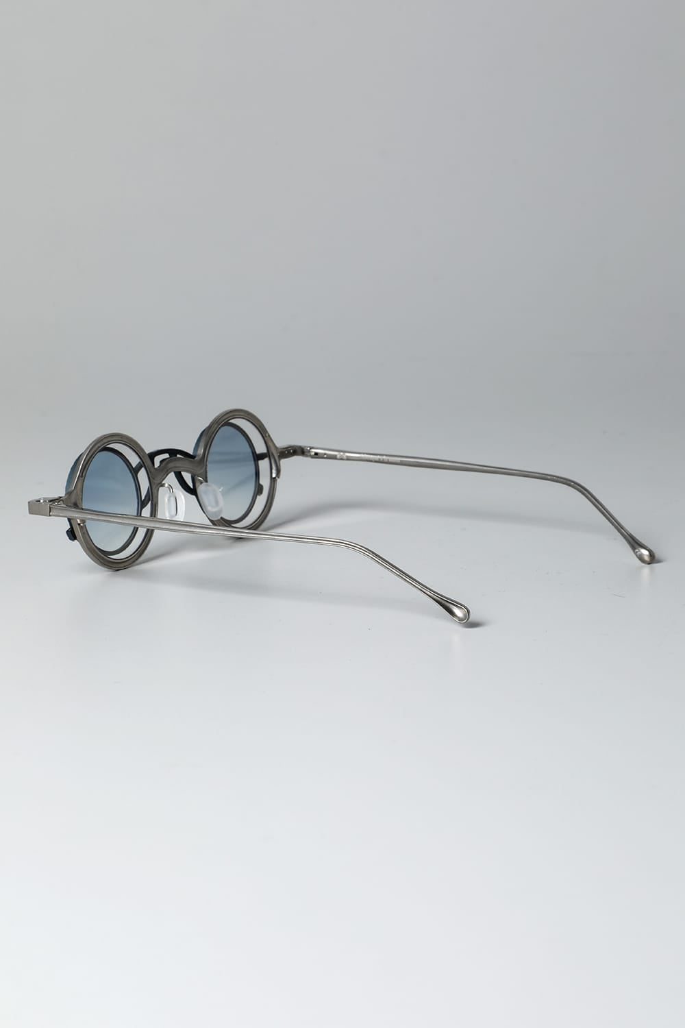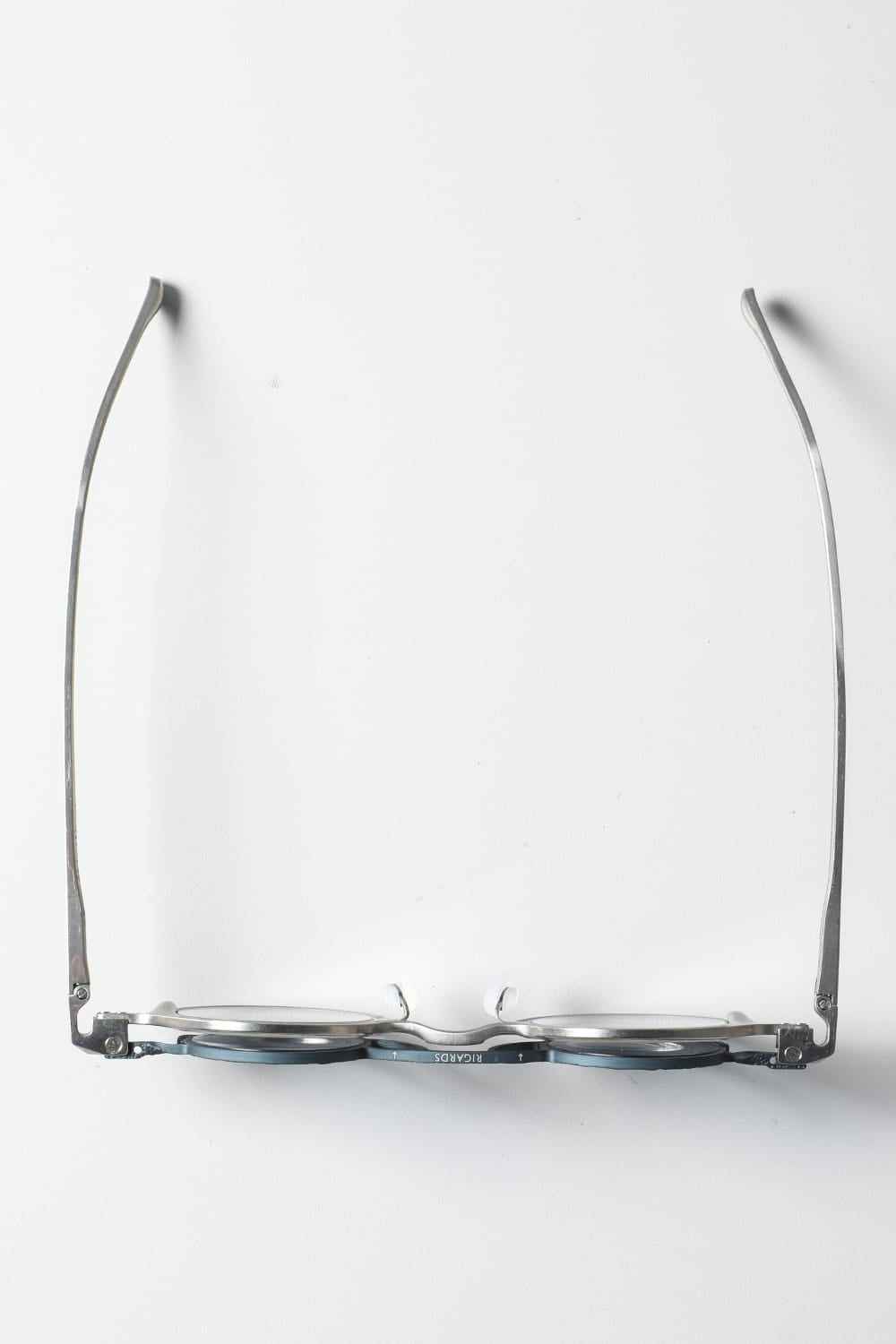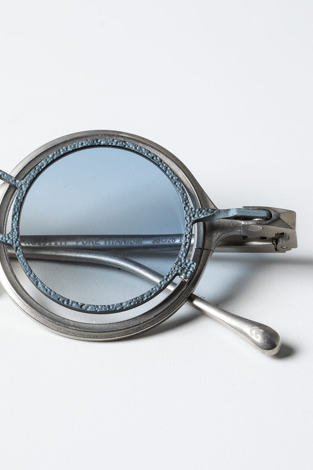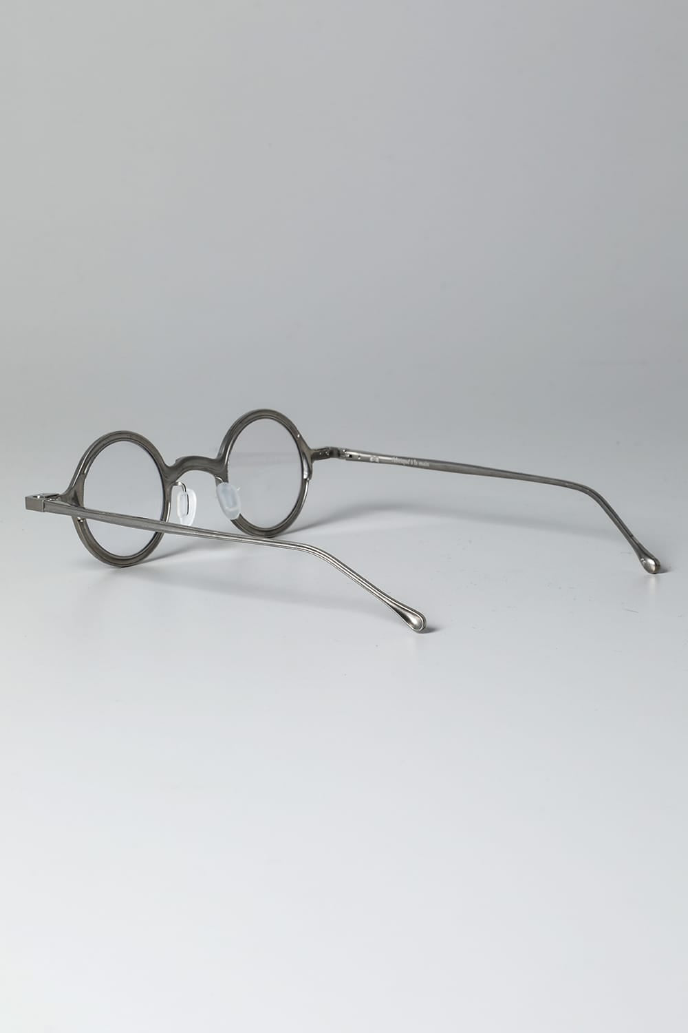 在RIGARDS的金属框架系列中给人留下深刻印象的一款ZIGGY CHEN合作商品“Mad Scientist”。以让人联想到古董眼镜的古典款式的圆形铜框为基础,具有近代印象的2way磁吸式设计为特点。由于磁吸设计,带给穿着者带来不可思议的神秘印象的框架设计,可以说是现在RIGARDS眼镜的主要形象之一。镜框整体采用了钛,与铜制材料的模型相比,外观比较素雅,也减轻了铜制镜框的重量问题,因此作为实用性较高的模型推出。另外,磁吸部分的框架与主体框架的素雅风格完全相反,进行了凹凸不平的纹理加工,是一款可以享受对比的商品。鼻垫部分使用了柔软的橡胶面料,穿起来非常舒适。