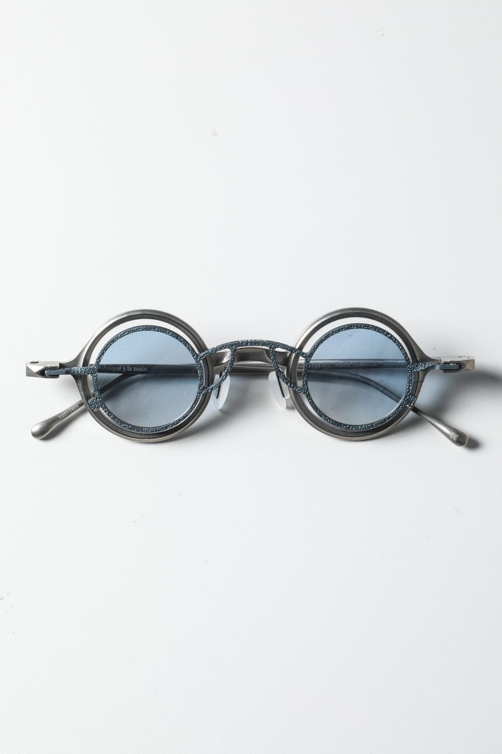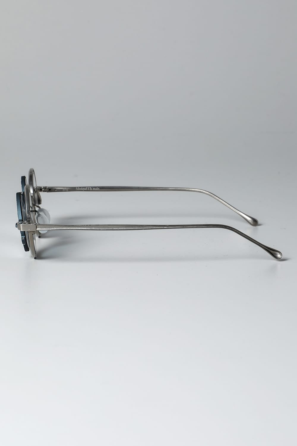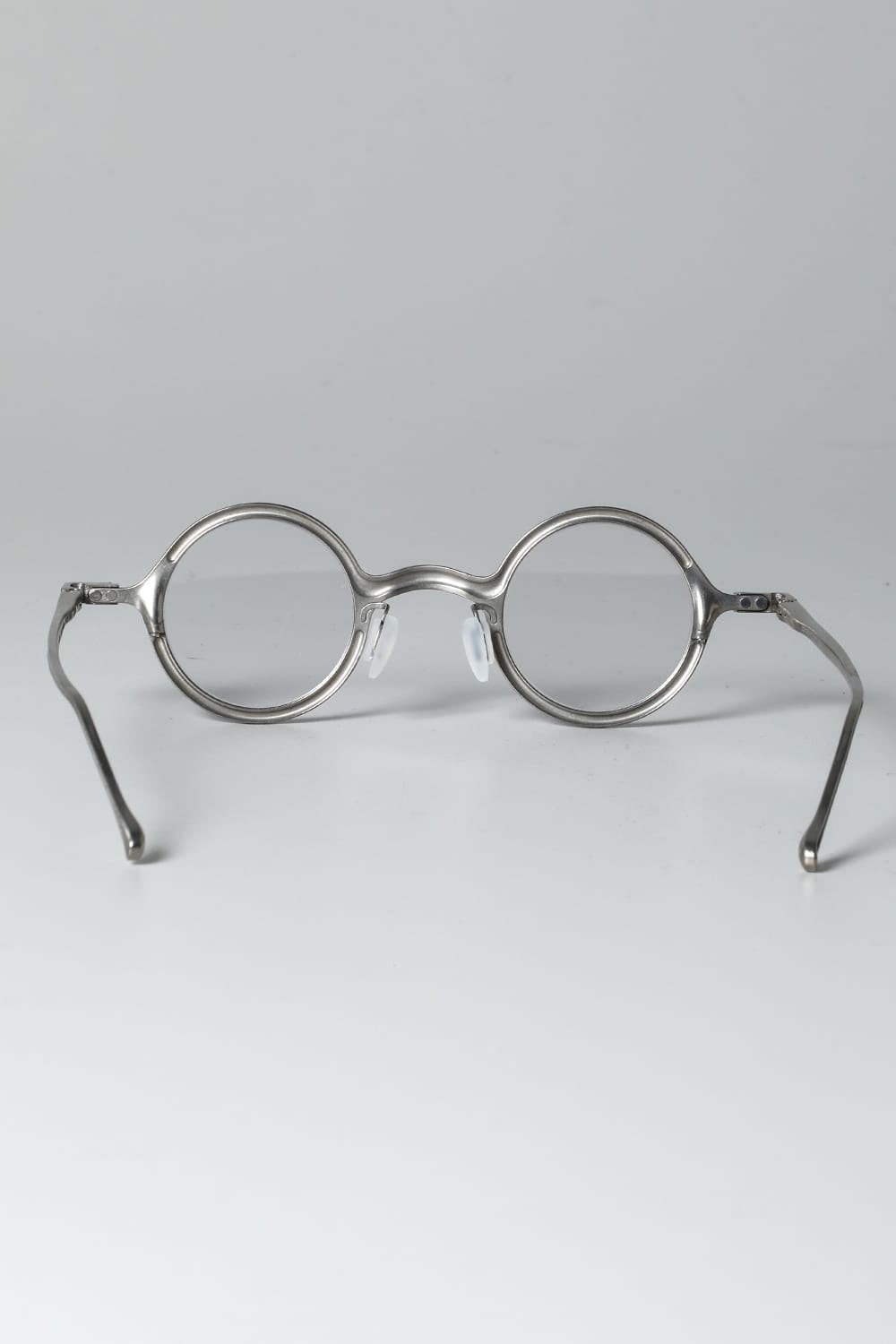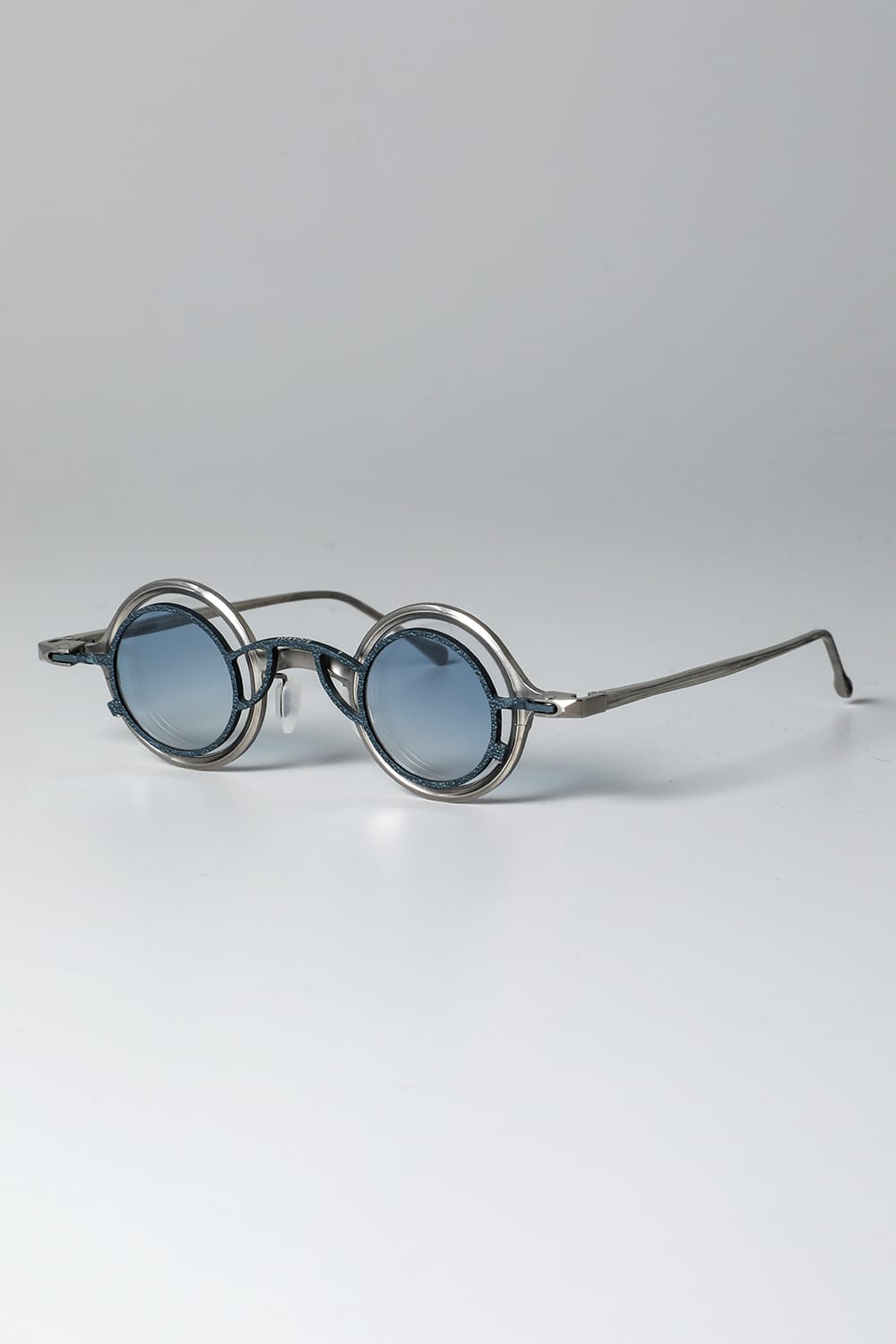 在RIGARDS的金属框架系列中给人留下深刻印象的一款ZIGGY CHEN合作商品“Mad Scientist”。以让人联想到古董眼镜的古典款式的圆形铜框为基础,具有近代印象的2way磁吸式设计为特点。由于磁吸设计,带给穿着者带来不可思议的神秘印象的框架设计,可以说是现在RIGARDS眼镜的主要形象之一。镜框整体采用了钛,与铜制材料的模型相比,外观比较素雅,也减轻了铜制镜框的重量问题,因此作为实用性较高的模型推出。另外,磁吸部分的框架与主体框架的素雅风格完全相反,进行了凹凸不平的纹理加工,是一款可以享受对比的商品。鼻垫部分使用了柔软的橡胶面料,穿起来非常舒适。