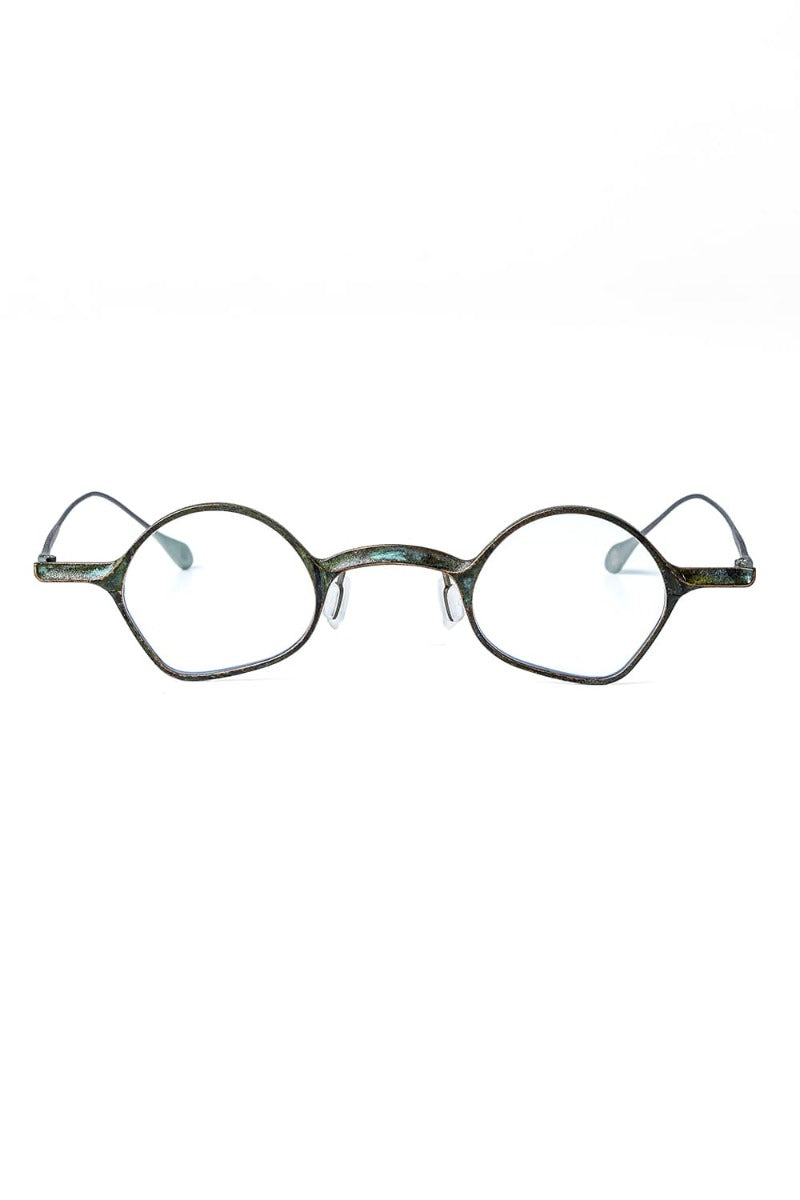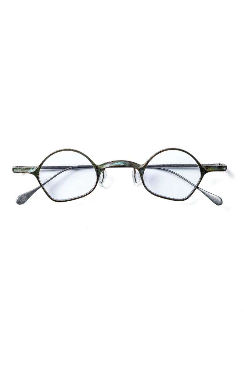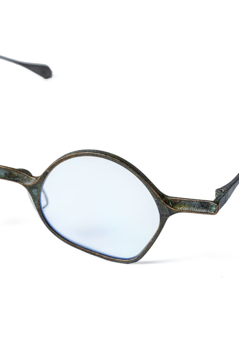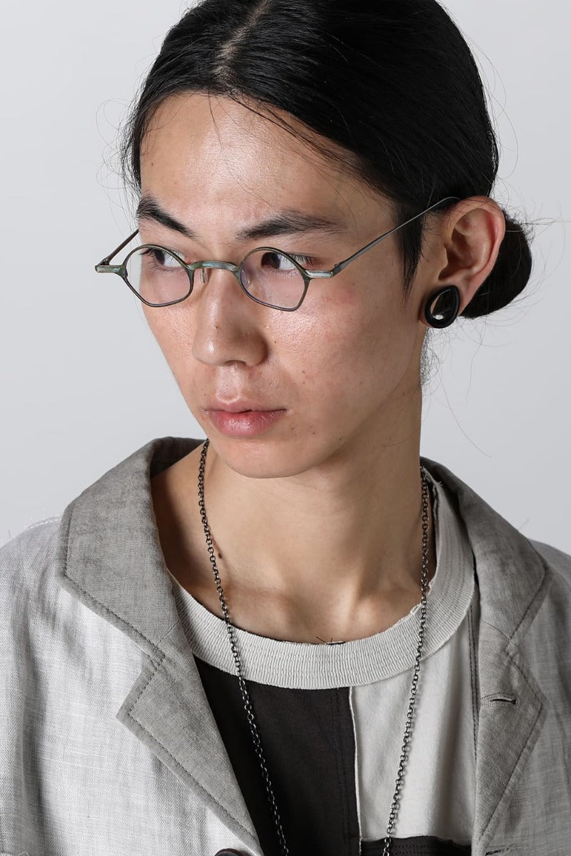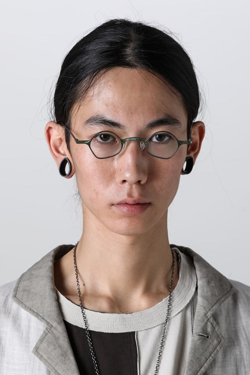 小巧的异形全框眼镜。边缘下部设计有棱角,给椭圆形增添了韵味,是一款与众不同的单品。这款单品经过工匠的手精心研磨,具有粗糙的质感,洋溢着匠心。颜色有两种规格,暗金 (+透明镜片) 和大胆腐蚀处理的蓝锈 (+透明镜片) 。经过生锈加工,浸泡在独自调配的特殊药品中调整颜色,由于浸泡时间是按照设计师的感觉进行的,所以每一件都有着不同的感觉。仿佛被自然侵蚀一般的表情,让人联想到日本的侘寂,趣味颇深。经过生锈加工后, 表面进行了涂层保护,因此随着时间的推移也不太会变化,您可以尽情享受这种原汁原味的感觉。