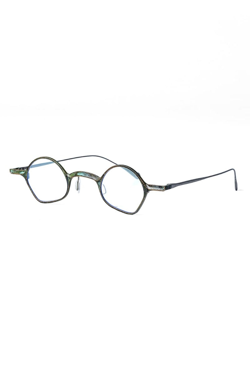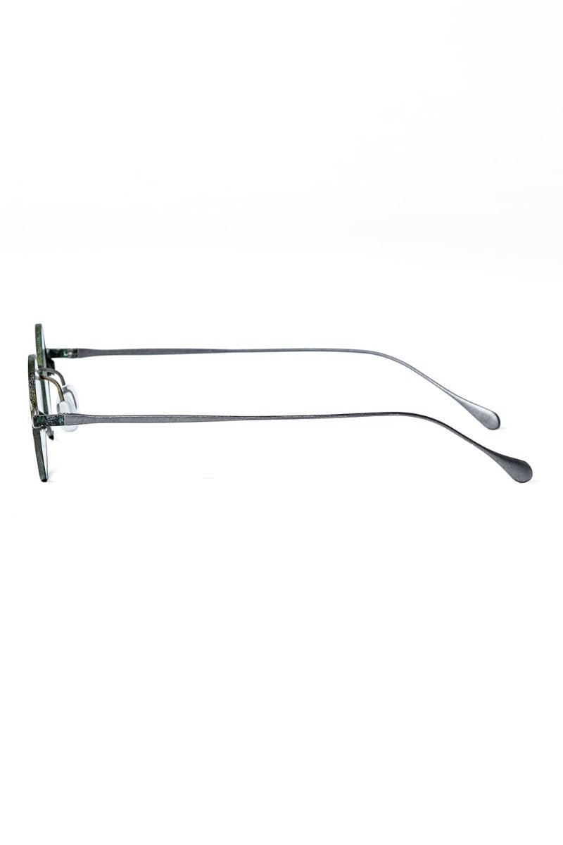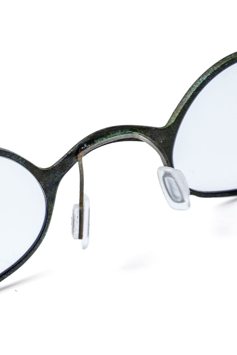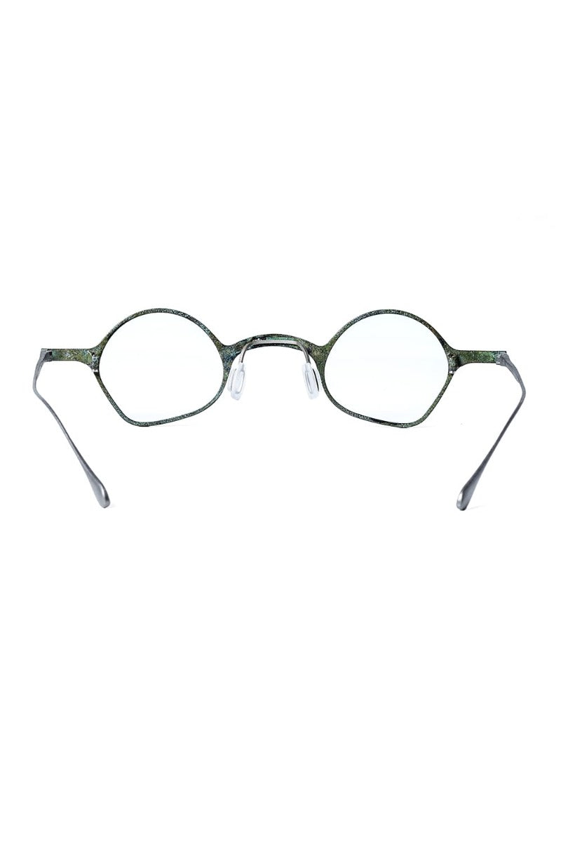 小巧的异形全框眼镜。边缘下部设计有棱角,给椭圆形增添了韵味,是一款与众不同的单品。这款单品经过工匠的手精心研磨,具有粗糙的质感,洋溢着匠心。颜色有两种规格,暗金 (+透明镜片) 和大胆腐蚀处理的蓝锈 (+透明镜片) 。经过生锈加工,浸泡在独自调配的特殊药品中调整颜色,由于浸泡时间是按照设计师的感觉进行的,所以每一件都有着不同的感觉。仿佛被自然侵蚀一般的表情,让人联想到日本的侘寂,趣味颇深。经过生锈加工后, 表面进行了涂层保护,因此随着时间的推移也不太会变化,您可以尽情享受这种原汁原味的感觉。