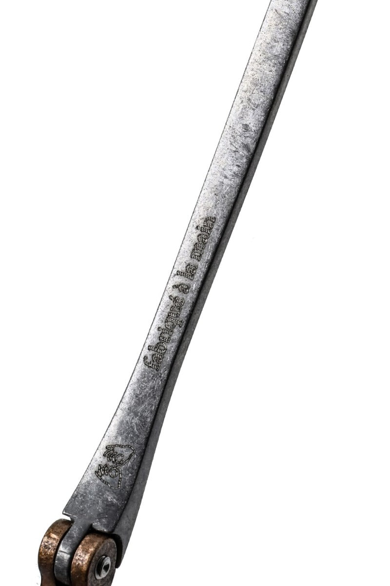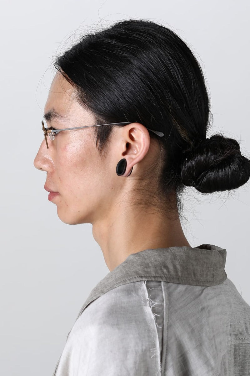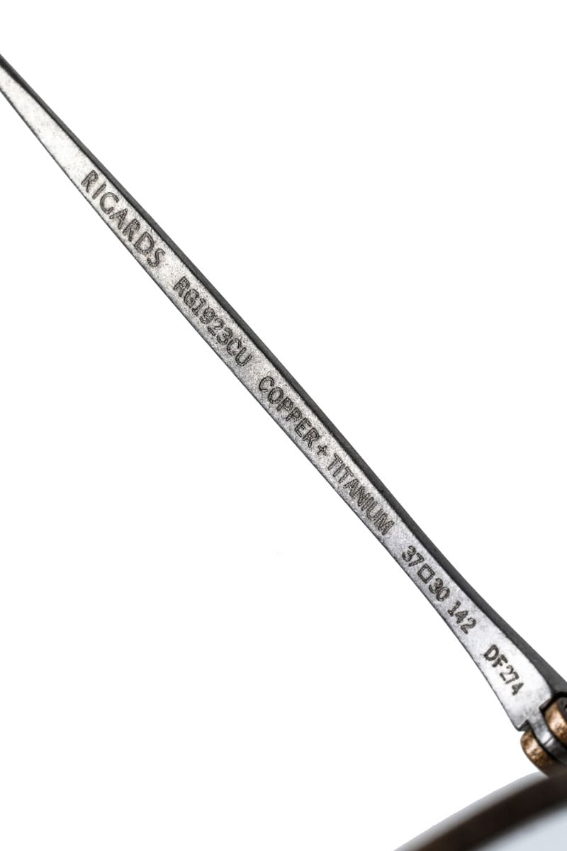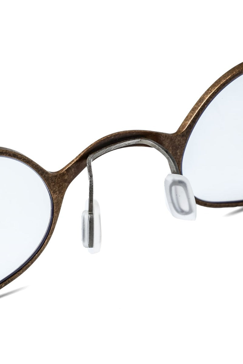 小巧的异形全框眼镜。边缘下部设计有棱角,给椭圆形增添了韵味,是一款与众不同的单品。这款单品经过工匠的手精心研磨,具有粗糙的质感,洋溢着匠心。颜色有两种规格,暗金 (+透明镜片) 和大胆腐蚀处理的蓝锈 (+透明镜片) 。经过生锈加工,浸泡在独自调配的特殊药品中调整颜色,由于浸泡时间是按照设计师的感觉进行的,所以每一件都有着不同的感觉。仿佛被自然侵蚀一般的表情,让人联想到日本的侘寂,趣味颇深。经过生锈加工后, 表面进行了涂层保护,因此随着时间的推移也不太会变化,您可以尽情享受这种原汁原味的感觉。