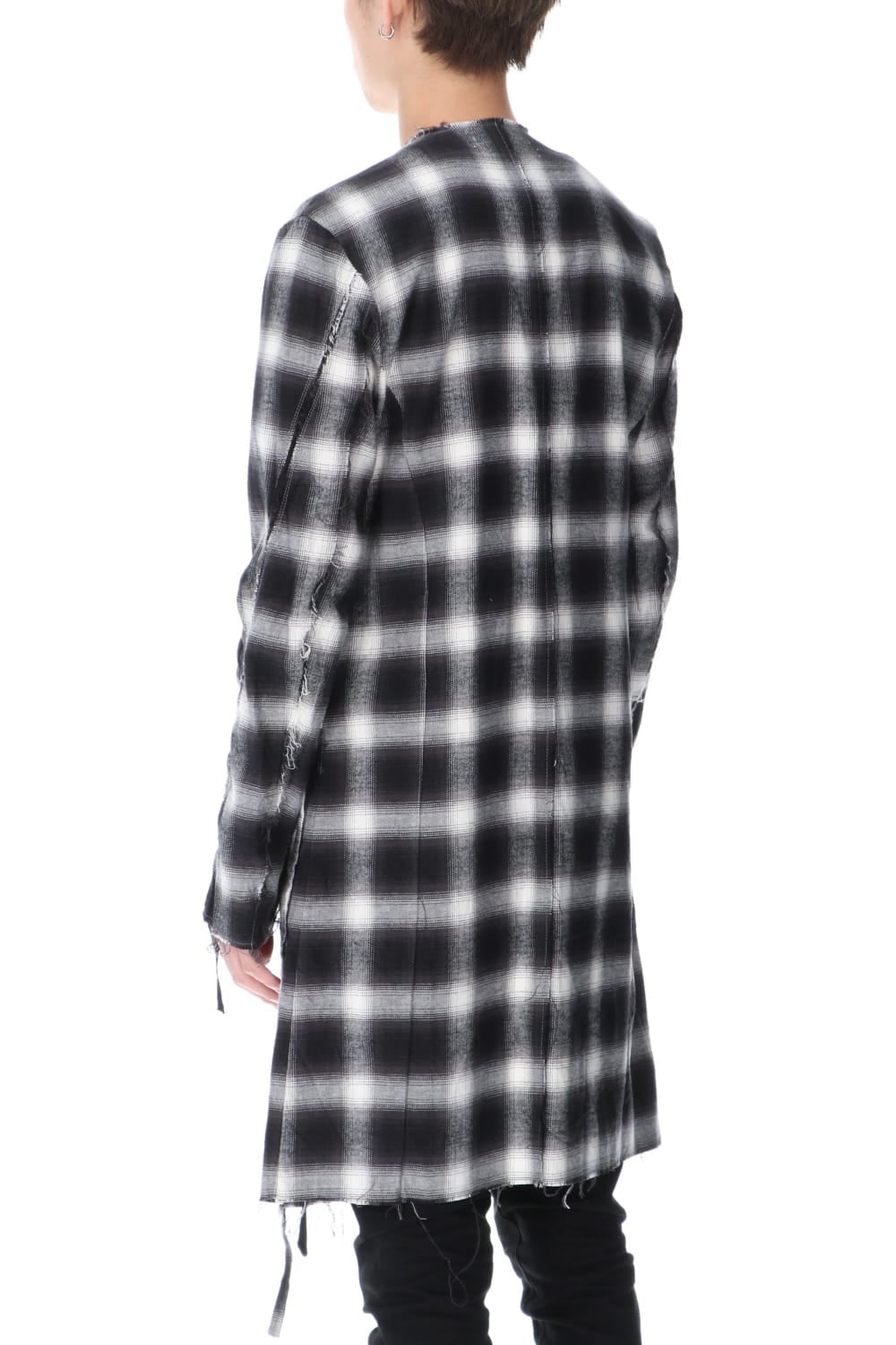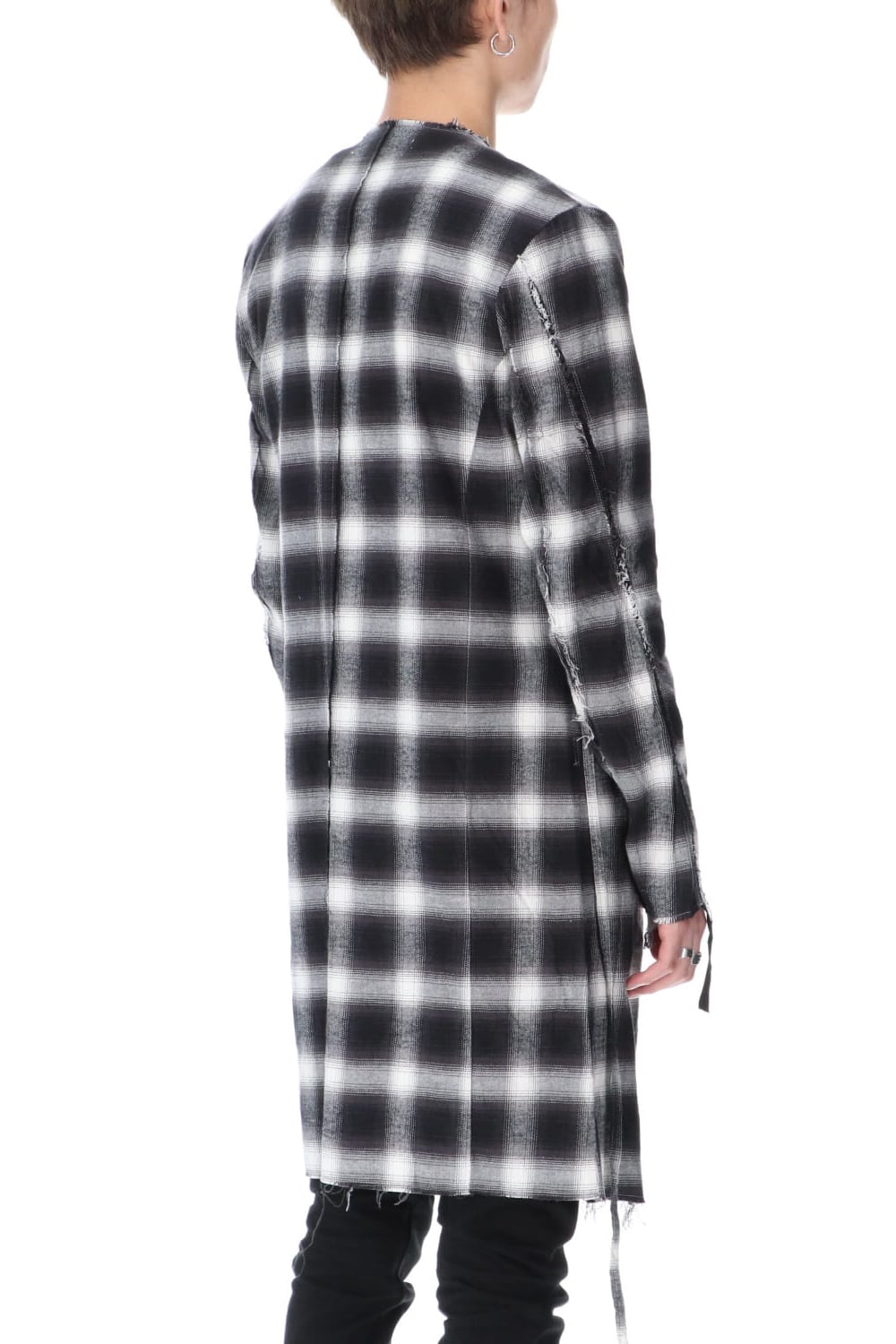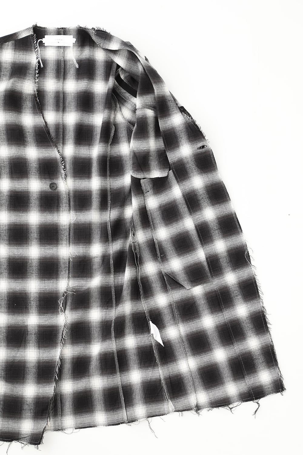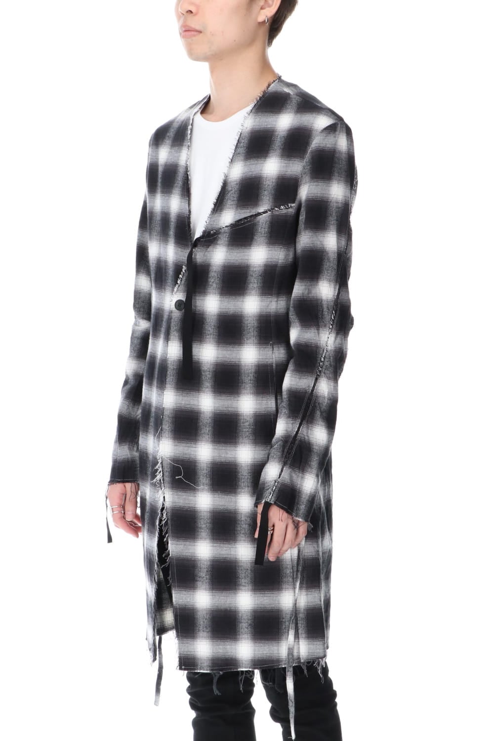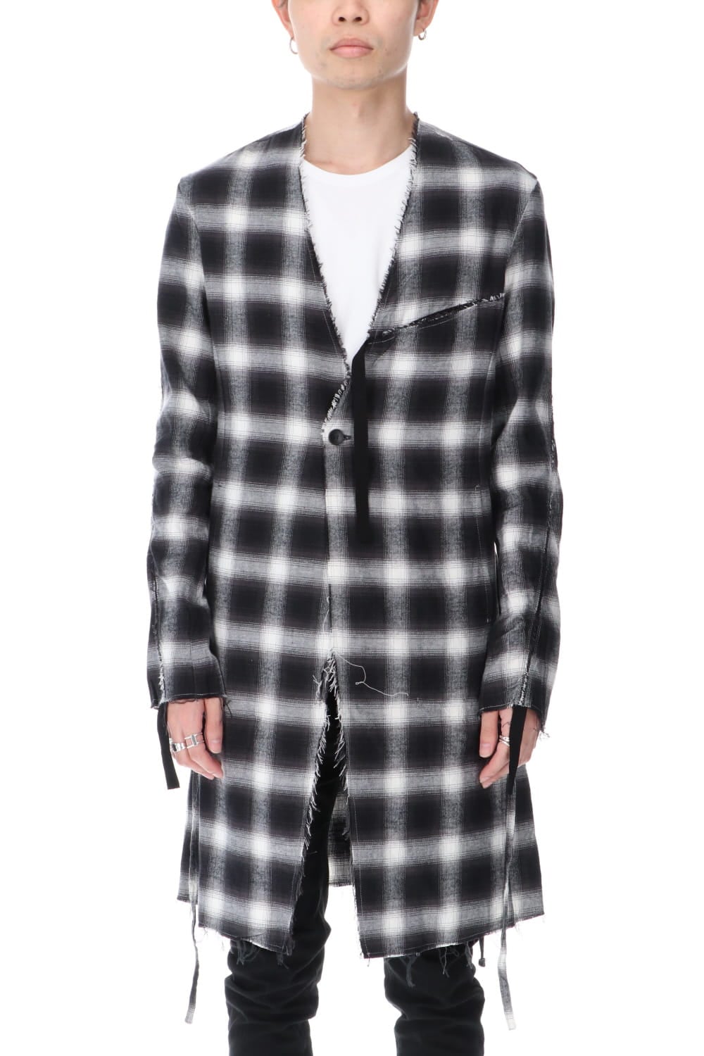 An impressive item with grosgrain tape from the shoulders to the cuffs and a ribbon hanging down to the fingertips. A string that hangs from the chest pocket is arranged so that it can be connected.