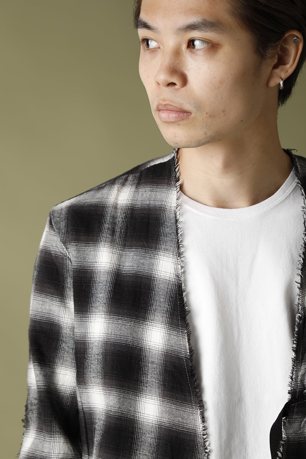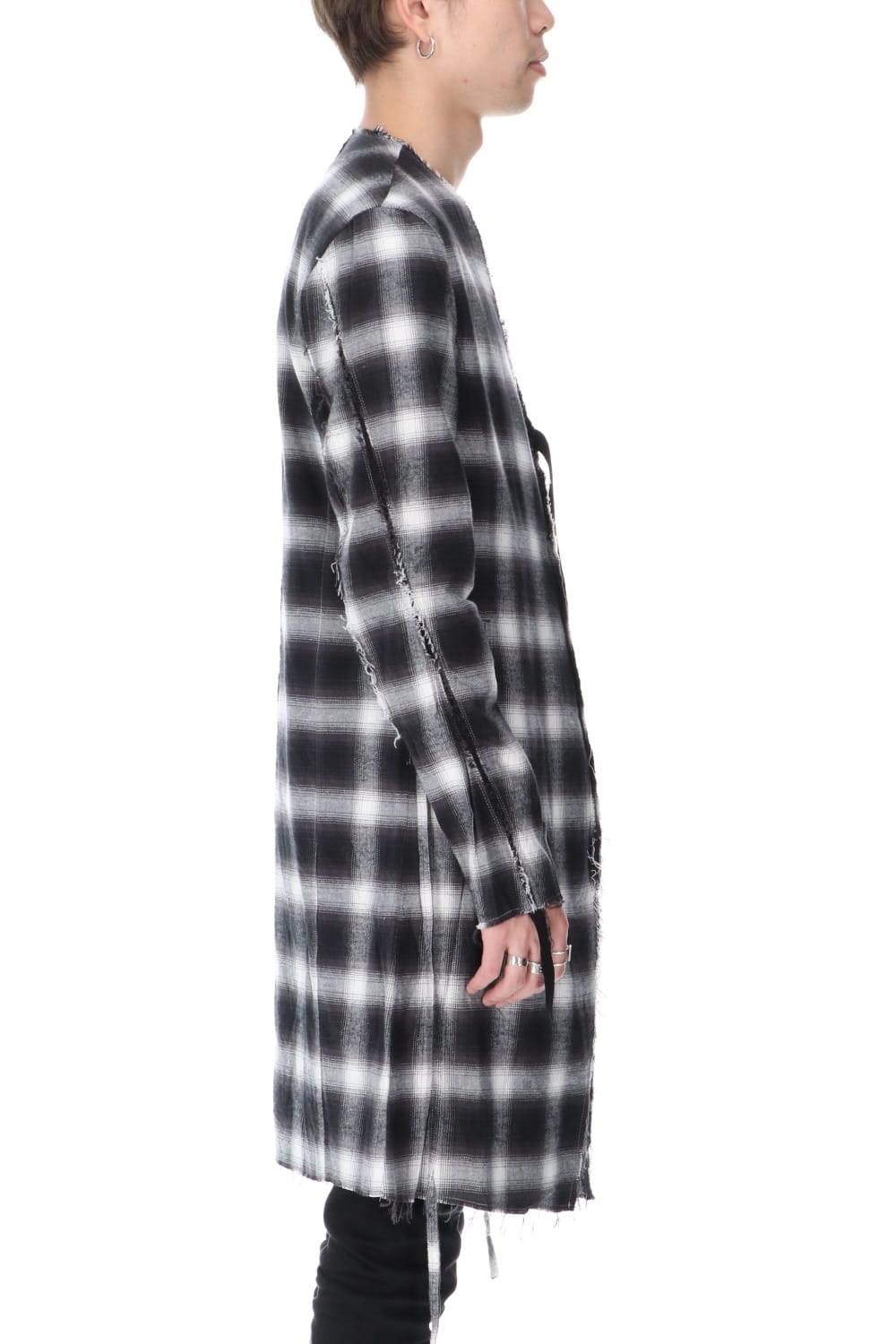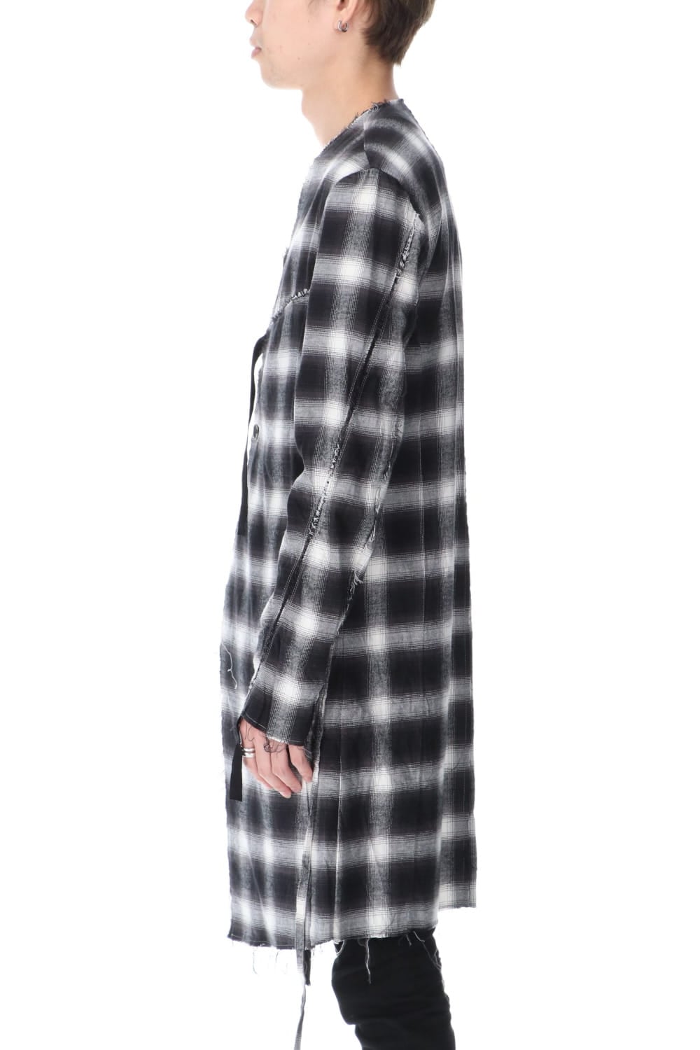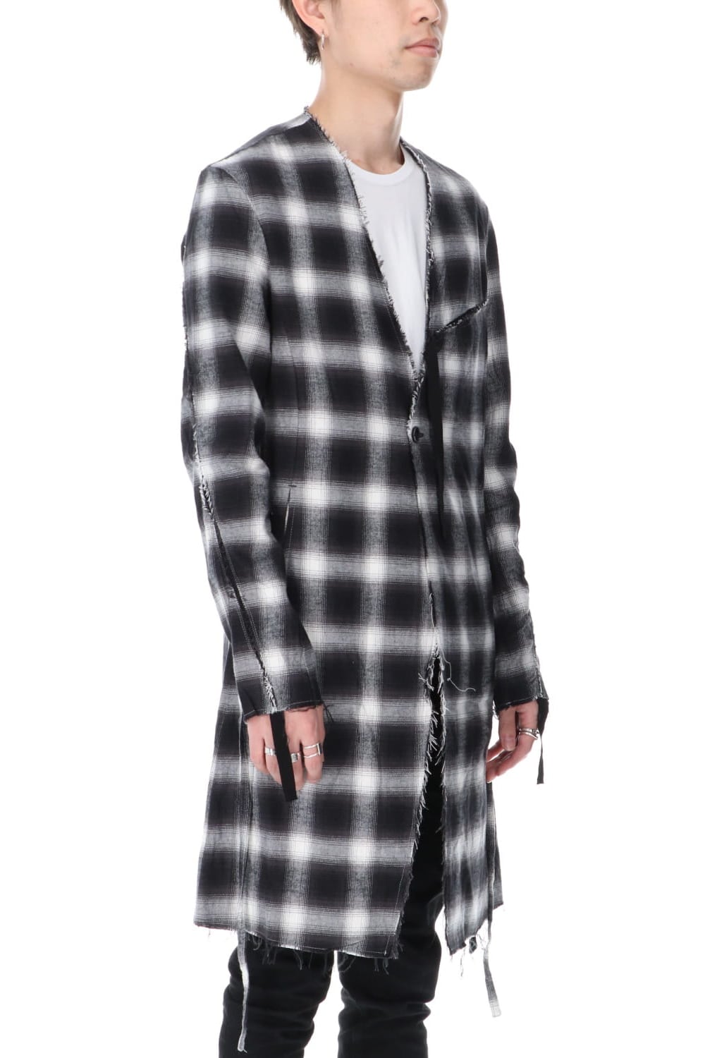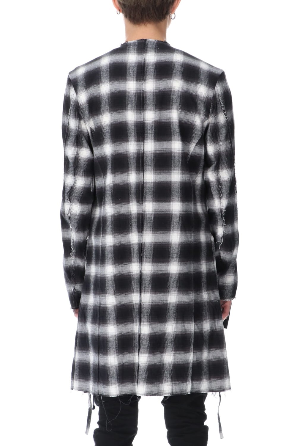 An impressive item with grosgrain tape from the shoulders to the cuffs and a ribbon hanging down to the fingertips. A string that hangs from the chest pocket is arranged so that it can be connected.