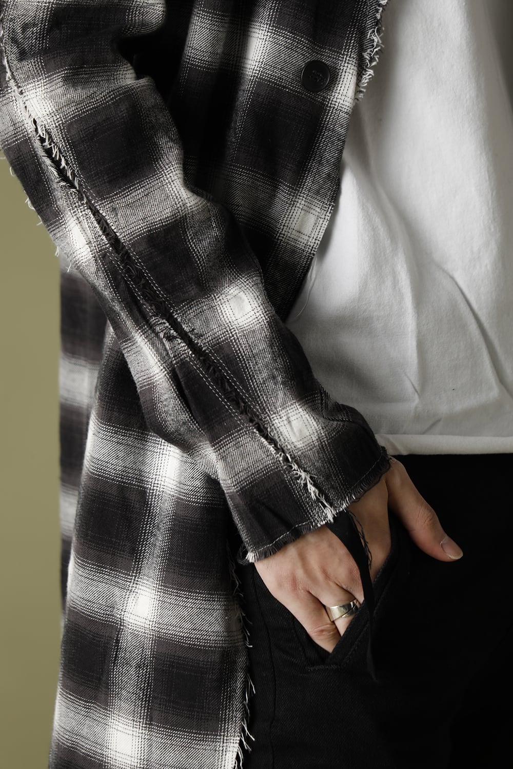 The gradation of black and white blurring brings out the unique faded look and the thread that is frayed by the cutting also emphasizes the grunge look. Every time you wash it, a buckling appears around the ribbon and the unevenness rises.