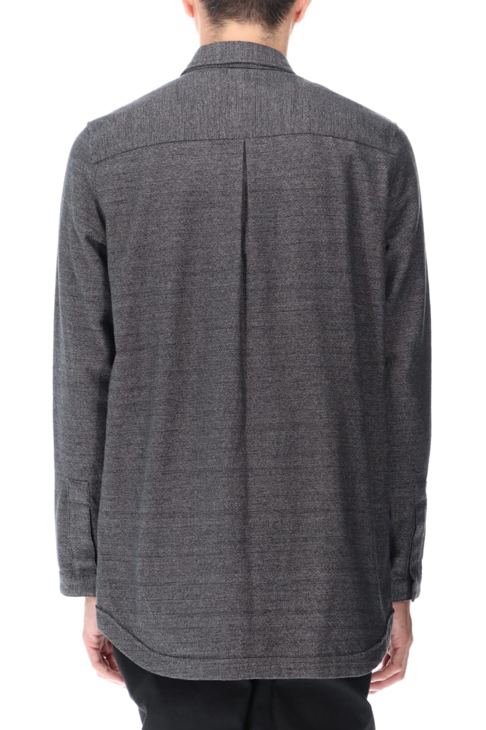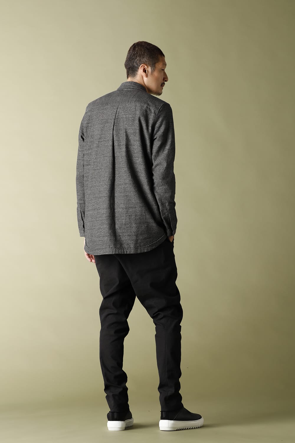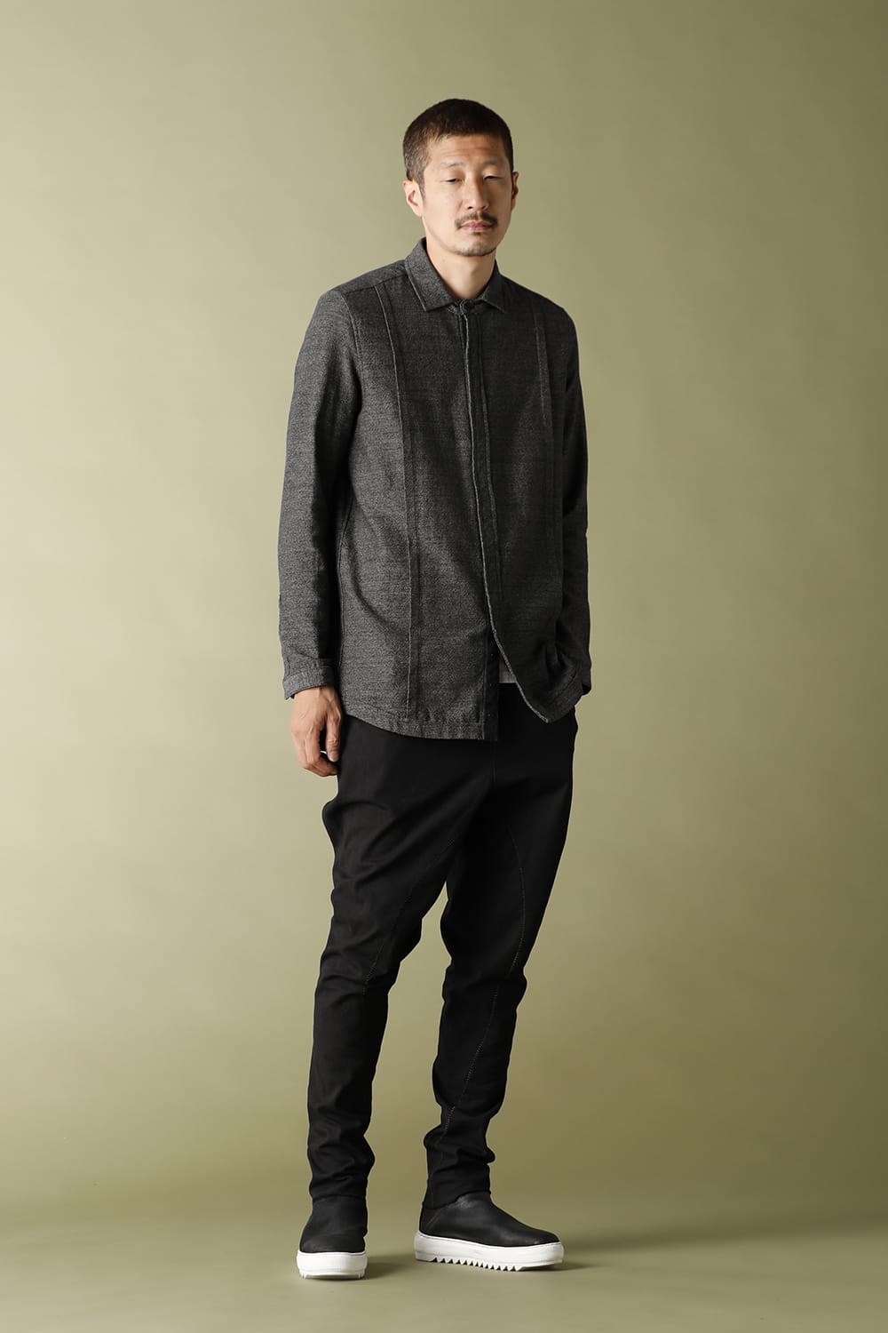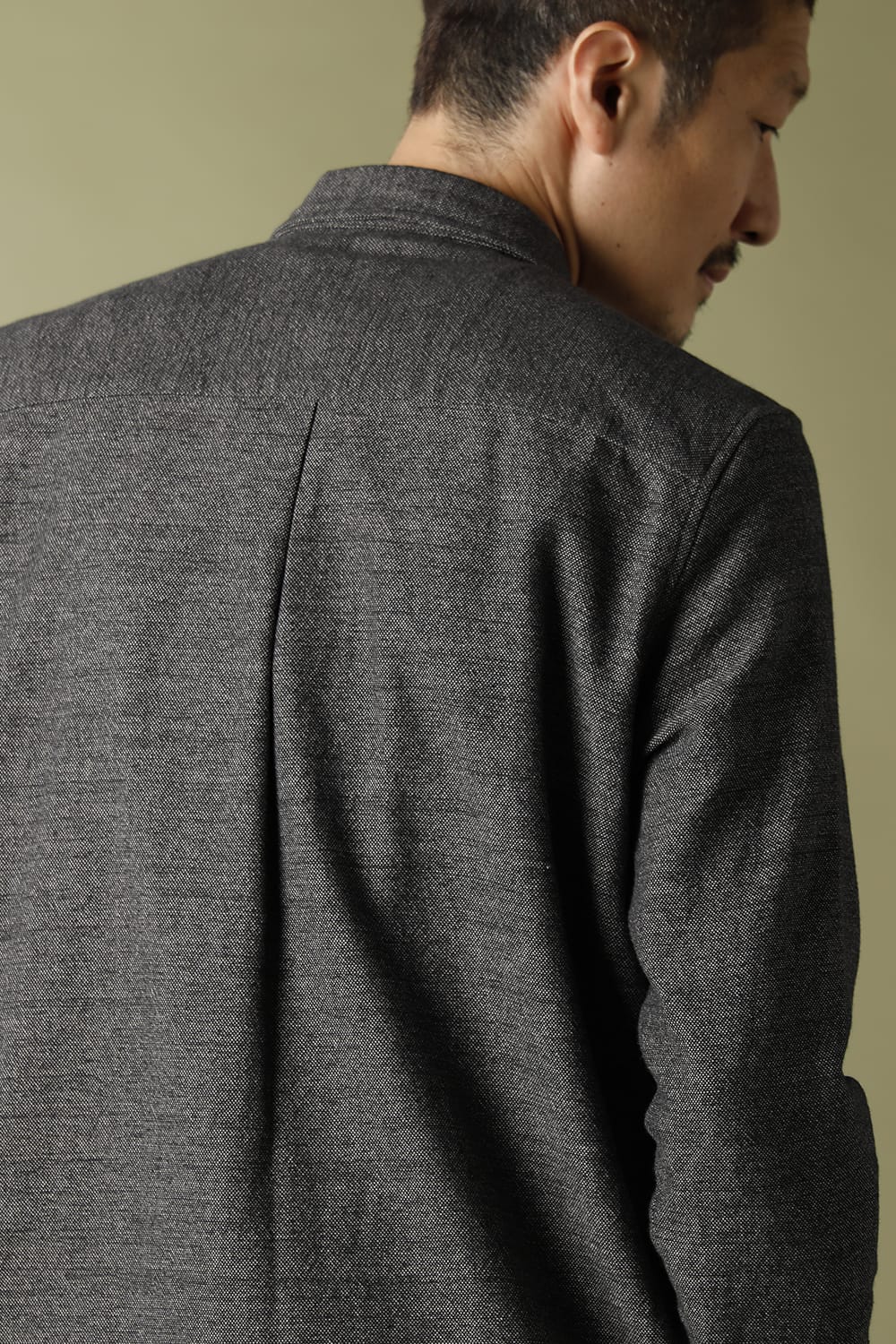 This item is made of yarn-dyed fabric from Mitsuke area in Niigata prefecture. It is characterized by the random appearance of the speck thread and the soft texture of the ox-woven fabric. With a suggestion like a shirt blouson, the front and cuffs have been changed to tape snapper specifications and in addition, side pockets have been added.