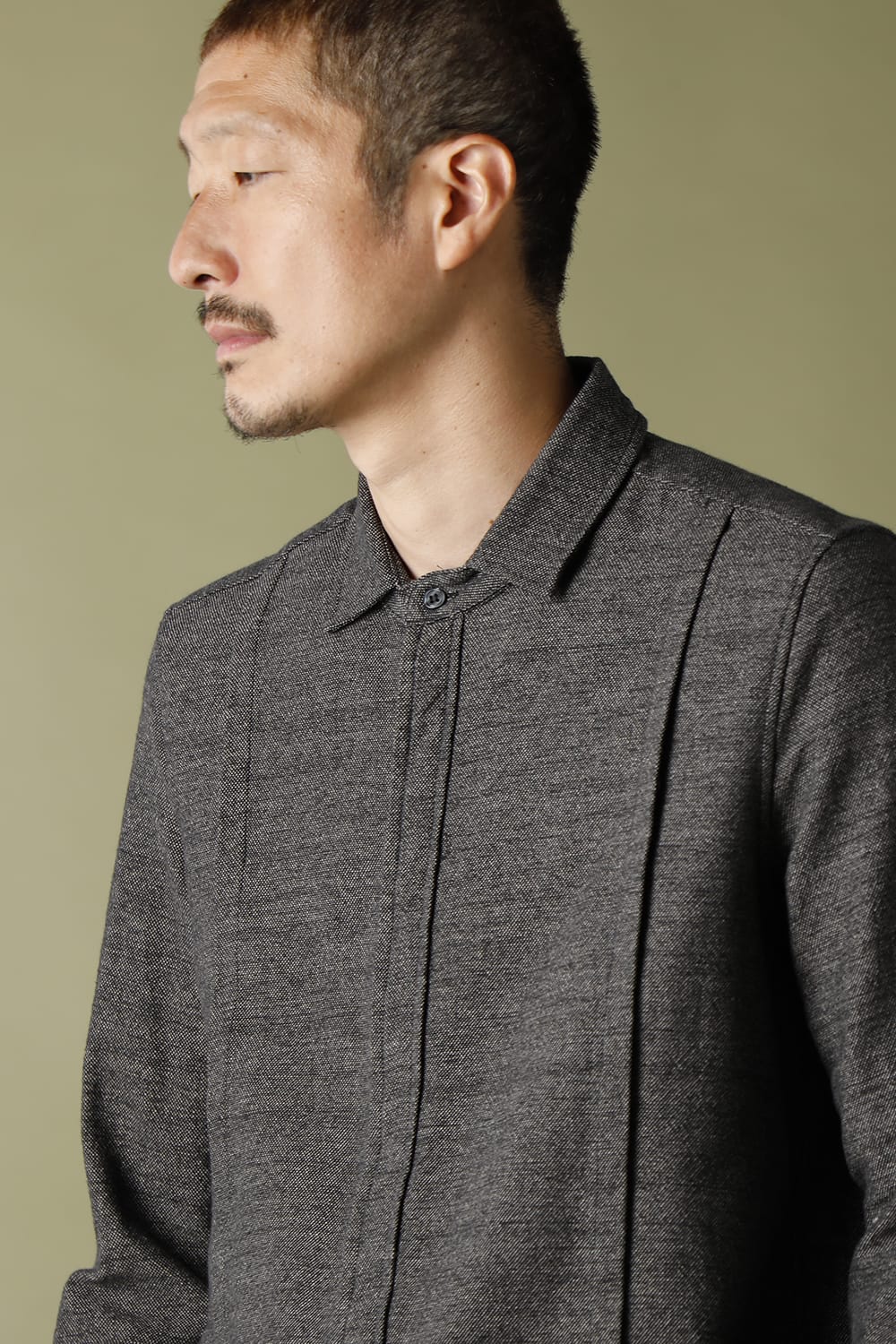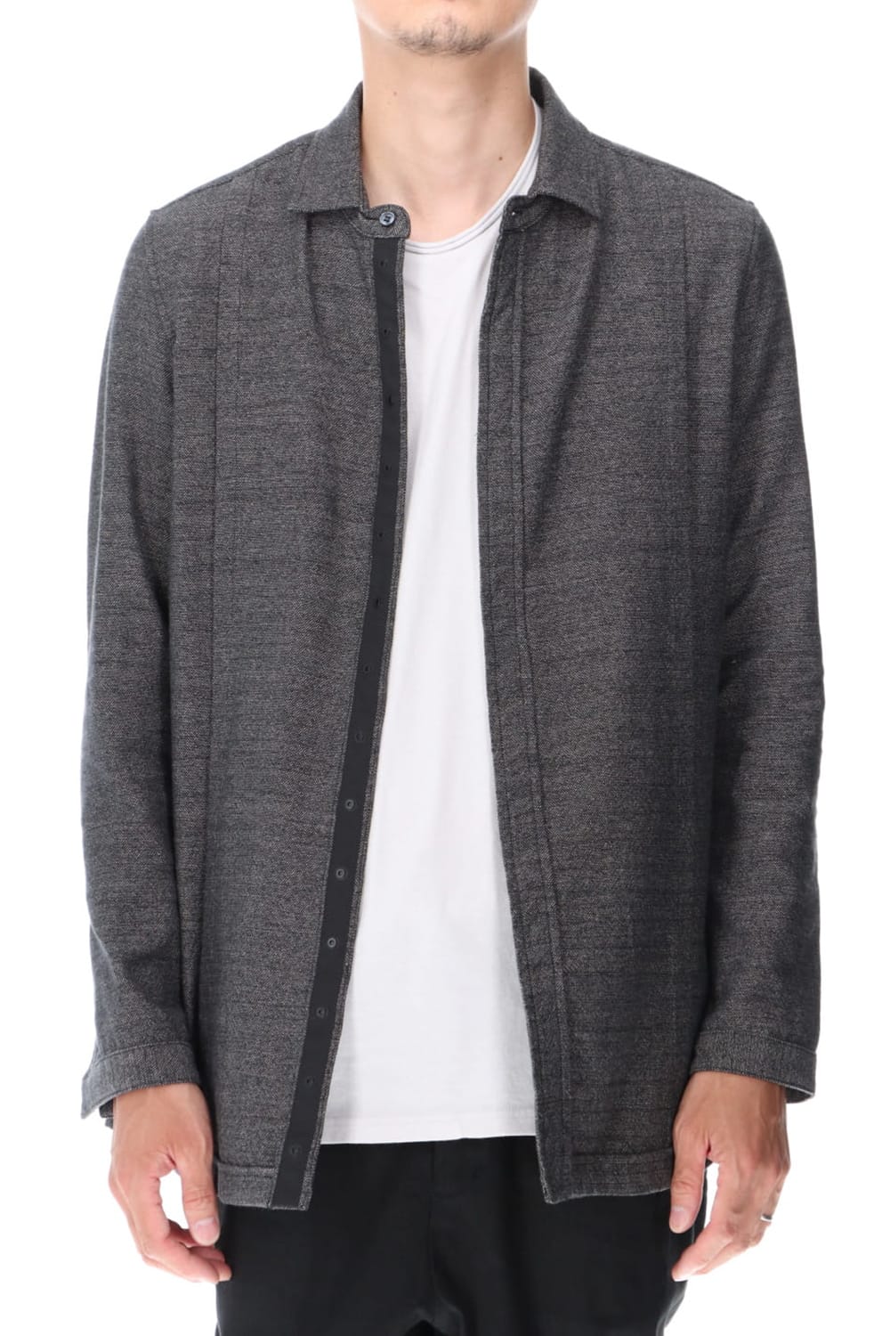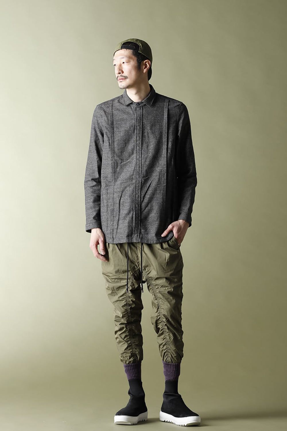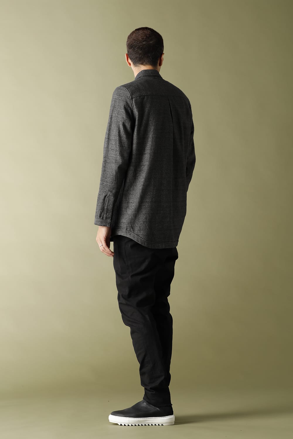 This item is made of yarn-dyed fabric from Mitsuke area in Niigata prefecture. It is characterized by the random appearance of the speck thread and the soft texture of the ox-woven fabric. With a suggestion like a shirt blouson, the front and cuffs have been changed to tape snapper specifications and in addition, side pockets have been added.