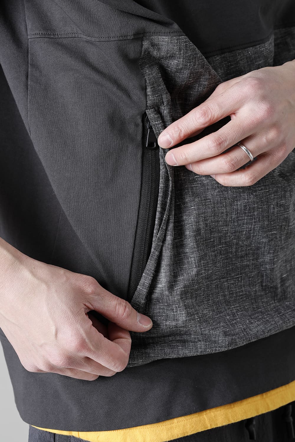 Short sleeves accented with linen SOLOTEX fabric on the pockets.
